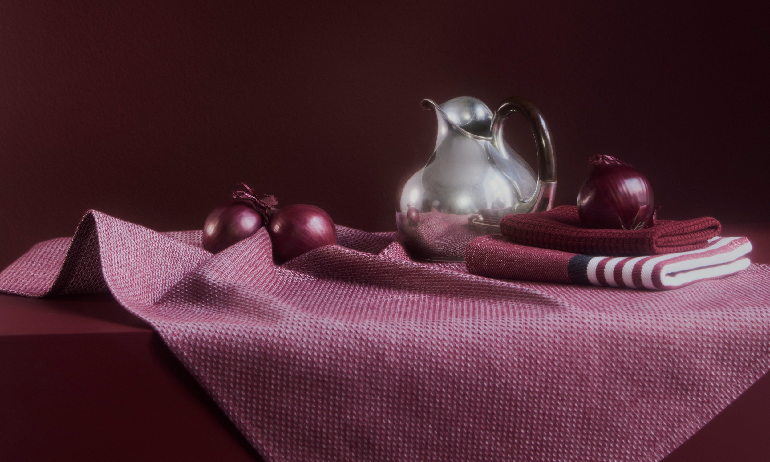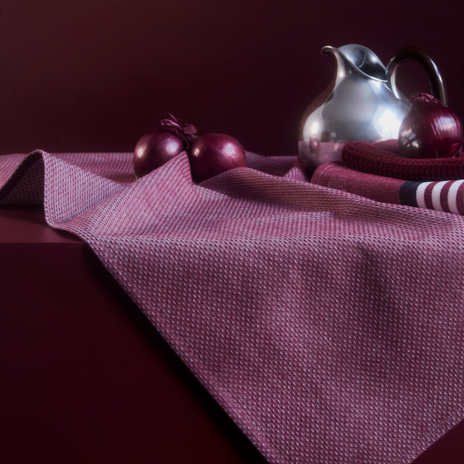 Klassiske kjøkkentekstiler i Carmine Red – en dyp og distinkt rød farge.