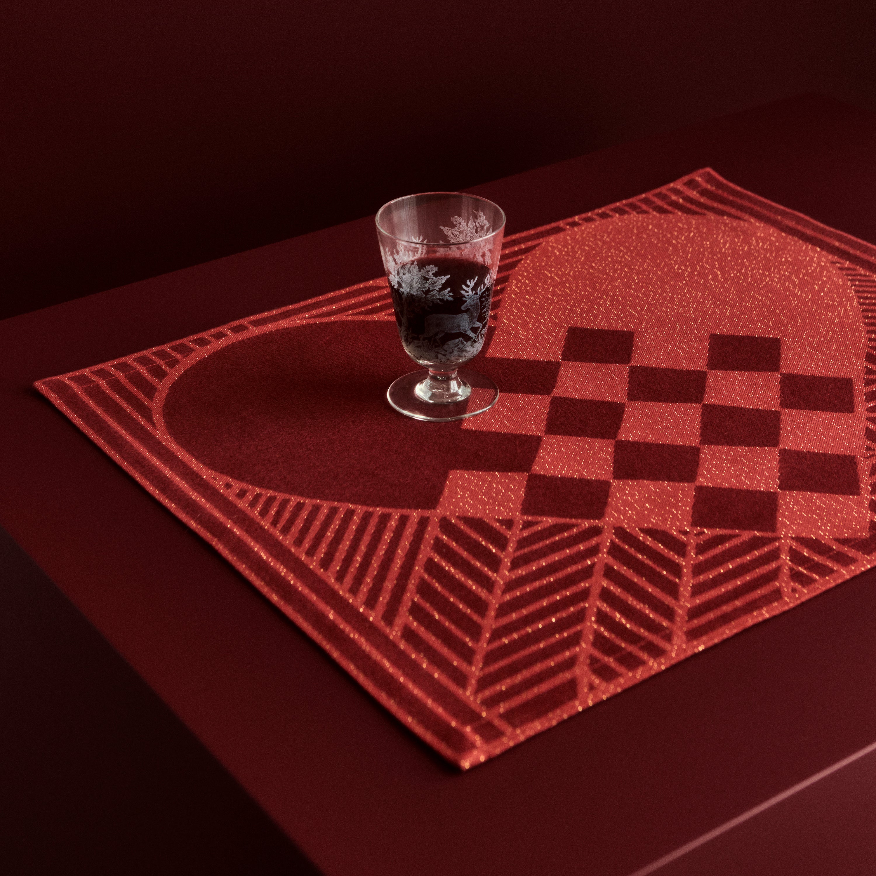 I anledning av 50-årsjubileet til julekolleksjonen har julebordbrikken fått et nytt, glitrende preg med gyldne, metalliske tråder vevd inn i den delikate mørkerøde bomullen.
