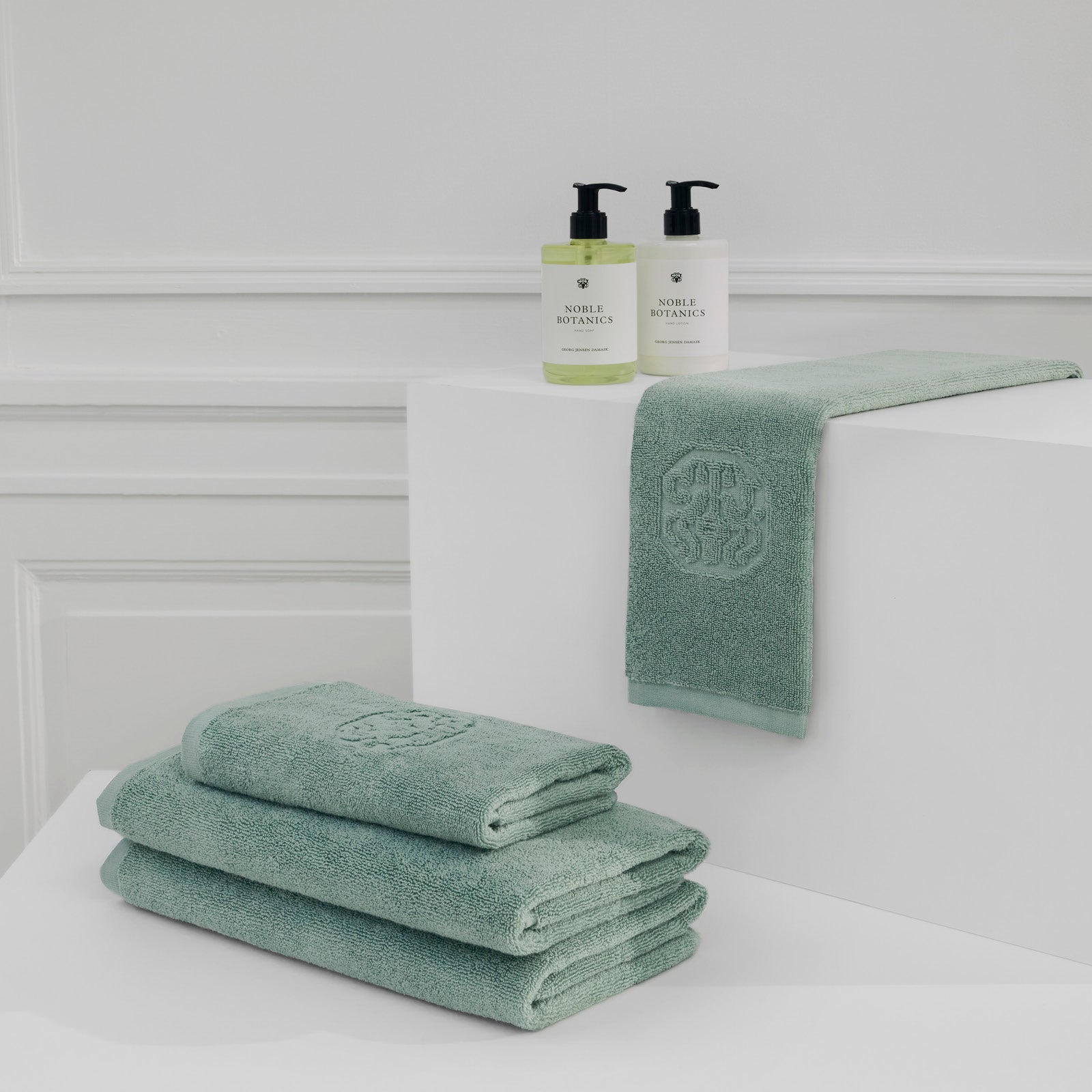 Myke og slitesterke Damask Terry-håndklær, jacquardvevd i 100 % bomull med dobbeltvundne og kammede garn.