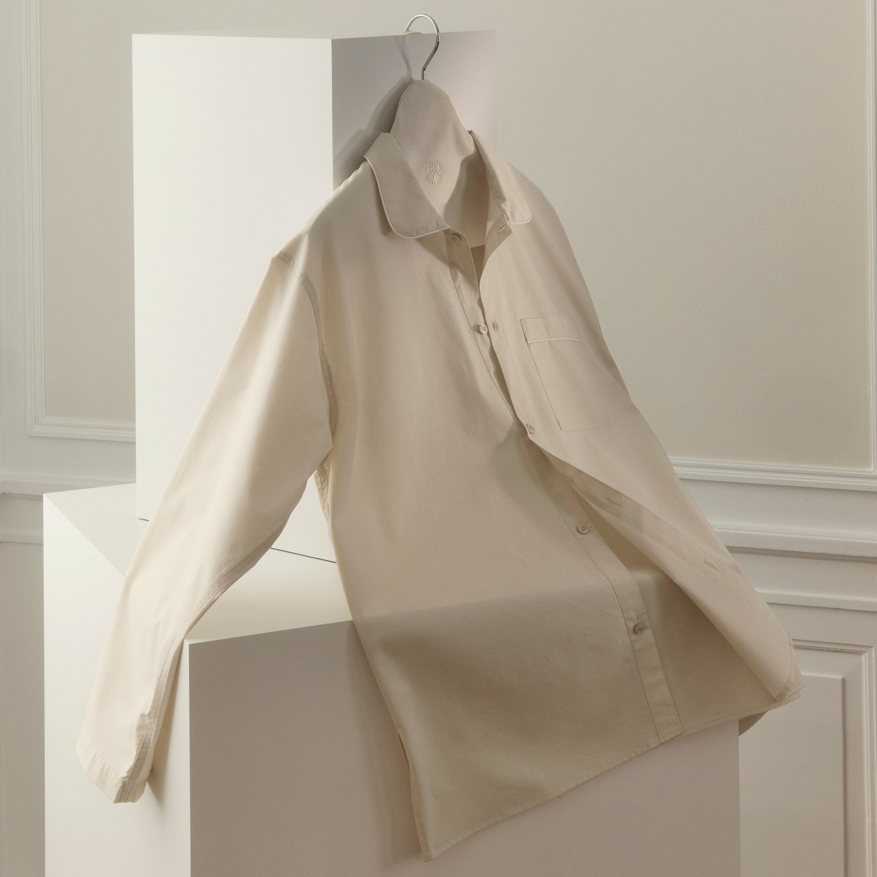 Percalevevd pyjamas med klassisk snitt og elegante detaljer, som sidesplitter, brystlomme, avrundet krage og hvite pipings.