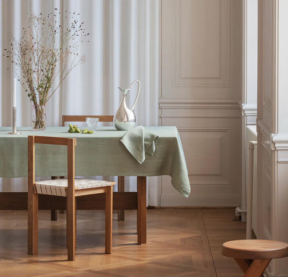 Vi kan også sy duker som passer til visse typer ovale bord. For bredder over 165 cm har vi også muligheten til å øke bredden på duken. To baner av damaskstoff tilpasses og sys diskret sammen på midten.