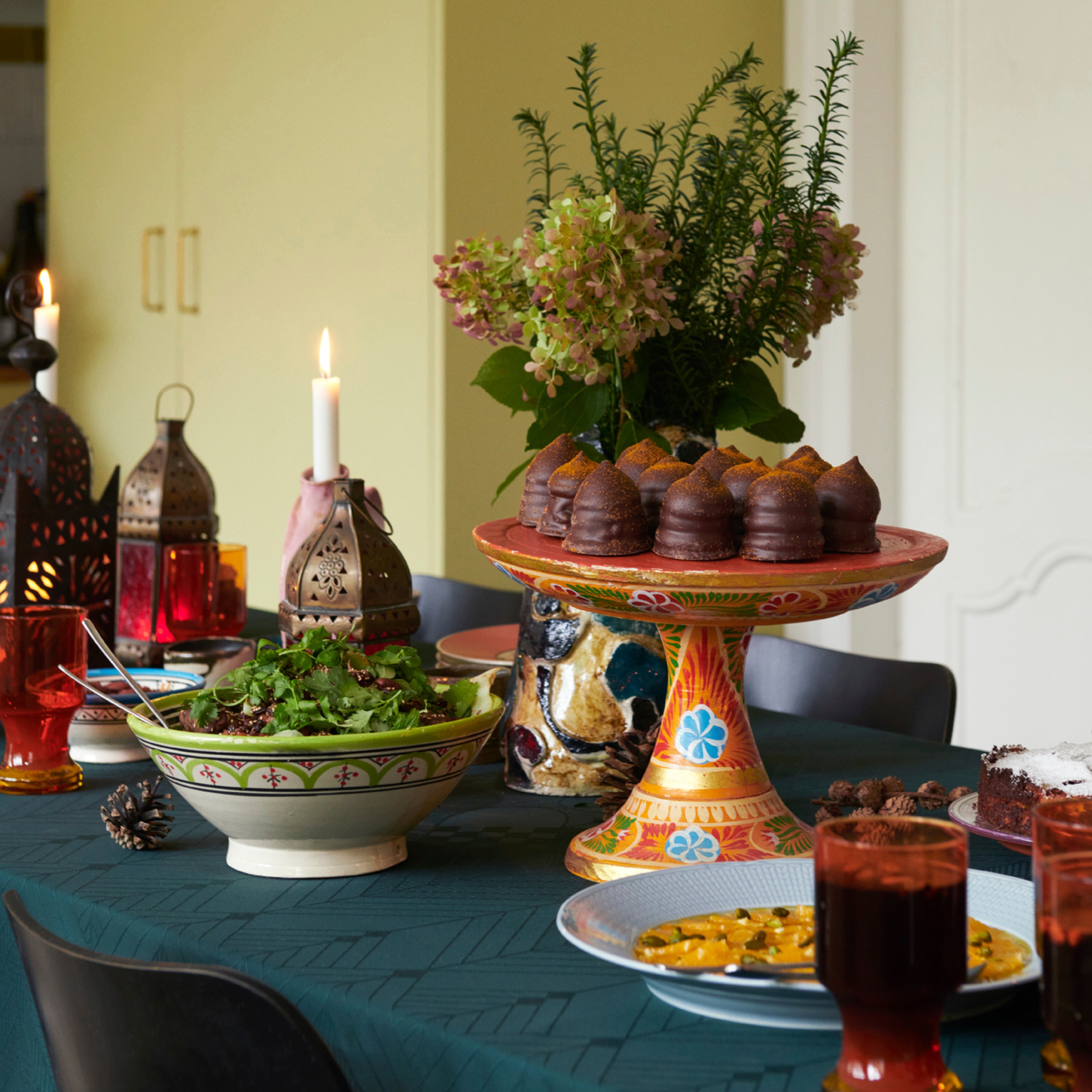 CM: På kjøkkenet får jeg vanligvis hjelp av tre-fire venner, slik at vi kan servere mat til alle gjestene. Juleevangeliet finner sted i Betlehem og det er jo derfor maten har sitt opphav i Midtøsten. I mange år har jeg laget en dhal og en krydret marokkansk rett med langtidsstekt kjøtt. Det er alltid ulike salater med granateple, appelsin, tahinidressing og andre klassiske ingredienser fra Midtøsten. Dette serverer vi med tradisjonelle danske julekaker og konfekt.