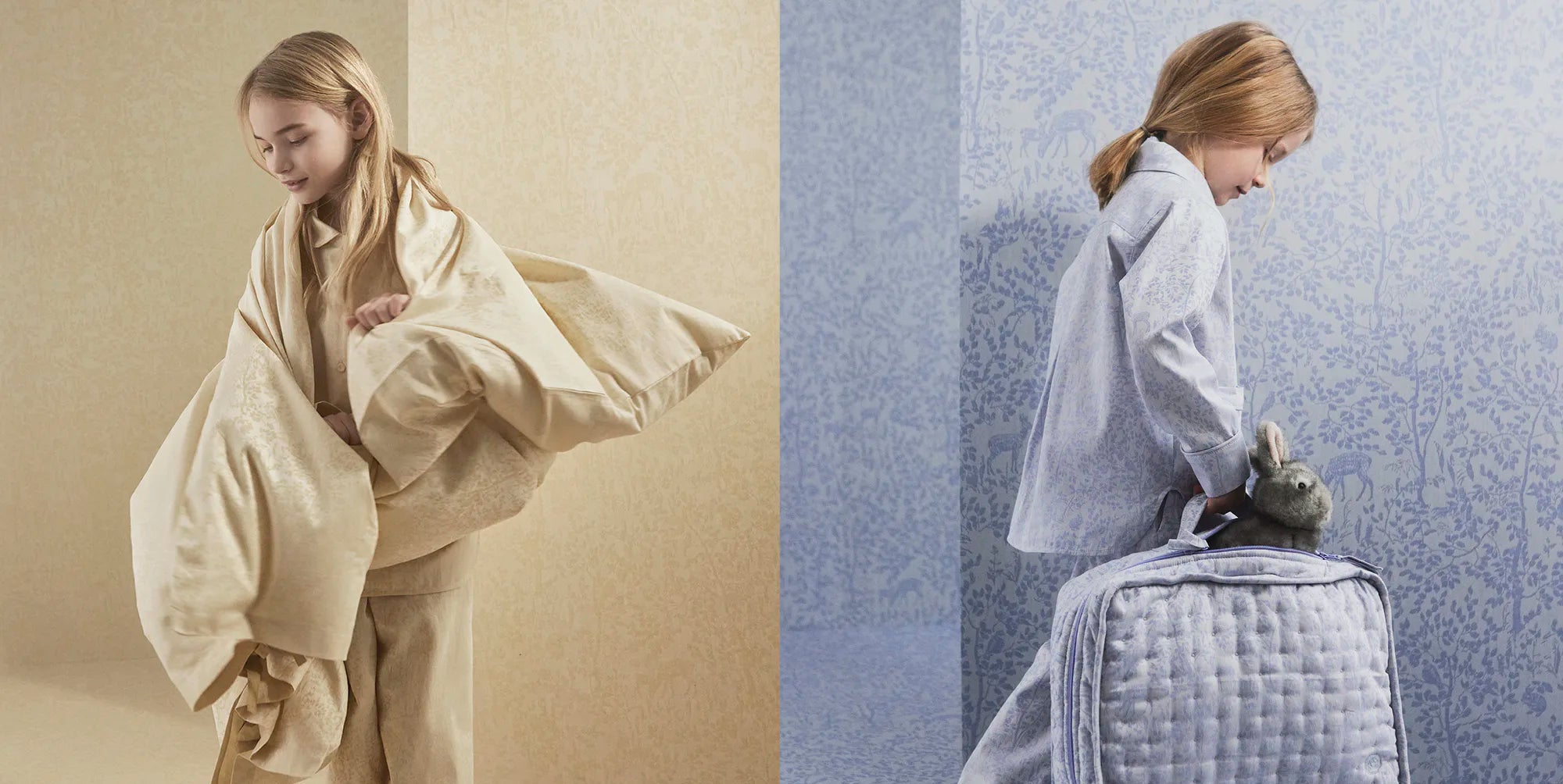 La barna være i en skog av eventyr. Georg Jensen Damasks Forest-serie har et elegant jacquardvevd motiv av dådyr, kaniner og fugler som boltrer seg blant nyutsprungne trær. En verden som er spesielt egnet for barn. I kolleksjonen finner du nattøy, sengetøy, babyteppe og koffert til de minste.