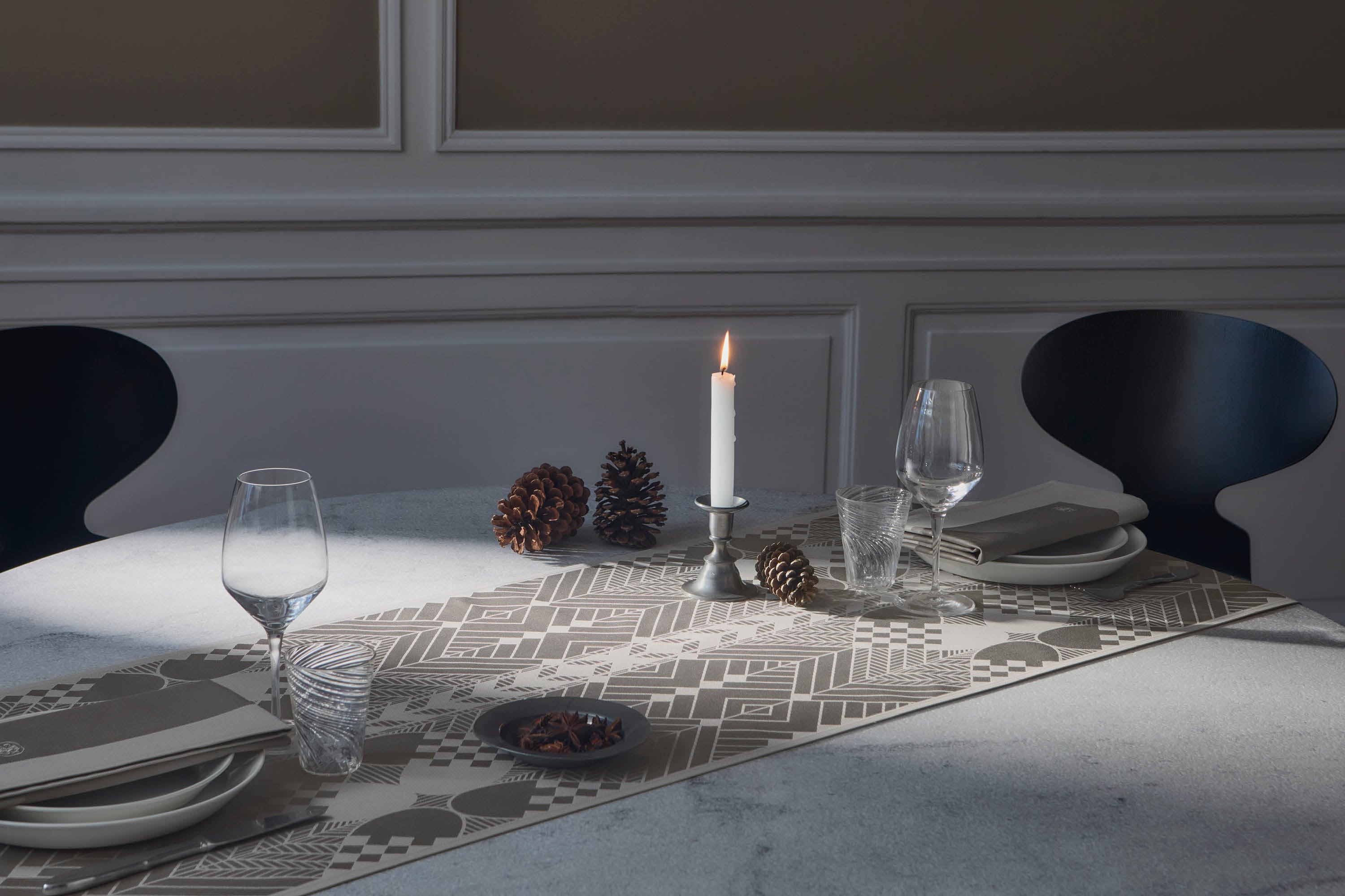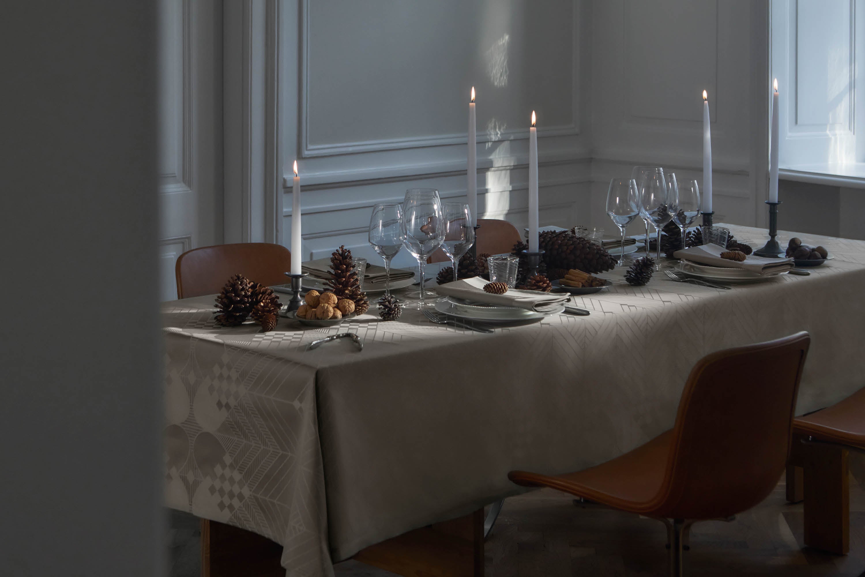 Juledesignet i den nye fargen kommer som duk, bordløper og spisebrikke, og den enkle Damask-servietten med brodert logo fås også i Hazel Wood. Dermed kan du dekke opp til både store og små anledninger i den søte juletid.