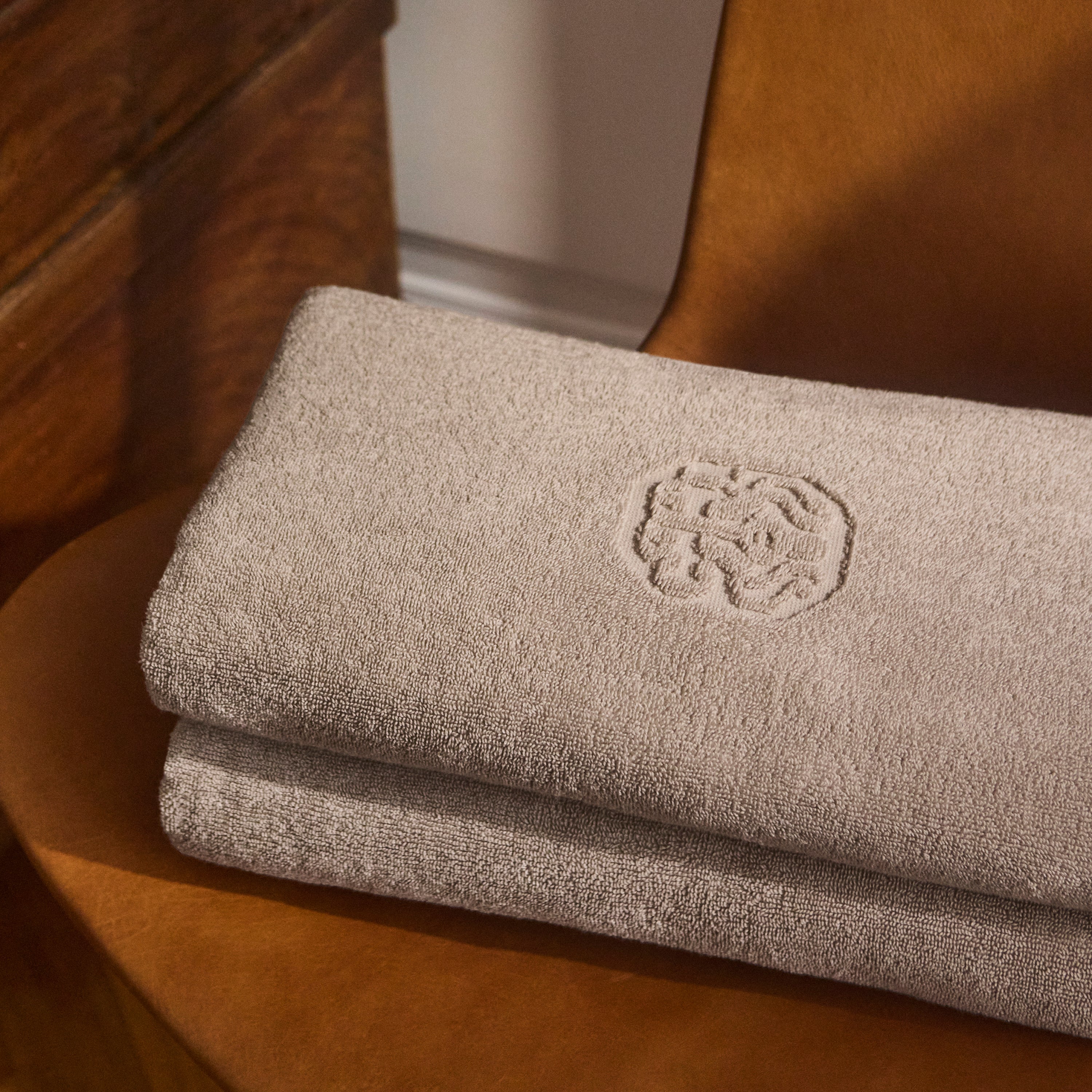 Damask Terry håndklæder vævet i 100 % bomuld. Damask Terry har et helt enkelt udtryk med Georg Jensen Damasks ikoniske logo indvævet som elegant detalje. Farven Cashmere er en diskret brun nuance af grå.
