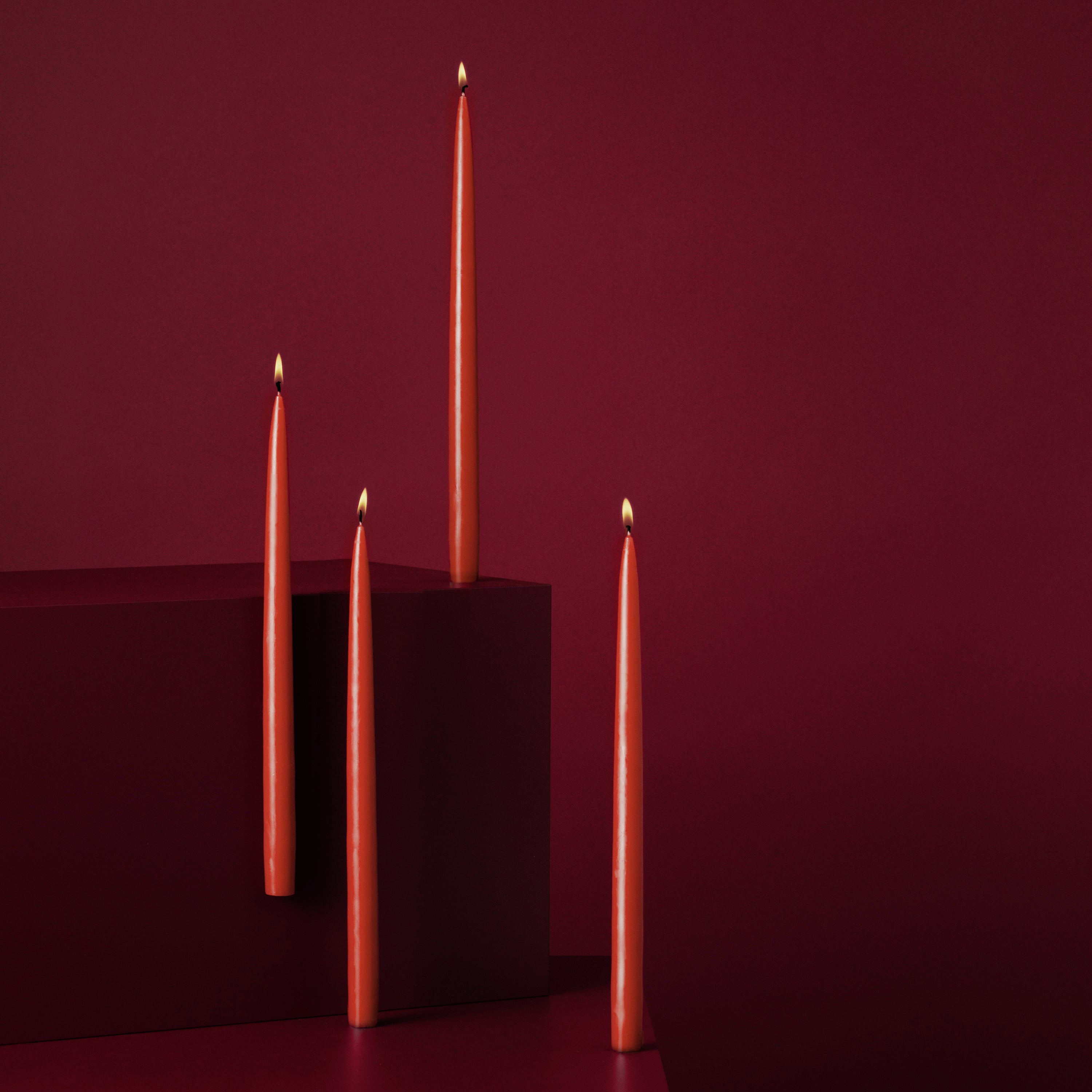 Hånddyppede stearinlys i smukke farver. Lysene er gennemfarvede og fremstillet i 100 % fuldraffineret paraffin af bedste kvalitet. Hvert lys måler 35 cm og har en brændetid på 15 timer.