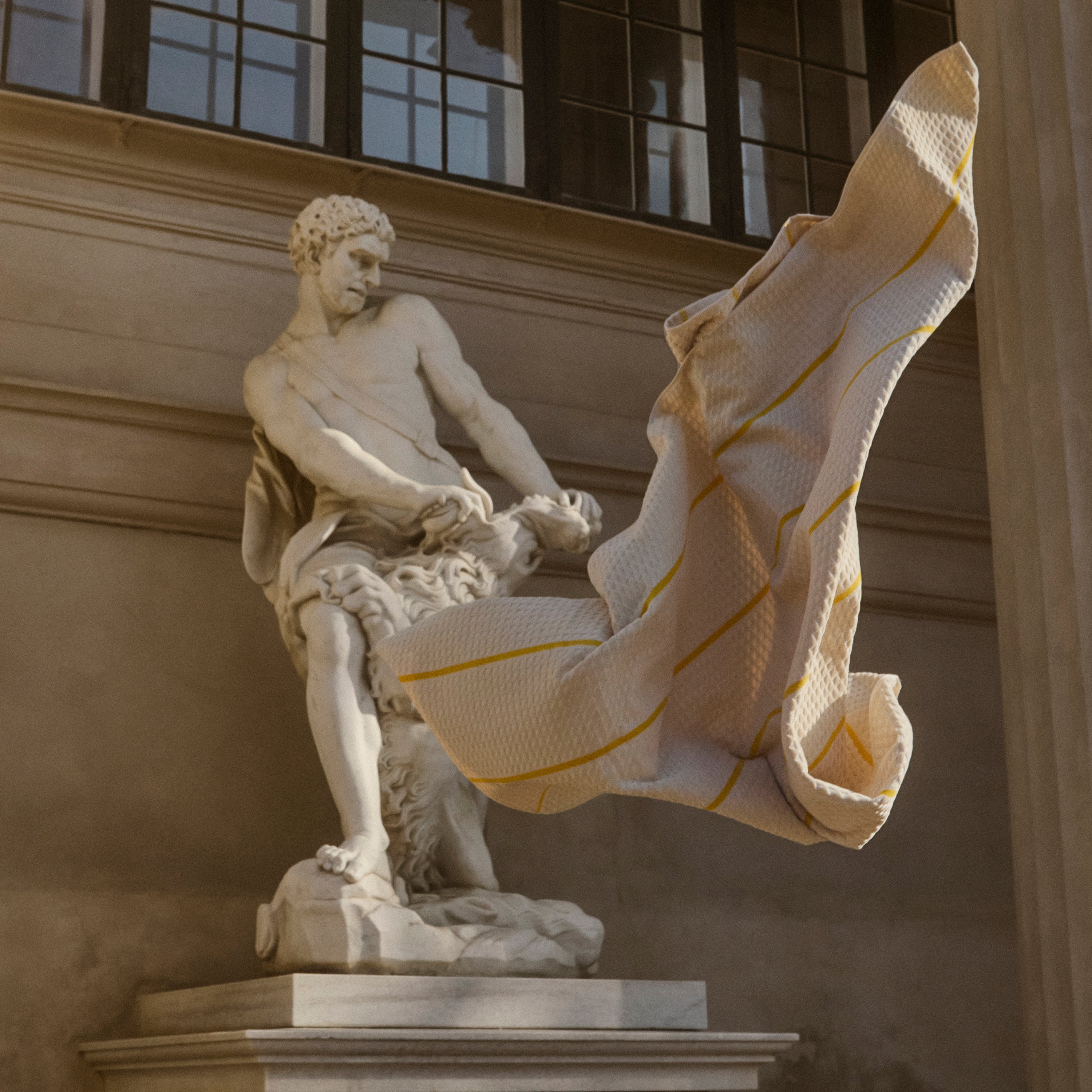 Med Facet udnyttede Jette Nevers jacqardvævningen til at skabe et elegant skyggespil i mønsterets sammenhængende trekanter. I Special Edition strandhåndklædet og clutchen fremhæves den smukke geometri i blød velourfrotté med lodrette delinger af solsikkegule striber.