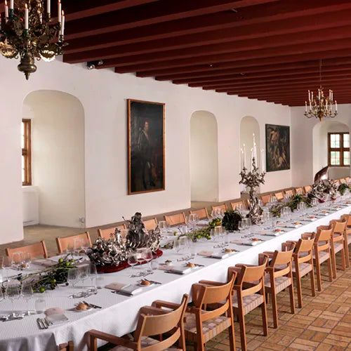 Billede 5: I anledning af, at H.M. Dronning Margrethe i 2023 kunne fejre titlen som længst siddende, regerende monark i Danmarkshistorien, blev der afholdt en middag i Riddersalen på Koldinghus. Dugen valgt til arrangementet, var damaskdugen Snefnug. Foto: Keld Navntoft.