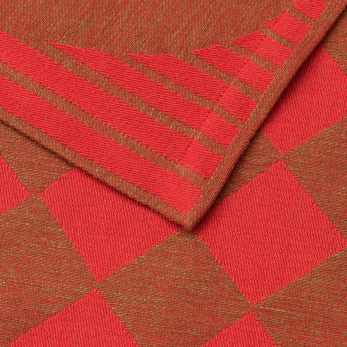 Christmas Rustic-dækkeserviettens nostalgiske motiv med fine, flettede julehjerter og stiliserede grankviste er designet af tekstilkunstner Bodil Bødtker-Næss. Motivet er blevet et signaturdesign i Georg Jensen Damasks kollektionen. Archive Red er en af de originale farver fra 1975. Den helt klassiske farvekombination i rød og guld.