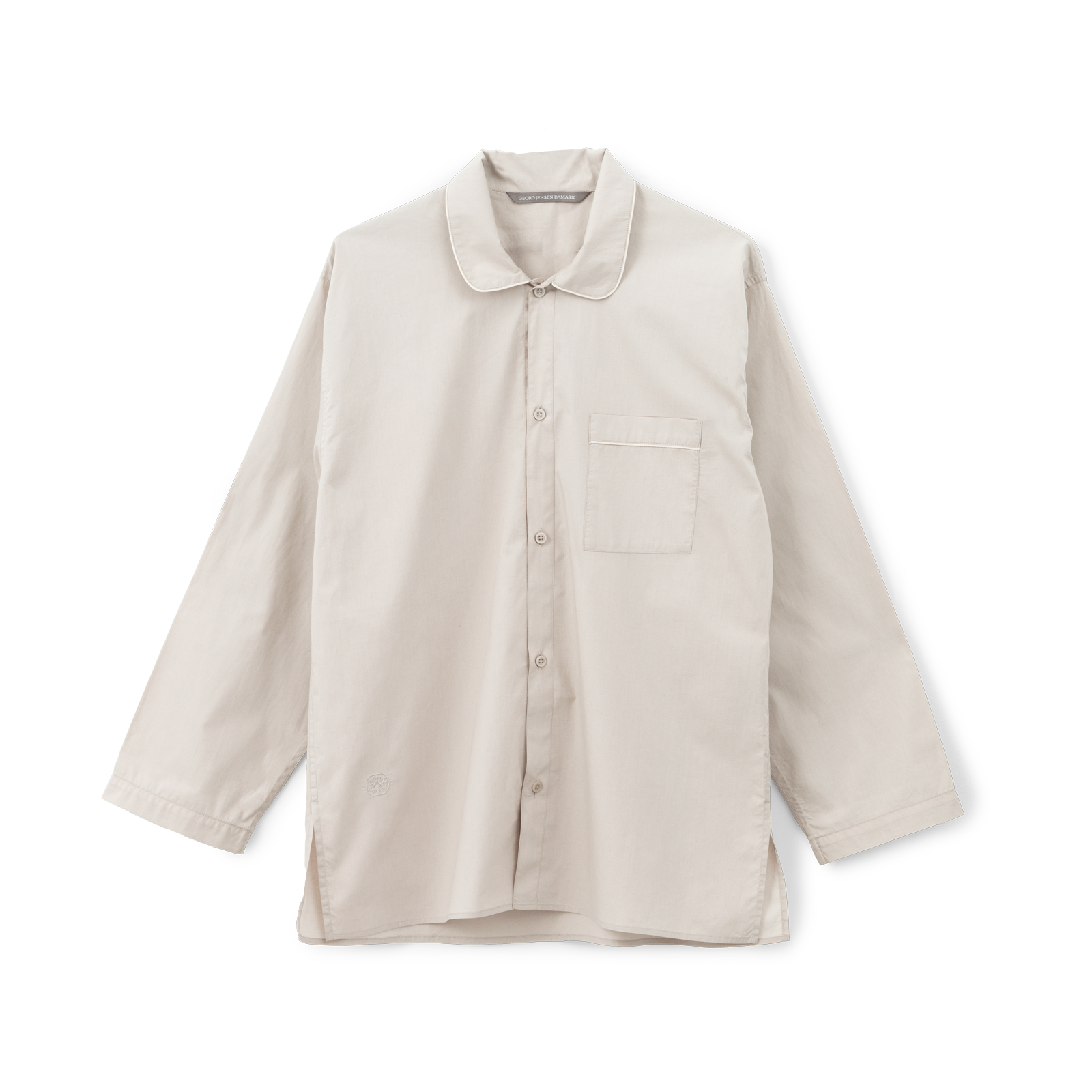 Unisex pyjamassen har tone i tone-knapper og broderet logo på både skjorte og bukser. Bukserne har en bred og behagelig elastik i taljen, lommer og snørelukning. Skjorten har sideslidser, brystlomme og afrundet krave. Ærmelængden kan let tilpasses med et opsmøg, hvor indersiden af ærmet har en elegant piping.