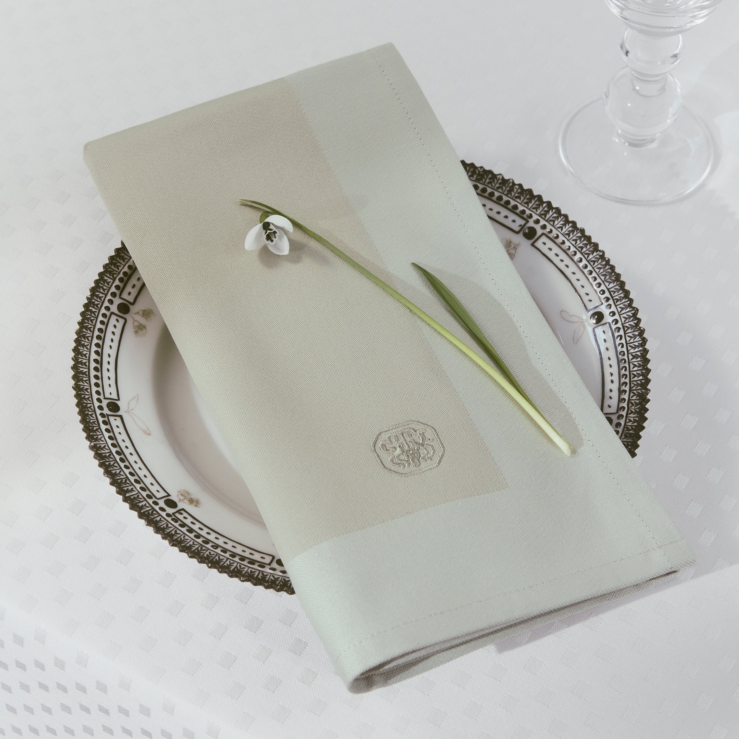 Den klassiske damaskvævede serviet er en smuk tilføjelse til borddækningen. Med sit enkle design og tidløse udtryk passer den til alle anledninger. Servietten er vævet af 100 % bomuld og har et smukt broderet logo.