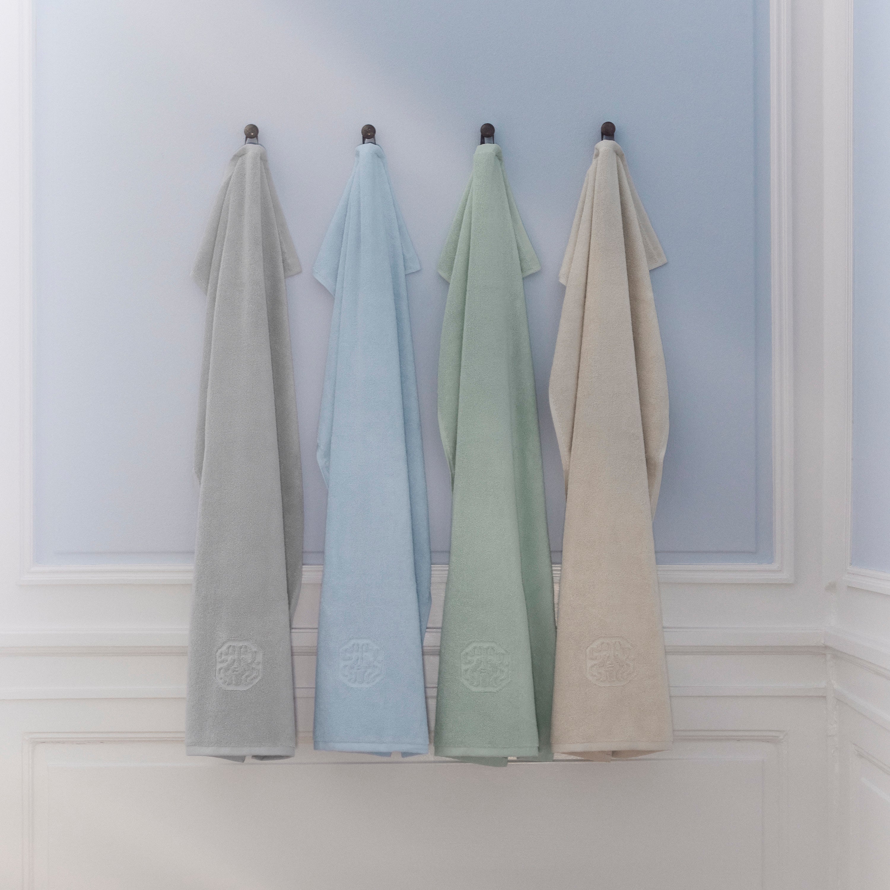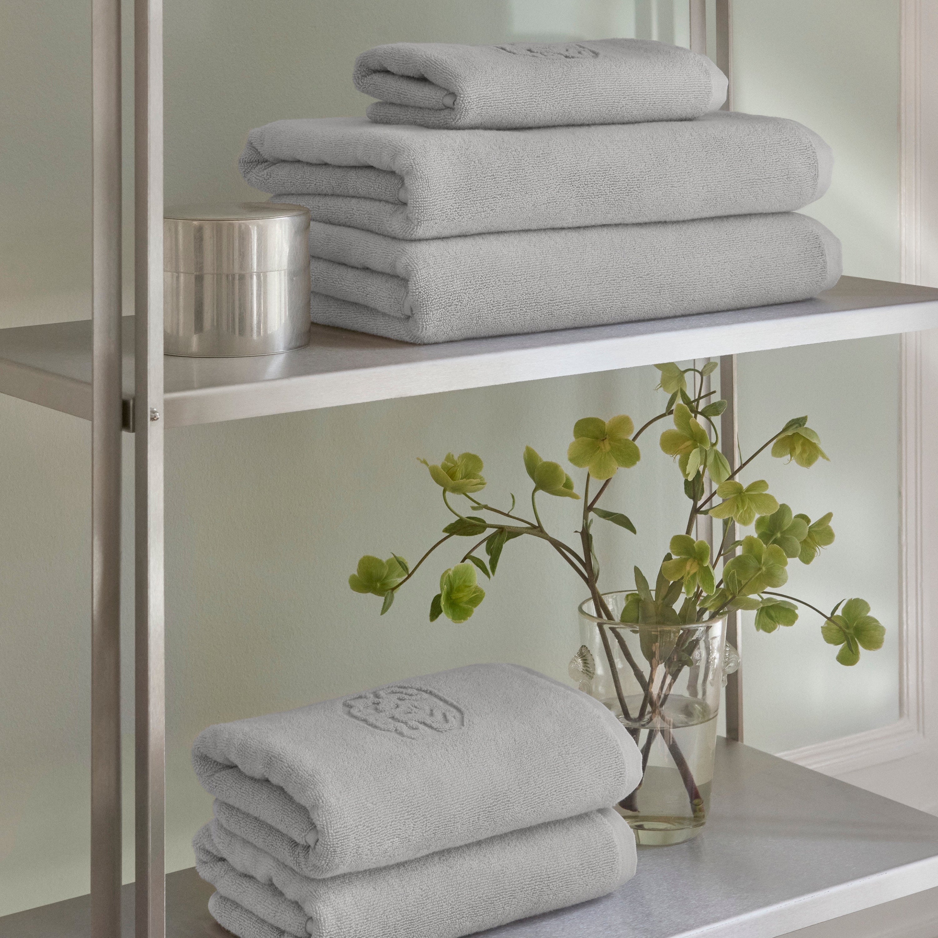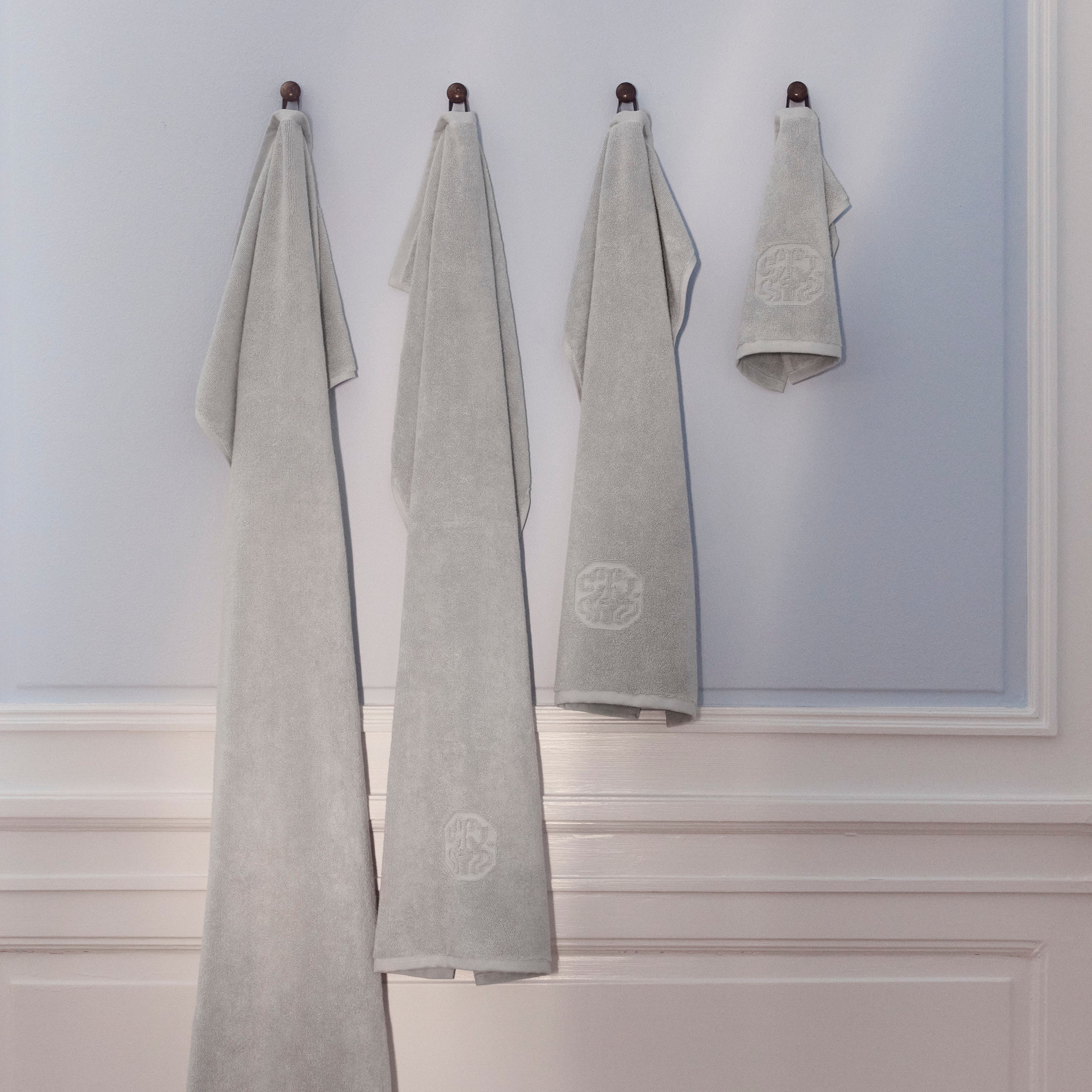 Damask Terry badehåndklædet har et enkelt udtryk med Georg Jensen Damasks ikoniske logo indvævet som elegant detalje. Platinium Grey er en lys og rolig nuance af grå.