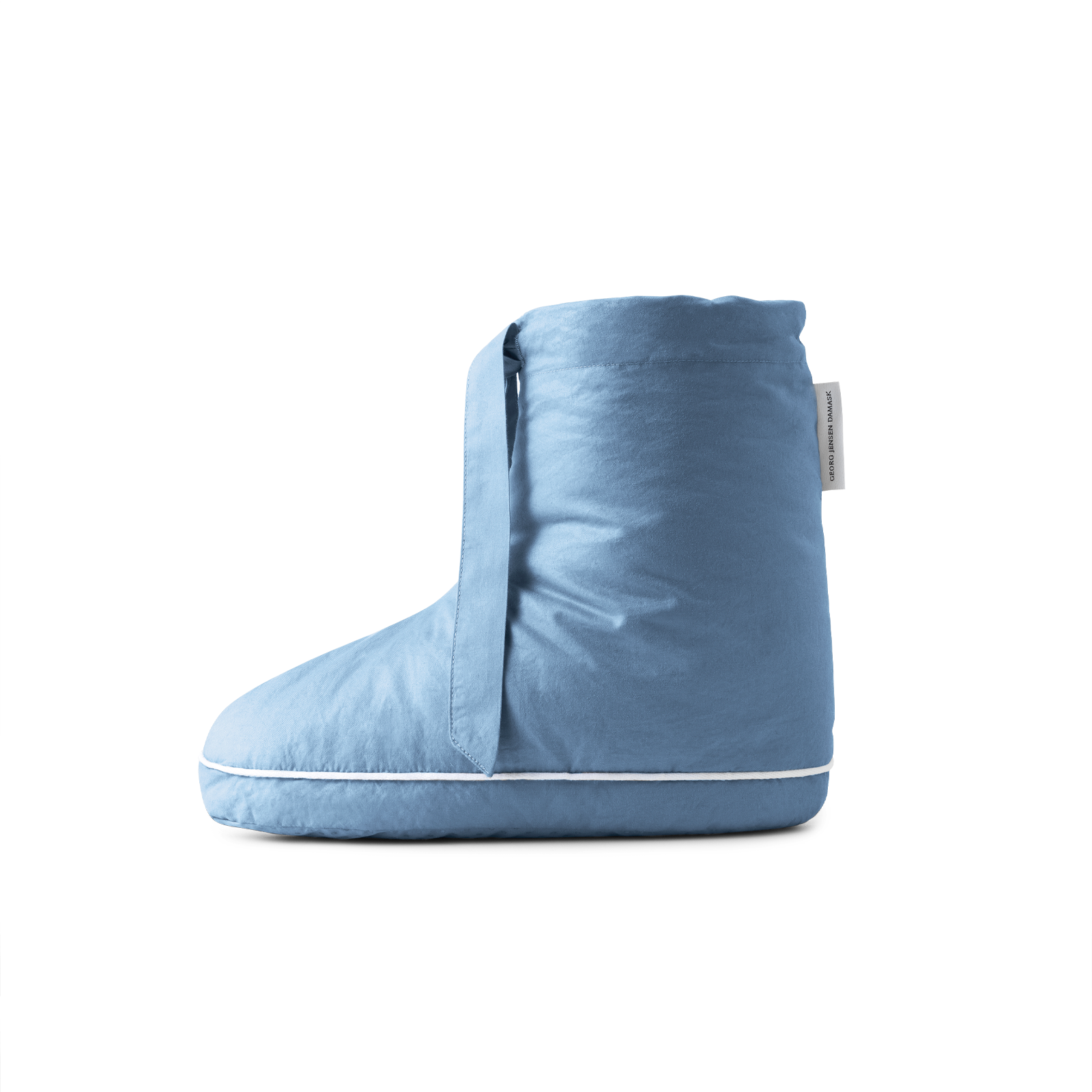 Bløde og lune andedunsokker med elegant piping og bindebånd ved anklen. Cloud dunsokkerne er satinvævet i 100 % bomuld med fyld af luftige og åndbare andedun og fjer. Andedunene og -fjerene er GRS-certificerede. Blue Hour er en smuk og tidløs mellemblå farve.