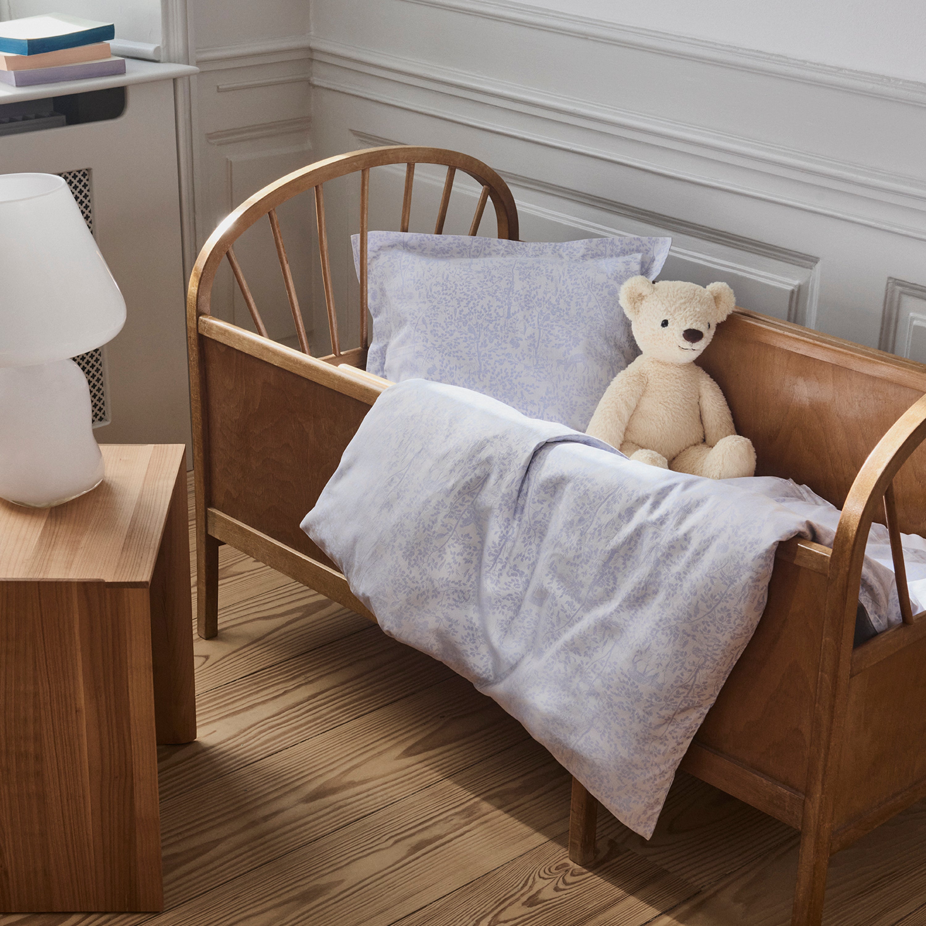 Forest er et jacquardvævet børnesengesæt i 100 % økologisk bomuld. Sengesættet i farven Clear Blue har det lille karakteristiske Georg Jensen Damask-børnelogo broderet i det ene hjørne.