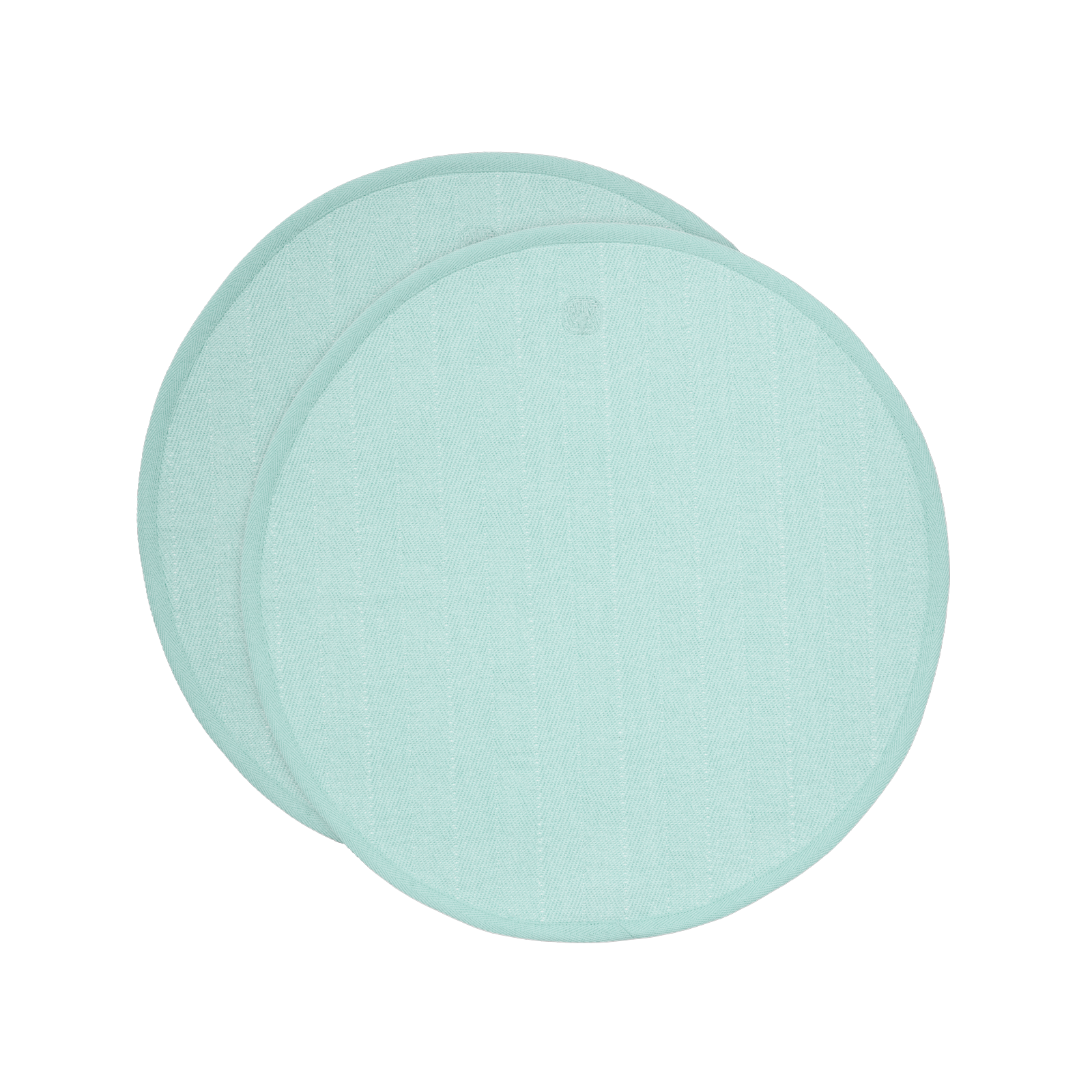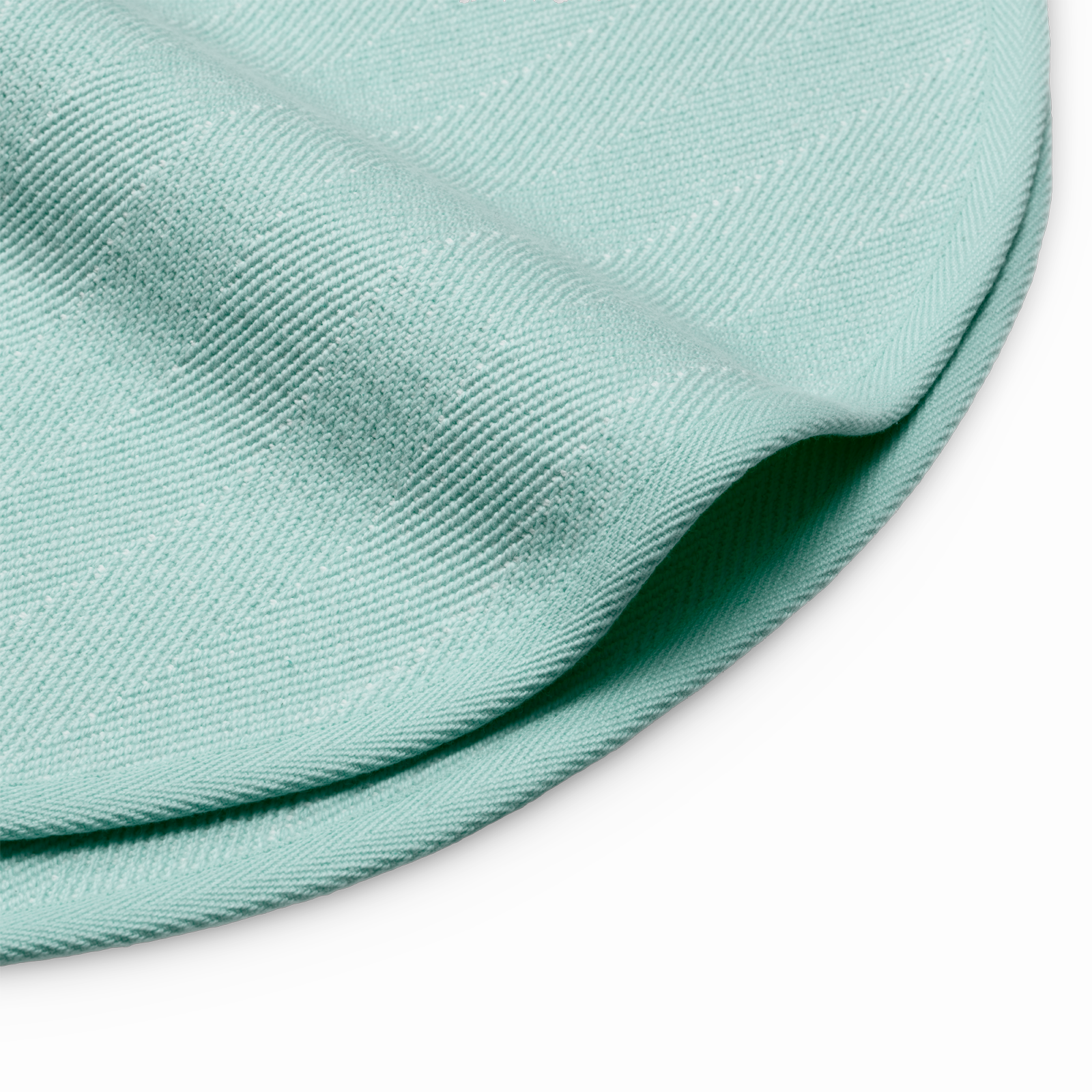 Dæk et elegant bord med de runde Herringbone-dækkeservietter i farven Deep Glass. Dækkeservietterne er vævet i 100 % kraftig bomuld. Vævemetoden giver det karakteristiske sildebensmønster og de kraftige garner får dækkeservietterne til at ligge tungt på bordet. De har et lille broderet logo i samme nuance som vævningen. Den klare, blågrønne nuance, Deep Glass, er inspireret af farven på råglas.