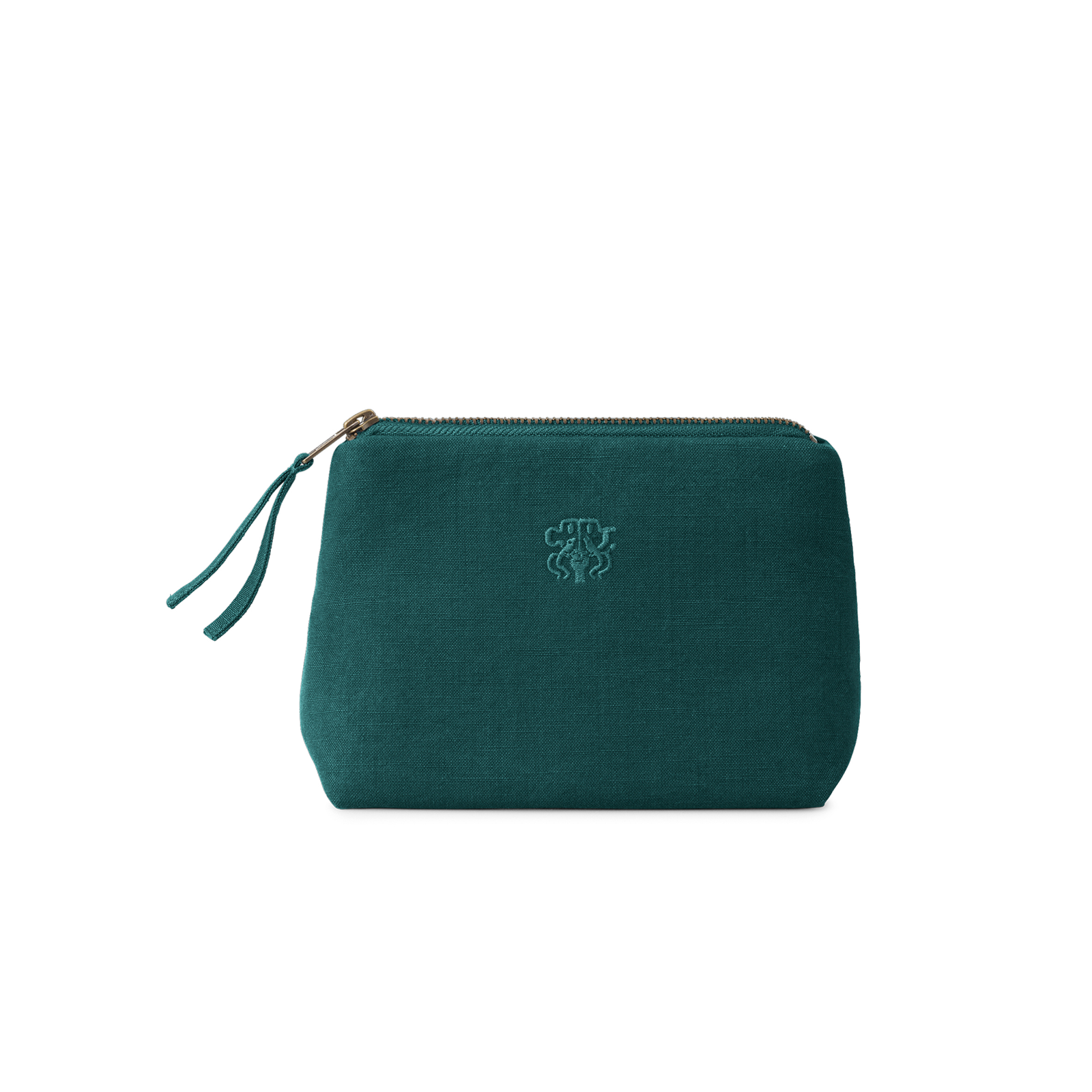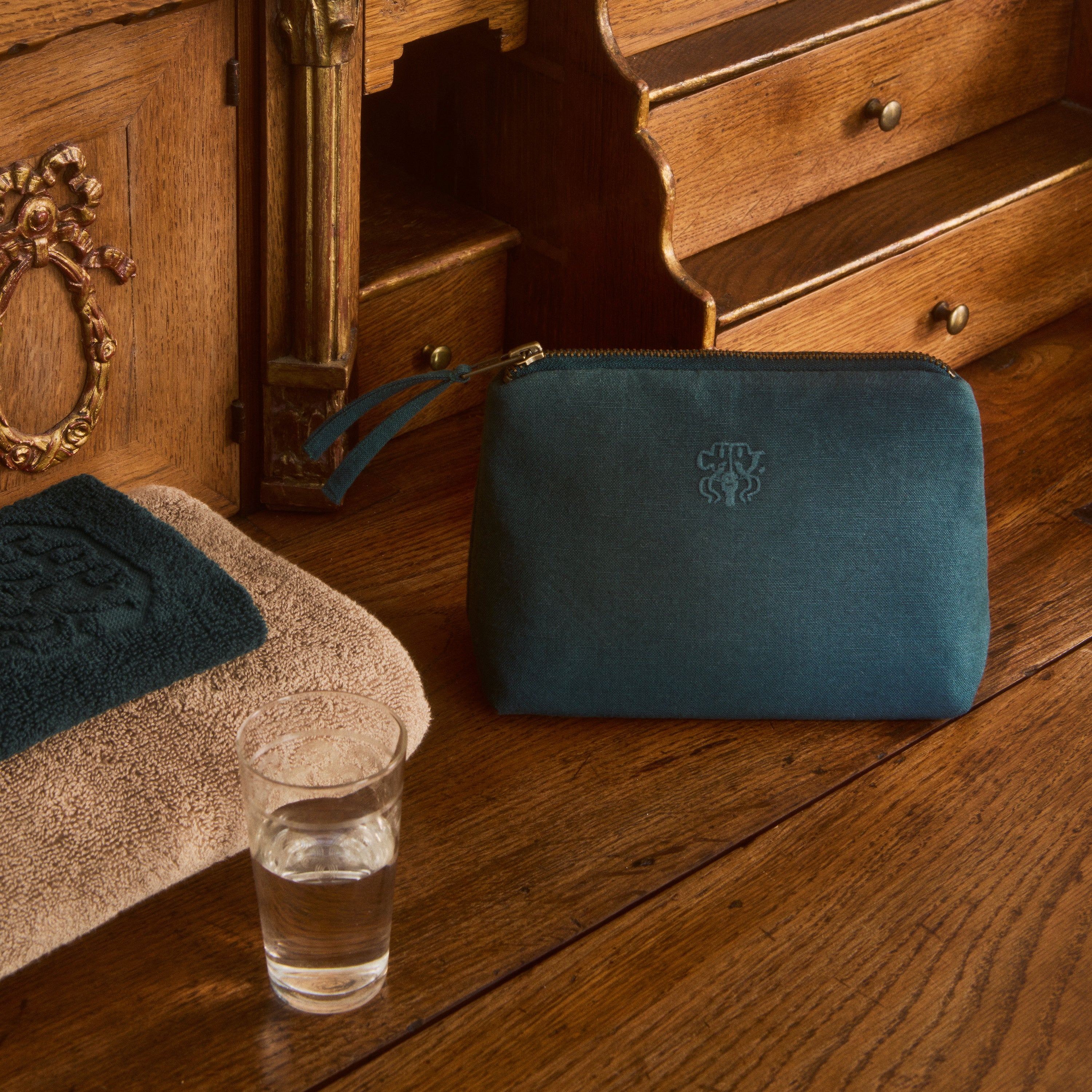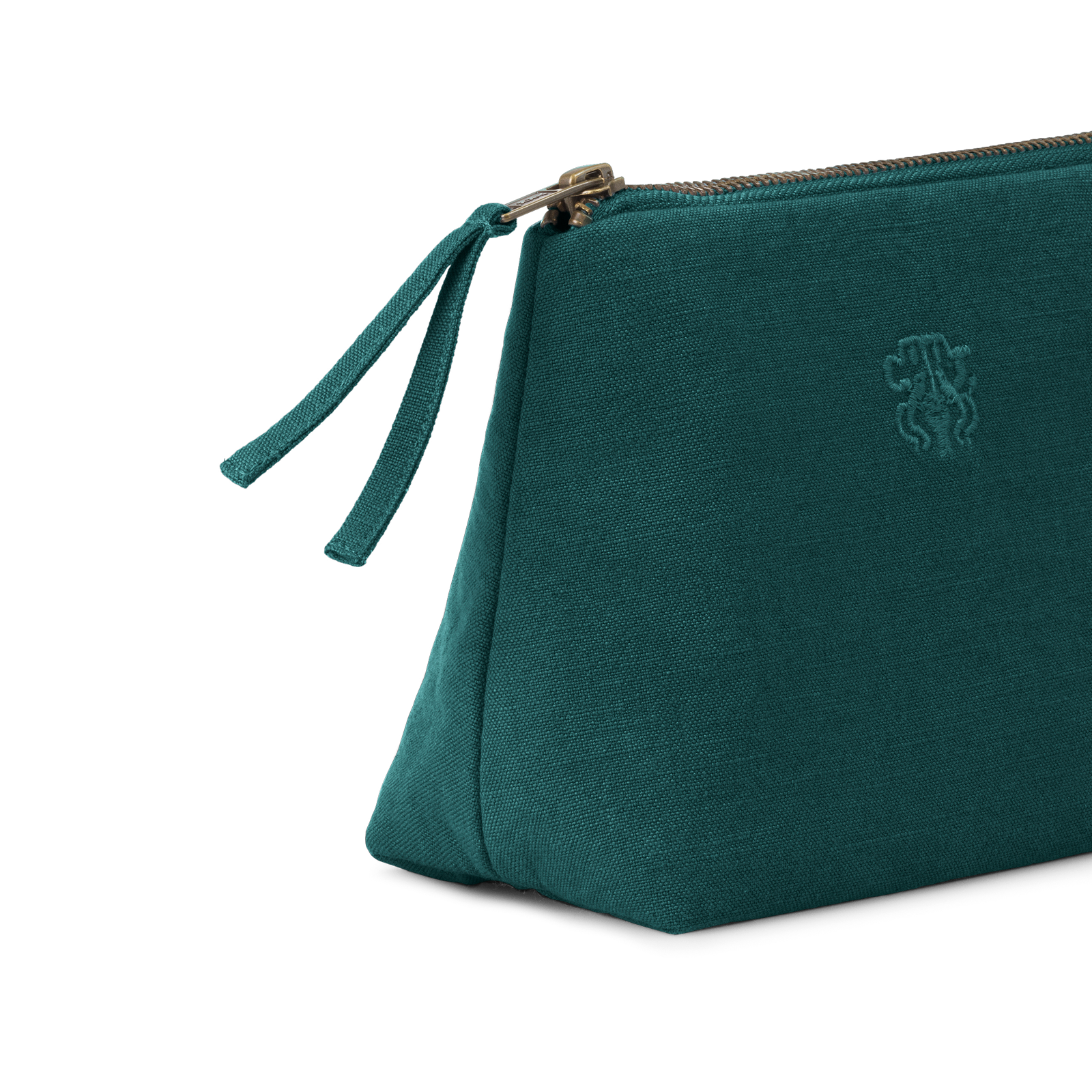 Funktionel og rummelig kosmetikpung i et tidløst design. All kosmetikpungen er vævet i 100 % bomuld med en indre lomme og har Georg Jensen Damasks logo broderet som elegant detalje. Farven Evergreen er en helt mørk og kølig grøn. Klassisk og sofistikeret.
