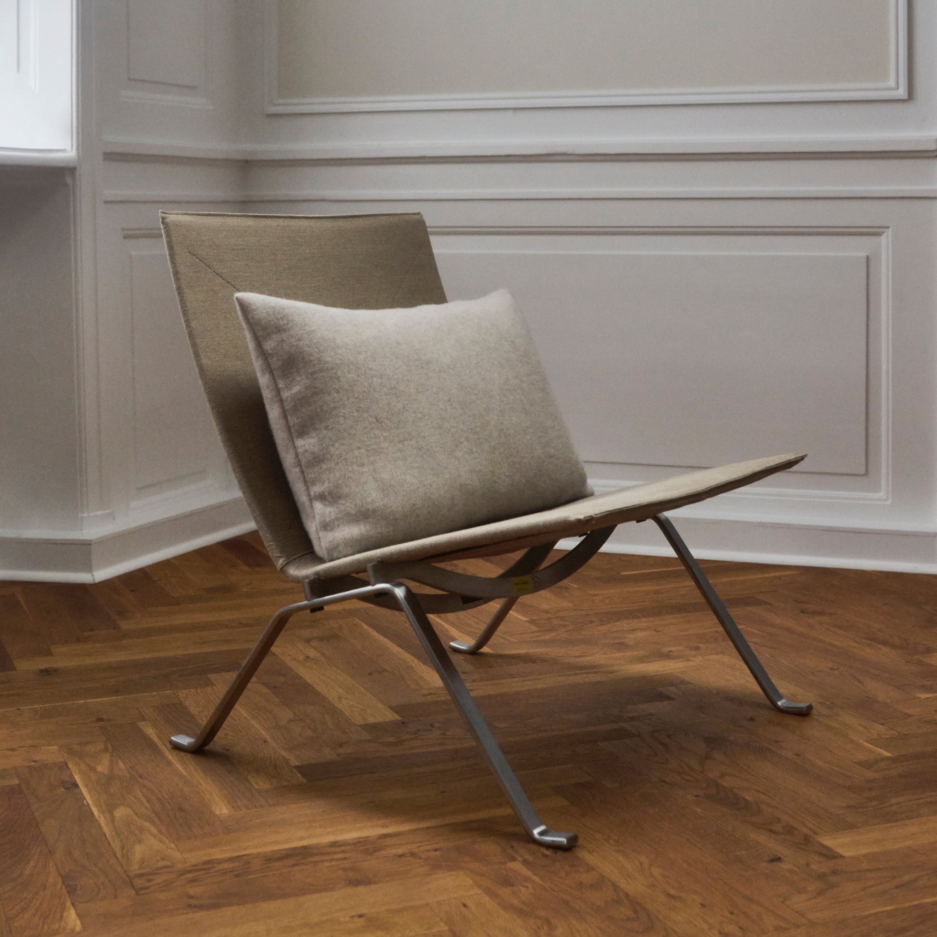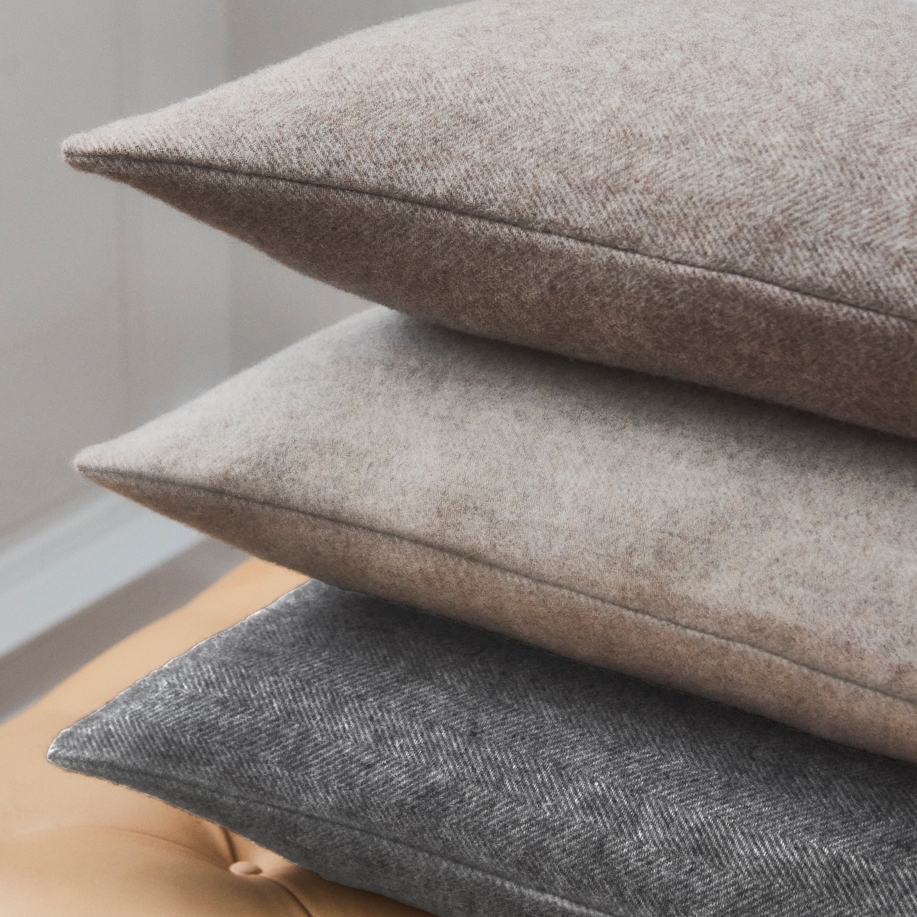 Elegant pude i merinould og cashmere. Drift puden i farven Soft Sand er vævet i et raffineret herringbone-mønster af garner i sandfarvede nuancer, der giver den et smukt og naturligt udtryk. Drift puden er skabt i 90 % merinould og 10 % cashmere, som får den til at holde godt på varmen og gør den perfekt at lune sig med.