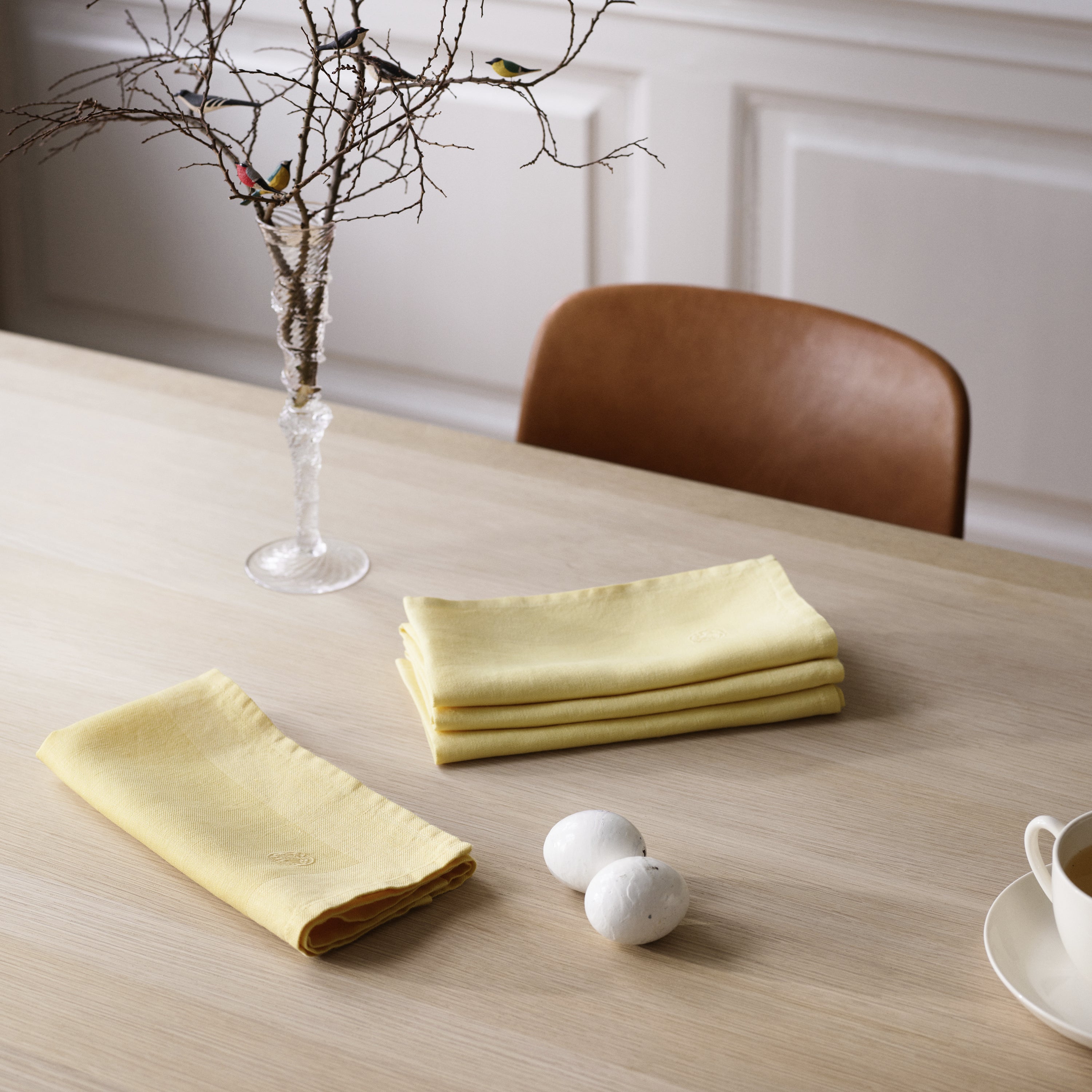 Med sit enkle design og den blide gule farve er servietten en raffineret tilføjelse til borddækningen. Særligt velegnet på det klassiske bord med dug, men lige fin som det stemningsfulde indslag i den enkle opdækning.