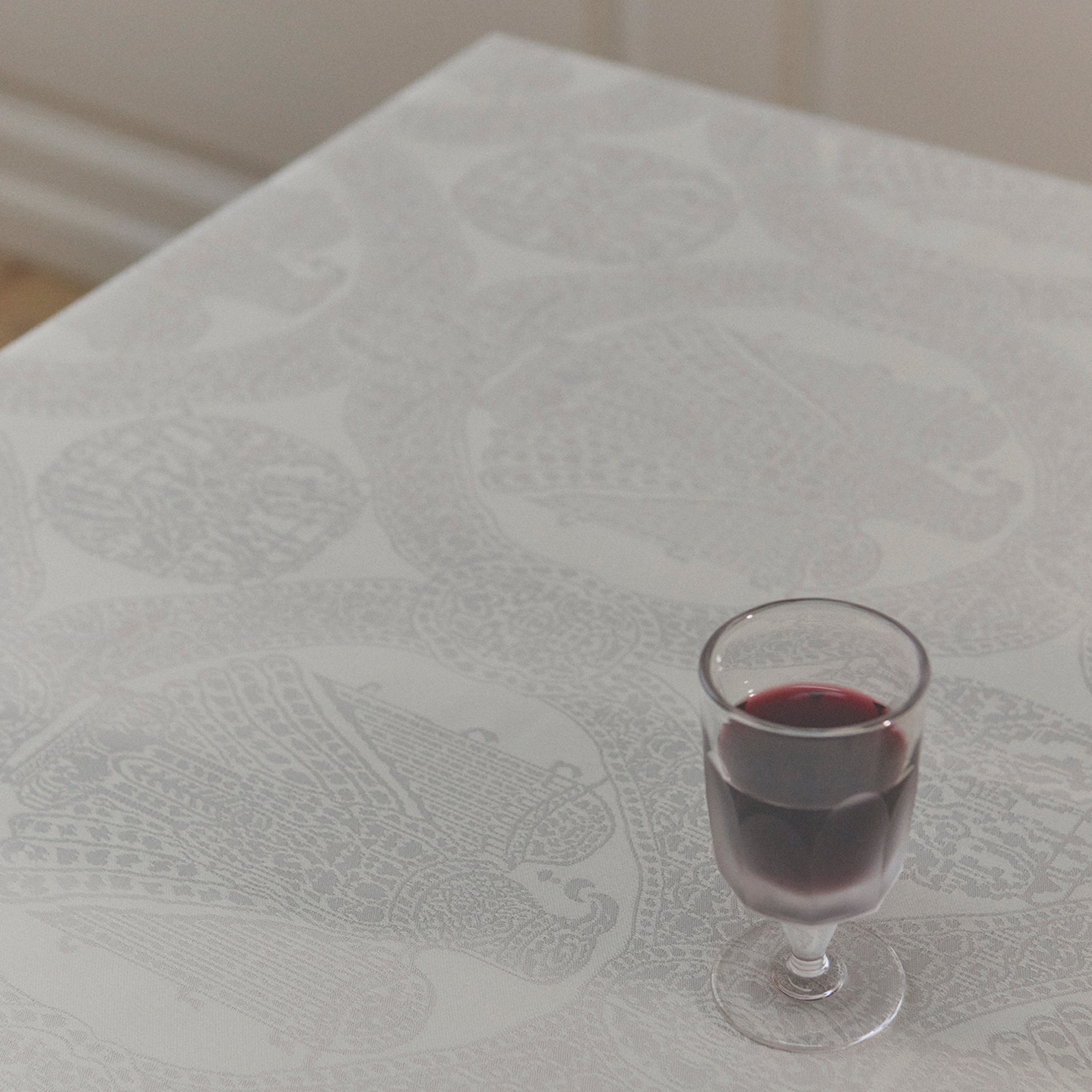 Dugen er vævet i 100 % dobbelttvundet, kæmmet bomuld og kommer i en smuk lysegrå farve, Light Grey. Den særlige damaskvævning giver Sct Knuds Ørne-dug et smukt changerende udtryk.