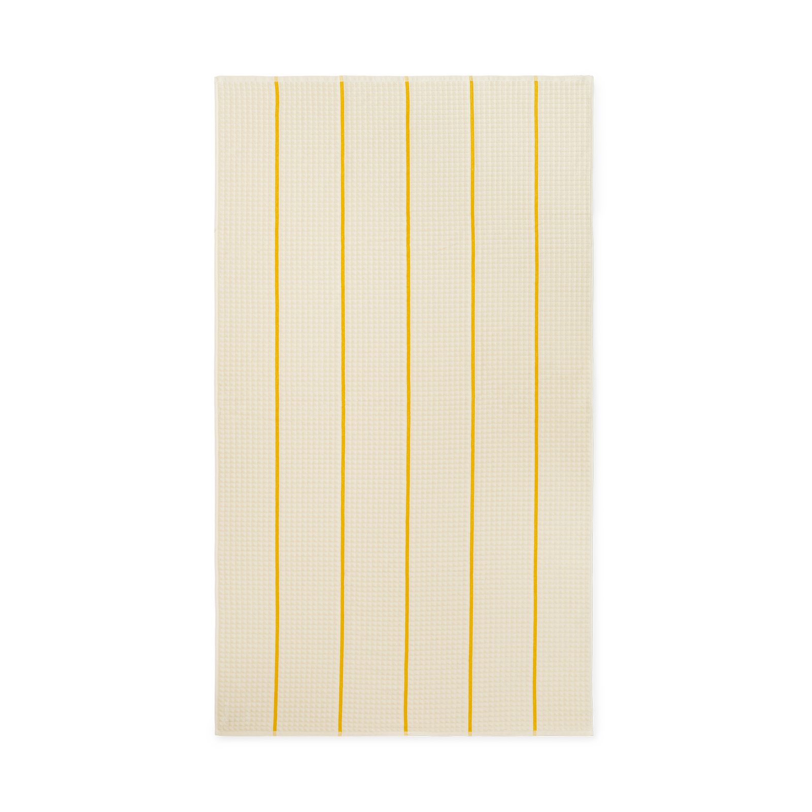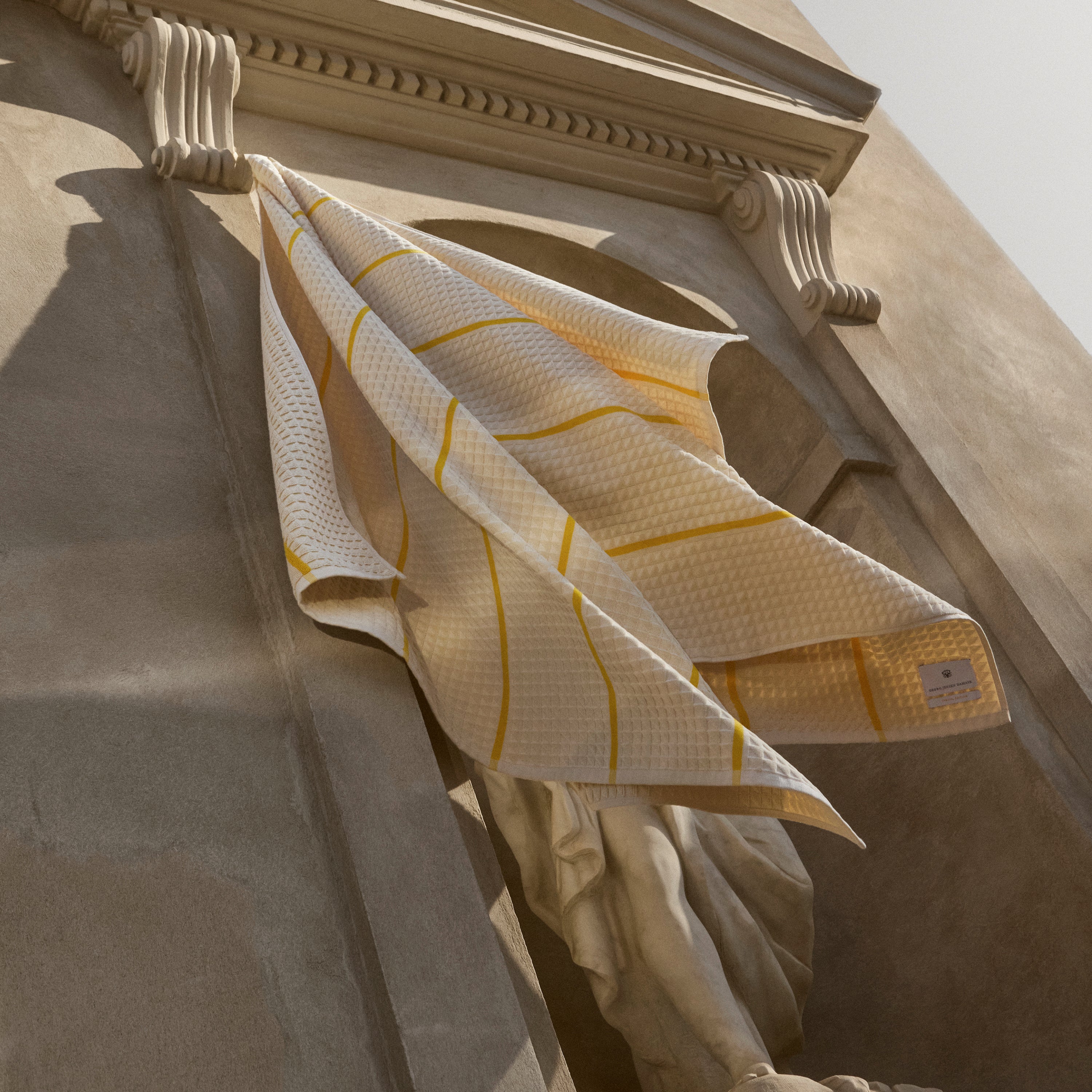 Georg Jensen Damasks elegante Speciel Edition strandhåndklæde er skabt med udgangspunkt i det ikoniske facetmønster, hvor designer og væver Jette Nevers har udnyttet jacqardvævningen til at skabe et elegant skyggespil i mønsterets sammenhængende trekanter. I Special Edition strandhåndklædet fremhæves den smukke geometri i blød velourfrotté med lodrette delinger af solsikkegule striber.