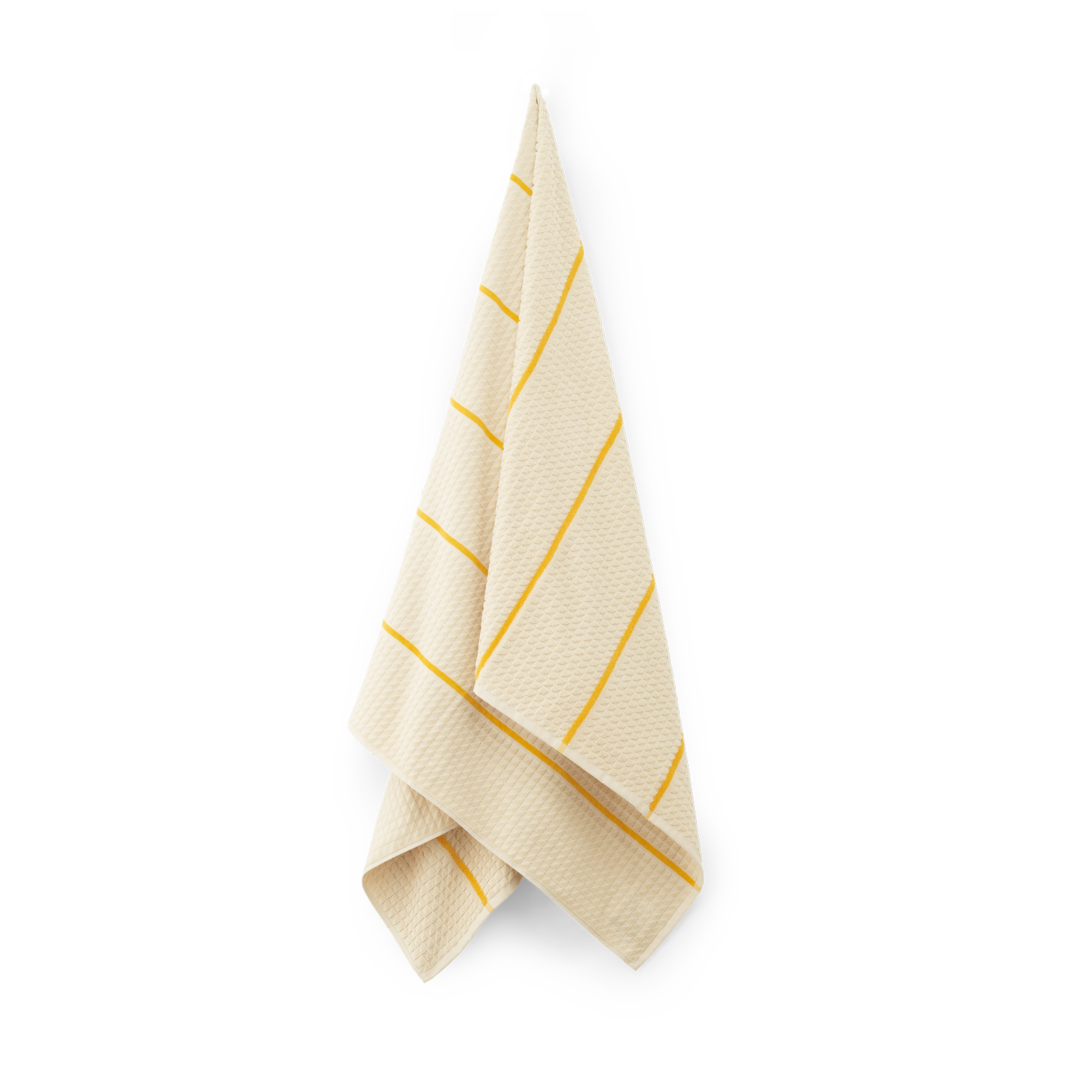 Georg Jensen Damasks elegante Speciel Edition strandhåndklæde og clutch er skabt med udgangspunkt i det ikoniske facetmønster, hvor designer og væver Jette Nevers har udnyttet jacqardvævningen til at skabe et elegant skyggespil i mønsterets sammenhængende trekanter. I Special Edition strandhåndklædet og clutchen fremhæves den smukke geometri i blød velourfrotté med lodrette delinger af solsikkegule striber.