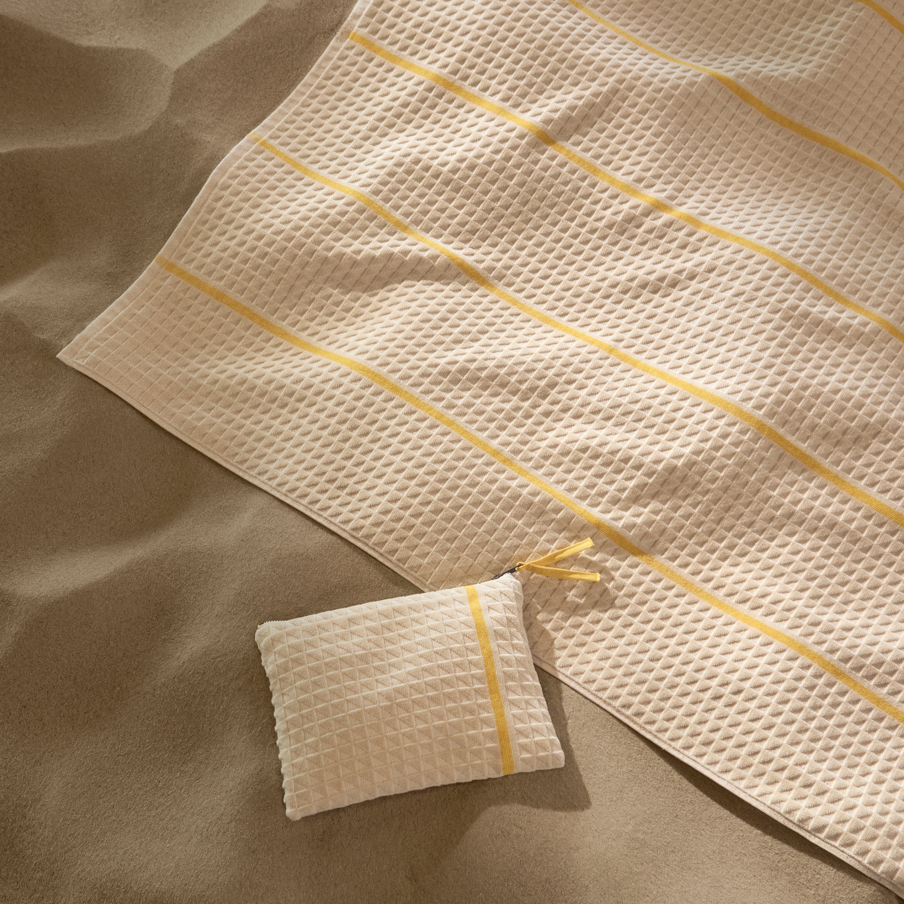 Strandhåndklædet og clutchen er jacquardvævet i dobbelttvundet, kæmmet bomuld, som giver en særlig blød og glat overflade. Sandfarven er inspireret af klassiske sandstensfacader og varme strande.