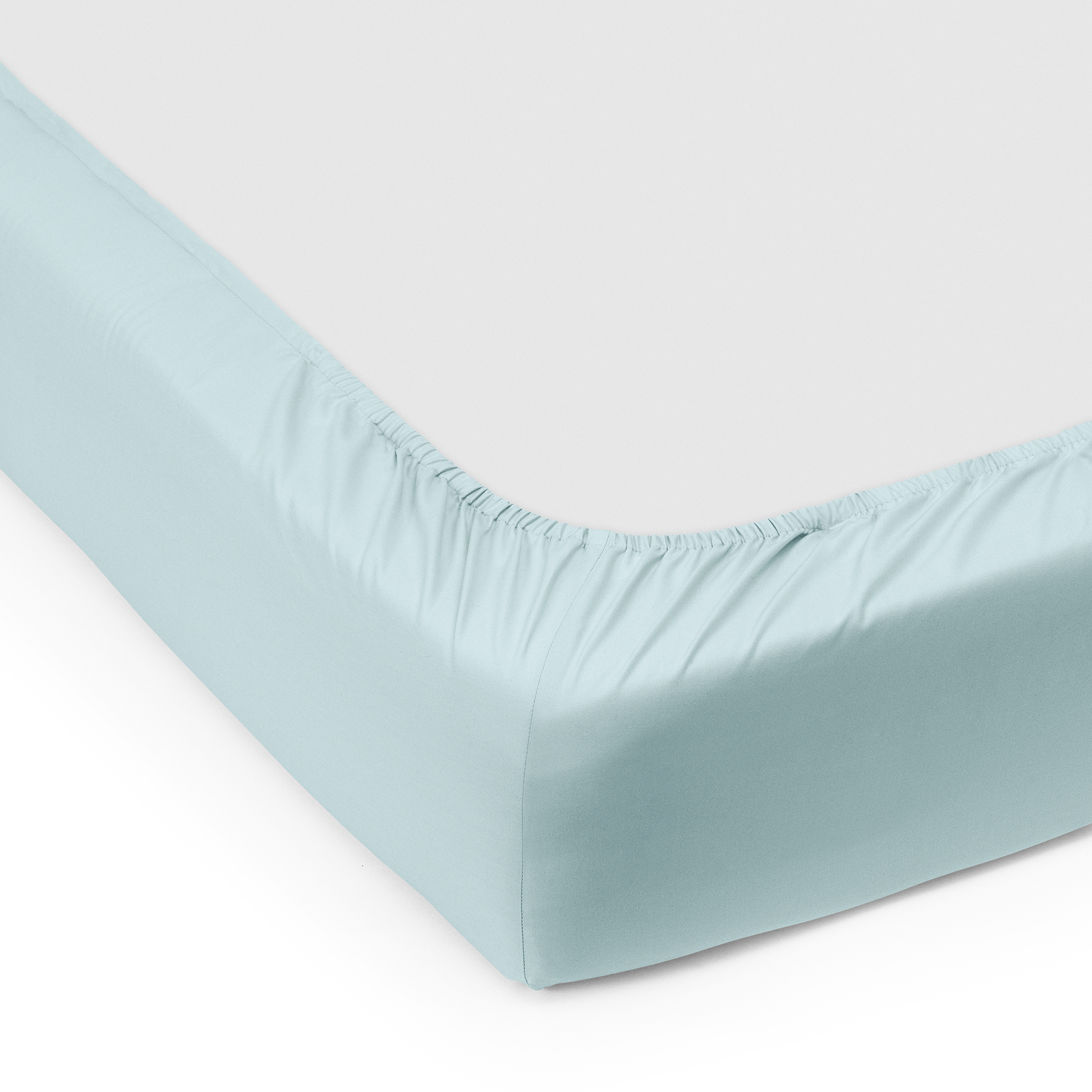 Bokslagnet er formsyet og har elastikker i hjørnerne. Lagnet bærer Georg Jensen Damasks ikoniske logo som et diskret broderi. Minimal Blue er en helt let variant af lyseblå med et strejf af aquanuancer.