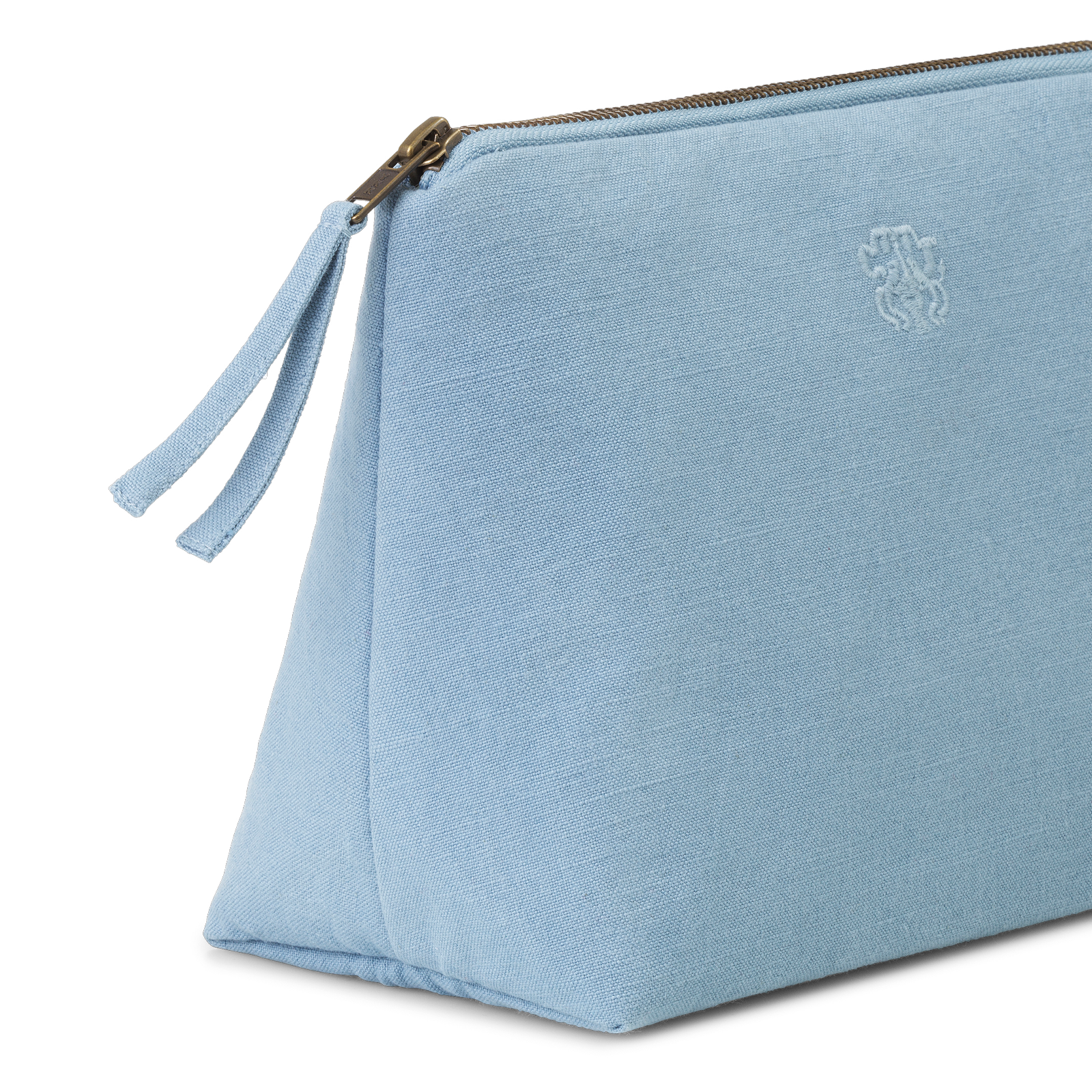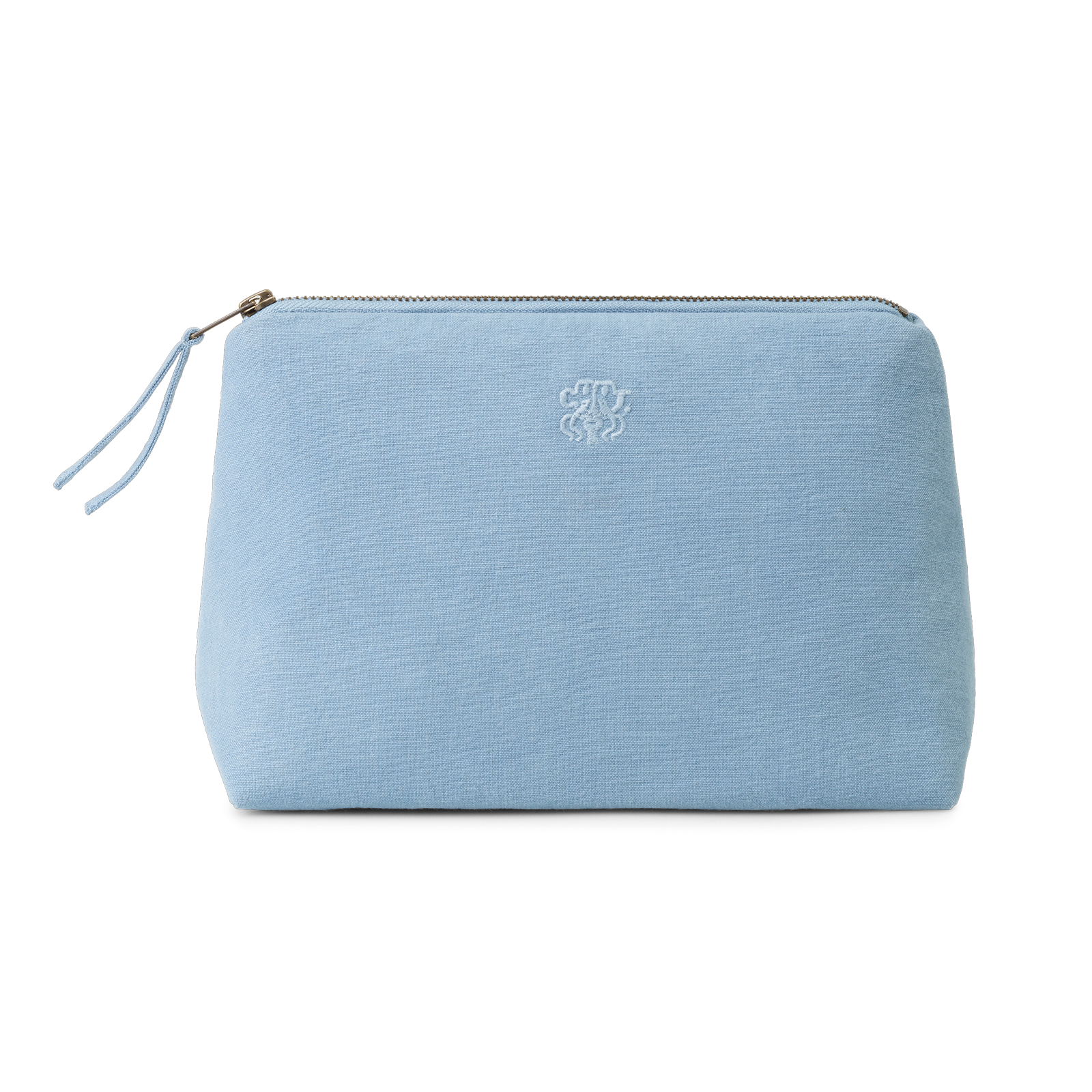 Funktionel og rummelig toilettaske i et tidløst design. All toilettasken er vævet i 100 % bomuld med en indre lomme og har Georg Jensen Damasks logo broderet som elegant detalje. Farven Blue Hour er en smuk og tidløs, mellemblå farve.