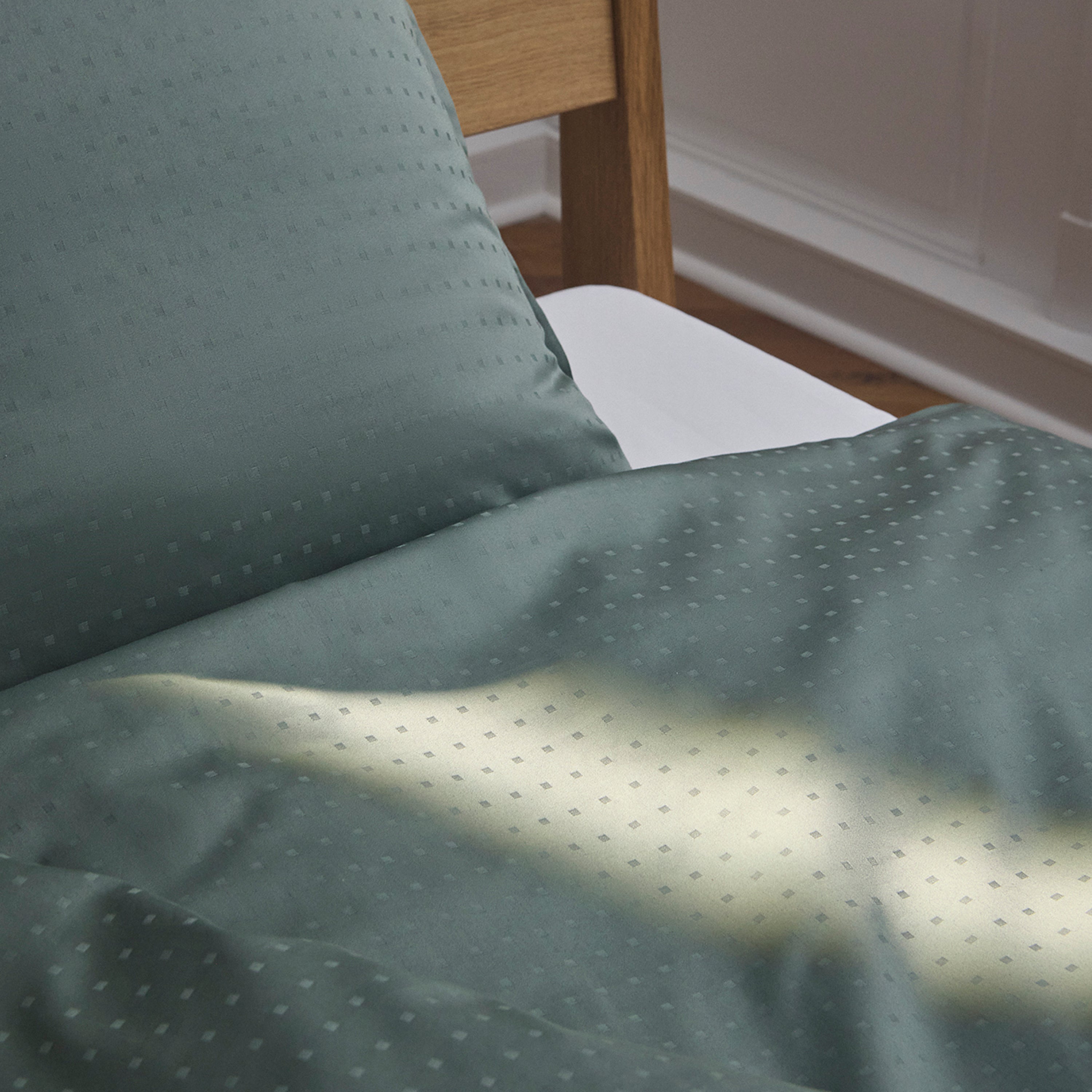 2 sett bløtt og glansfullt sengetøy med geometrisk mønster. Det stramme designet med små kuber fremheves vakkert i den reflekterende satengvevingen og gir Light sengetøyet et både lett og harmonisk uttrykk. Light er Oeko‑Tex®‑sertifisert og vevd i 100 % langfibret bomull, som gjør det ekstra slitesterkt. Fargen Dusty Green er en støvet grønn.