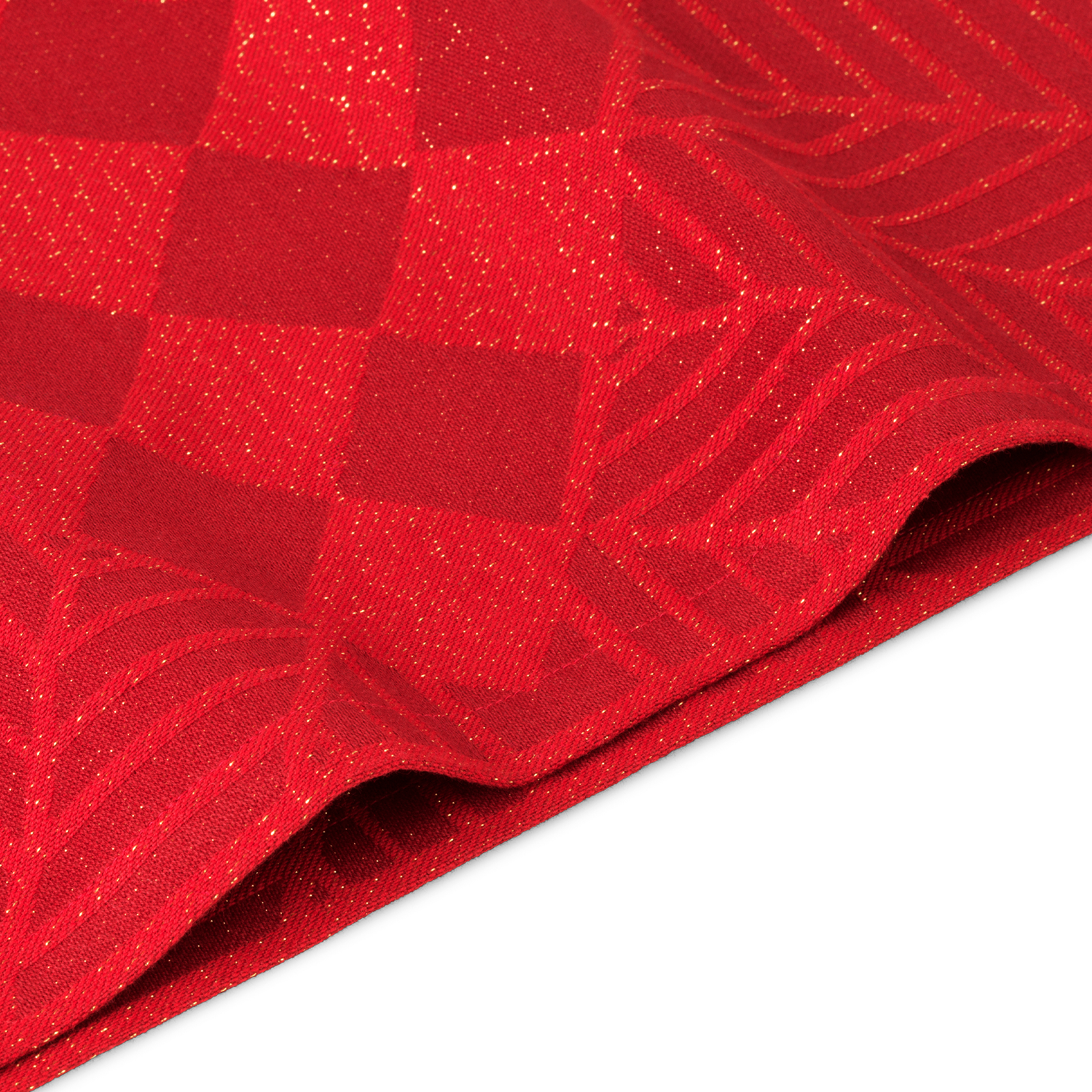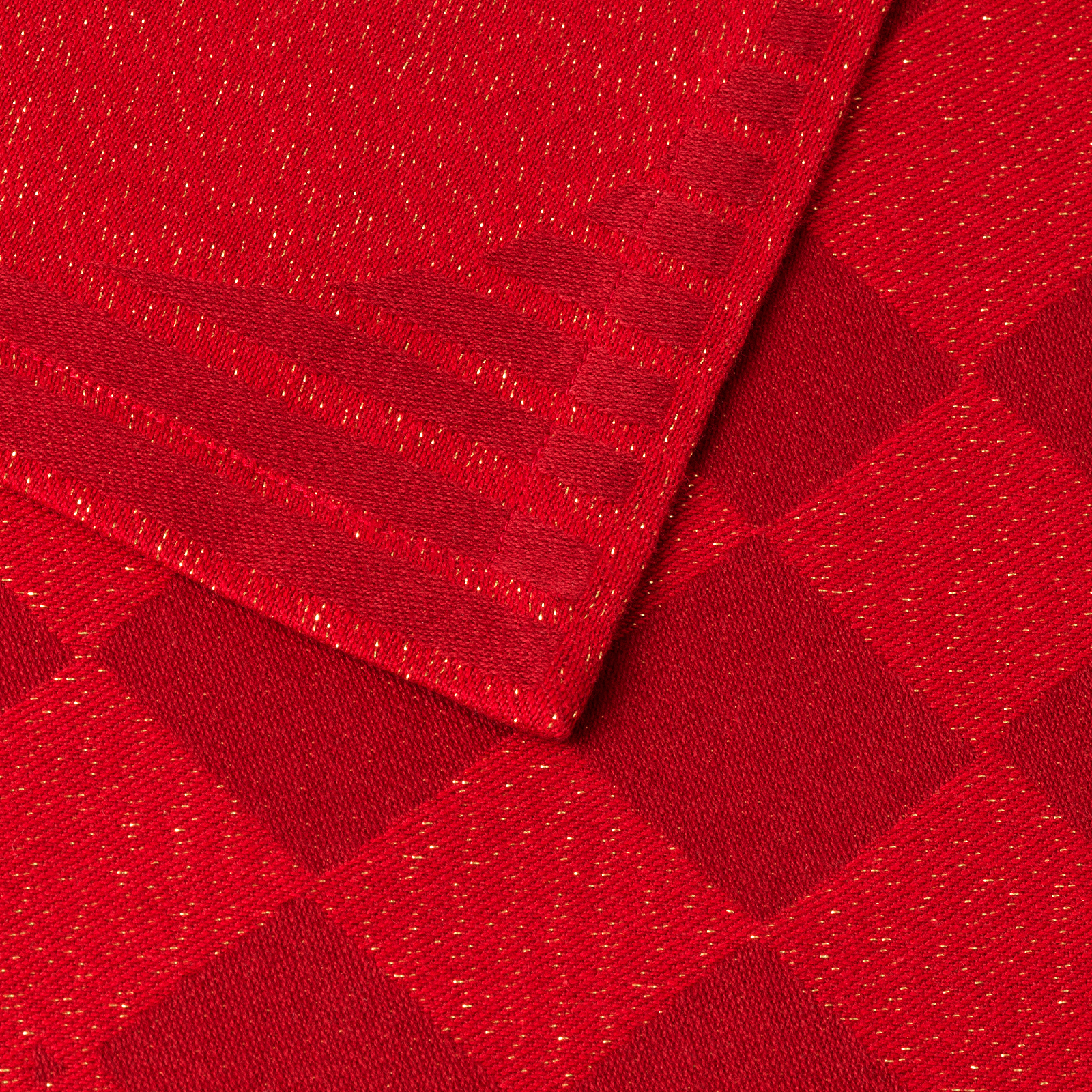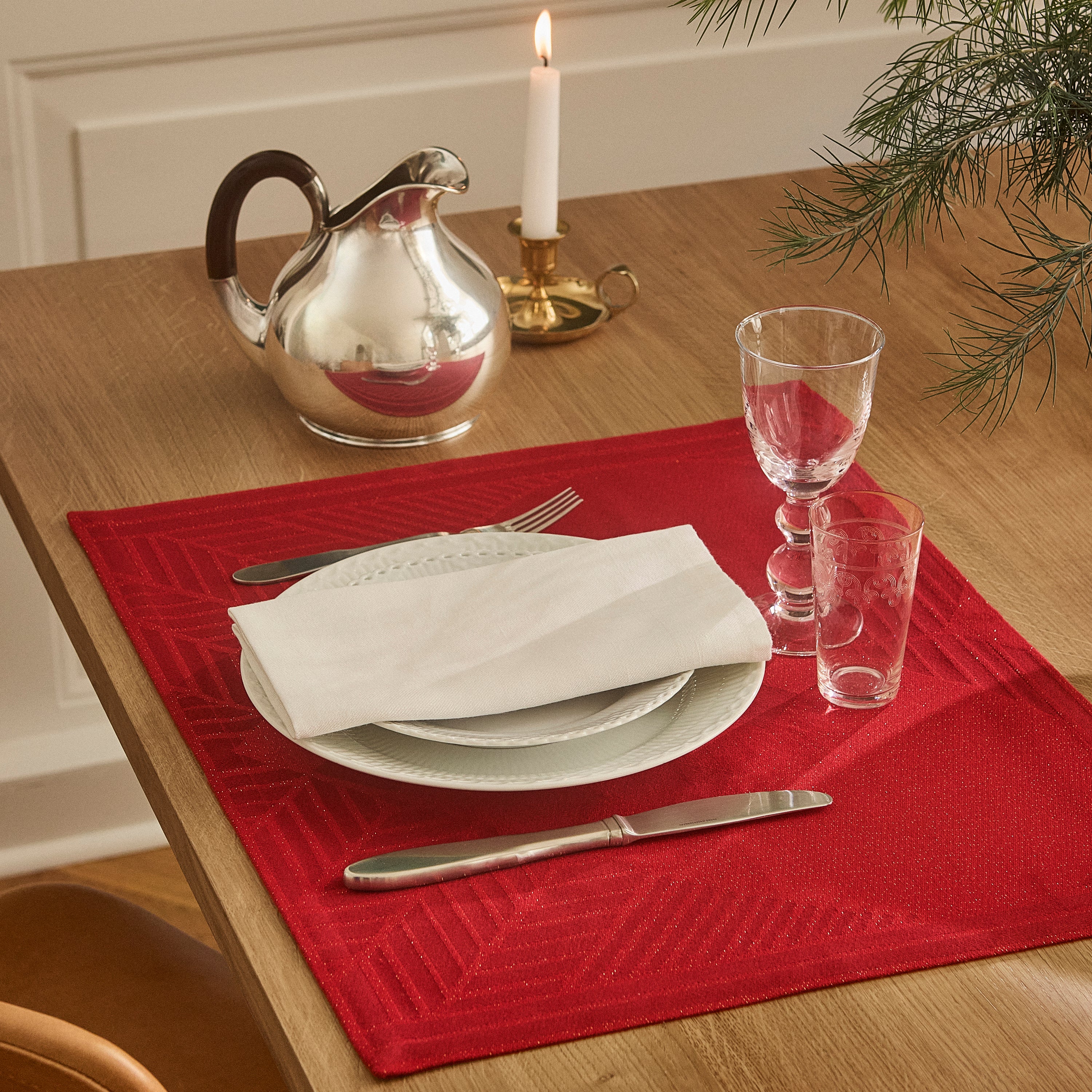 Georg Jensen Damask feirer juledesignets 50-årsjubileum med et glitrende preg på det ikoniske motivet. Spisebrikken, Christmas Rustic 50, i fargen Gold Red, er vevd i delikat dyp rød bomull med gyldne, metalliske tråder.