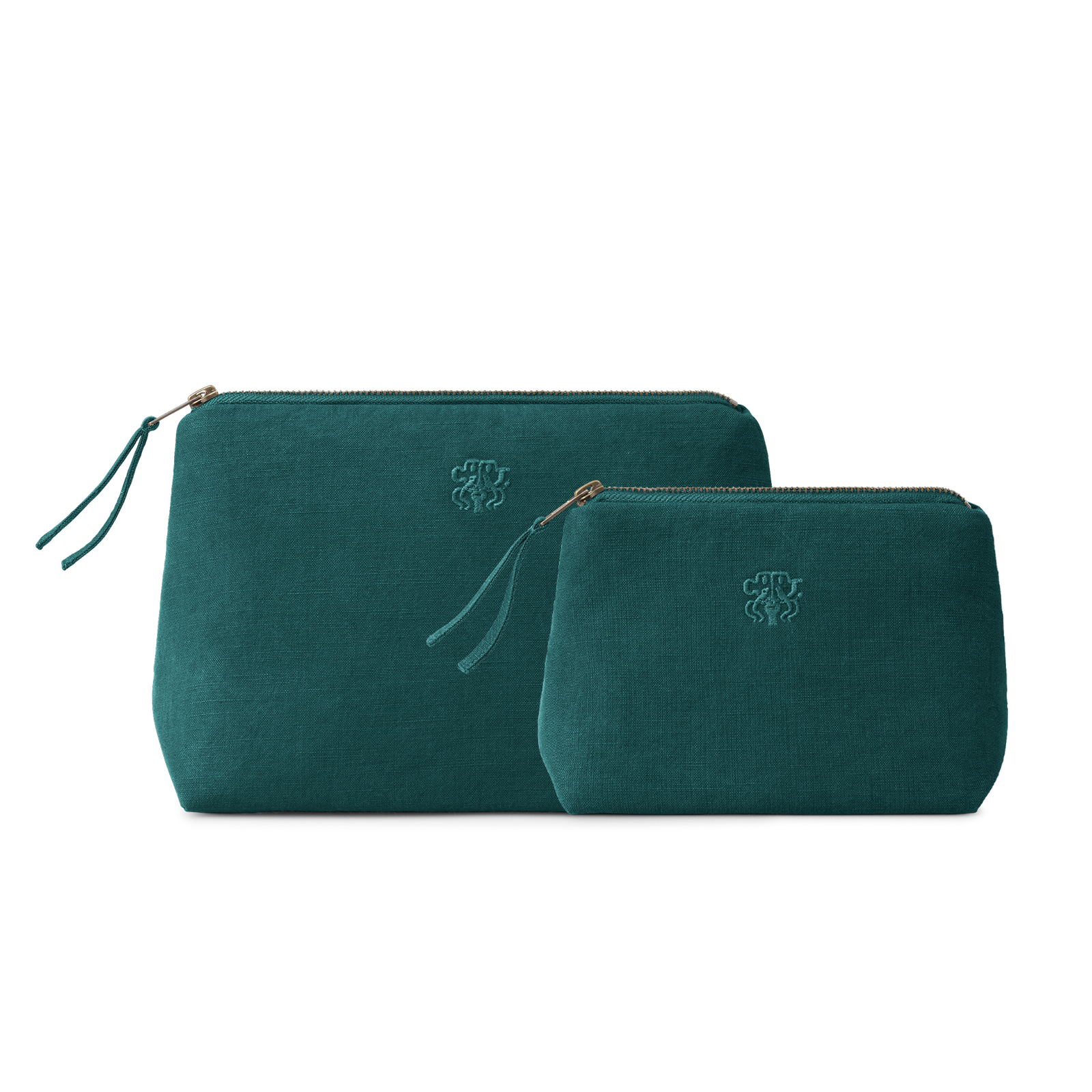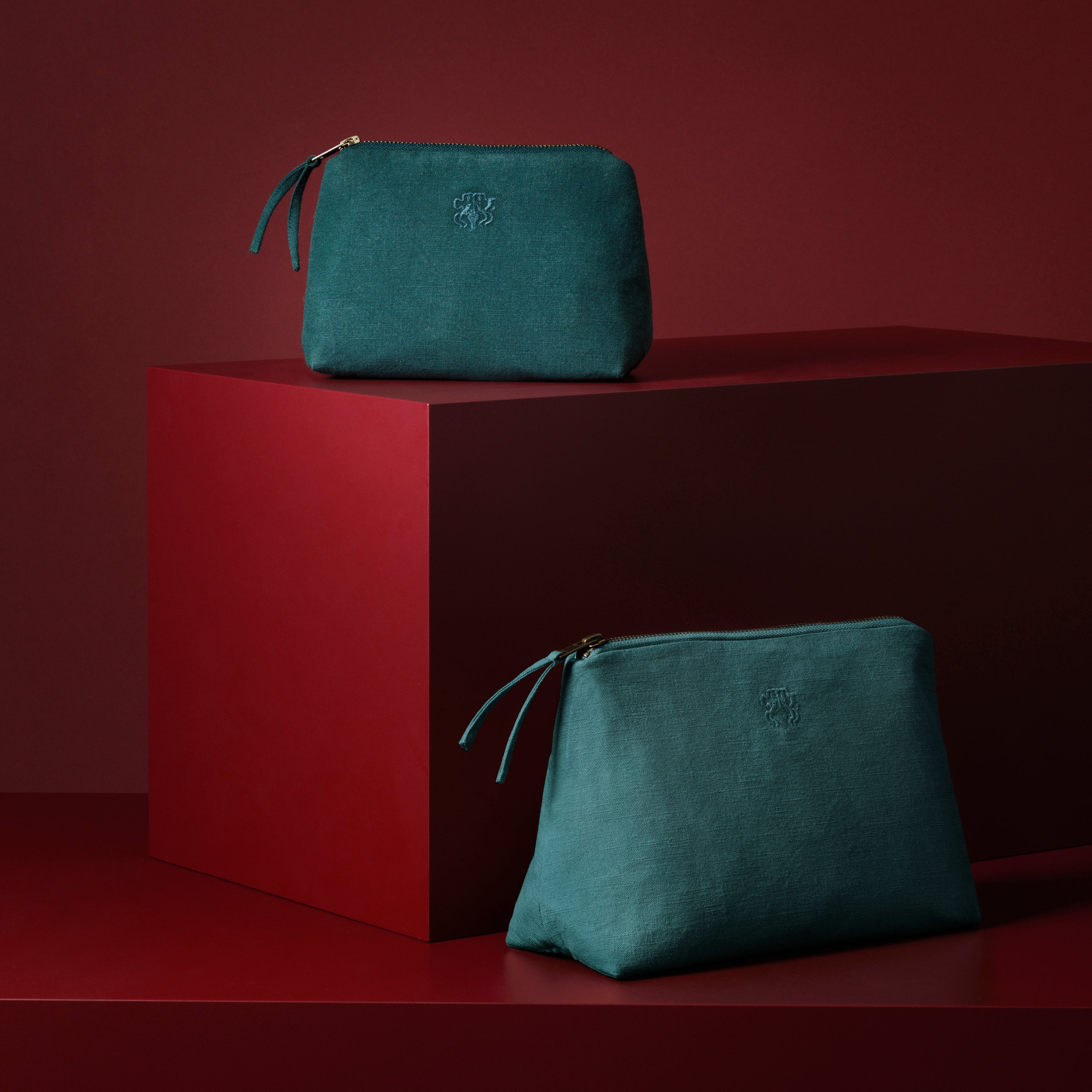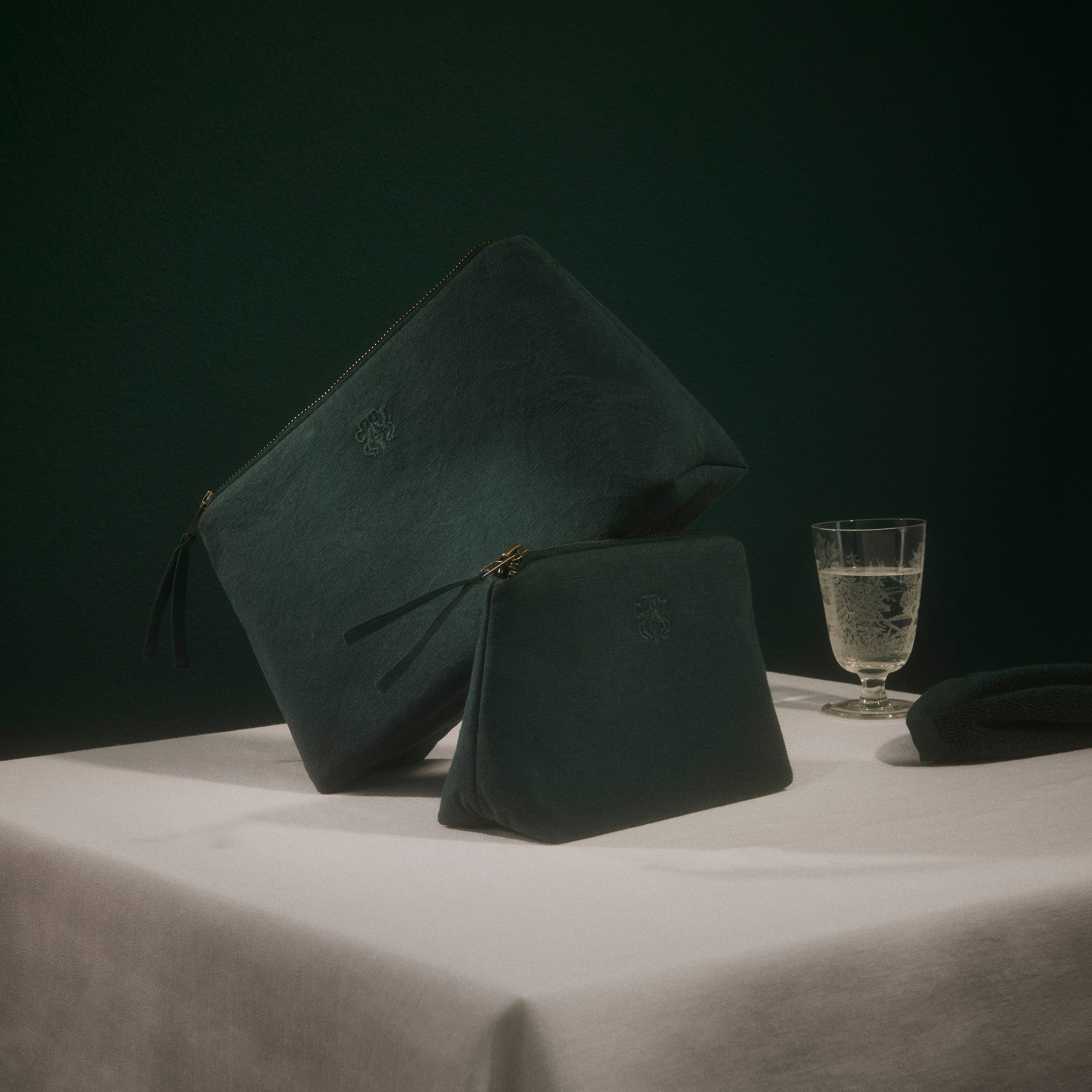 All sminkepung. All toalettmappe og sminkepung i fargen Evergreen – en helt mørk og kjølig grønn. Den funksjonelle og romslige toalettmappen og sminkepungen er lærredsvevd i 100 % bomull med en innvendig lomme og har Georg Jensen Damasks logo brodert som en elegant detalj.