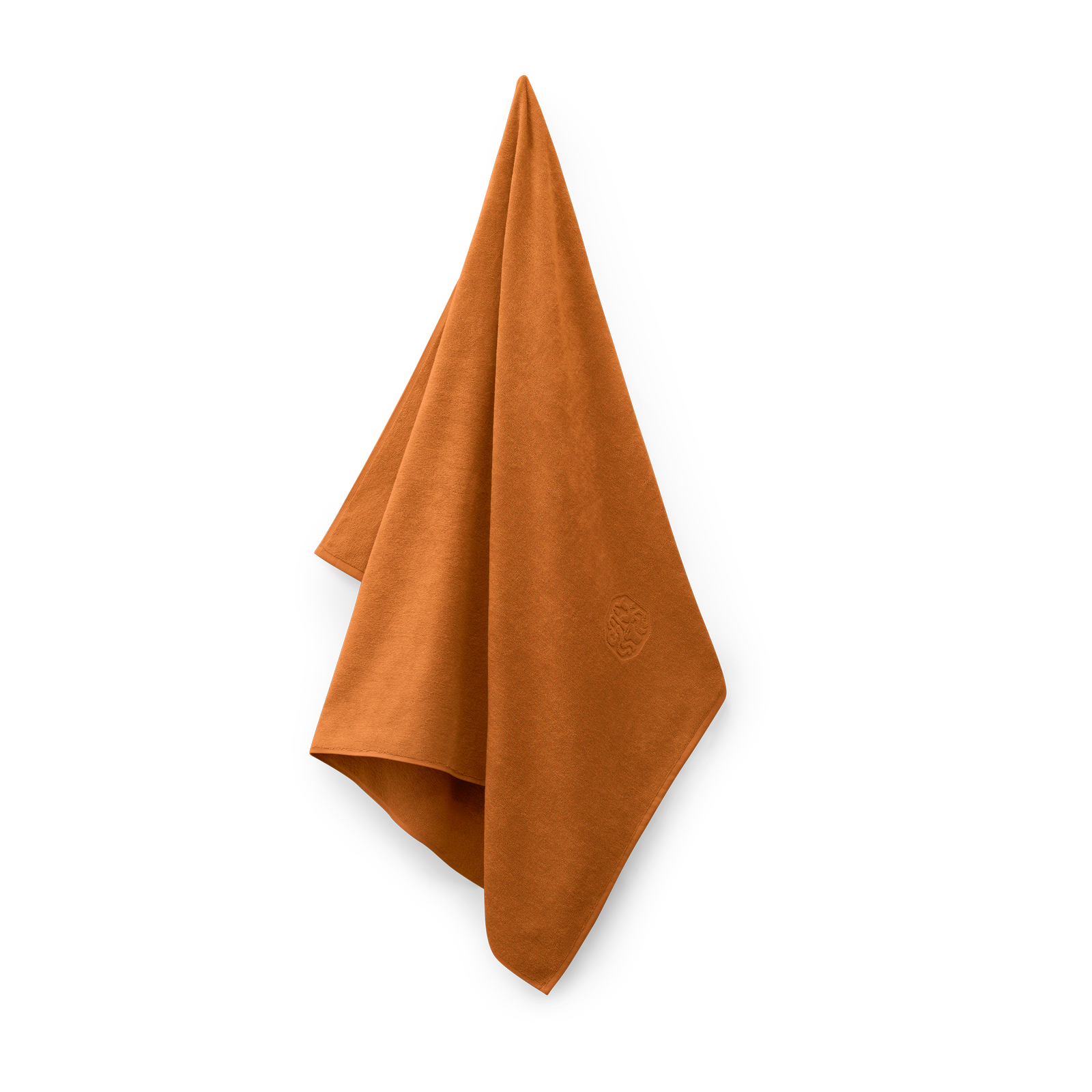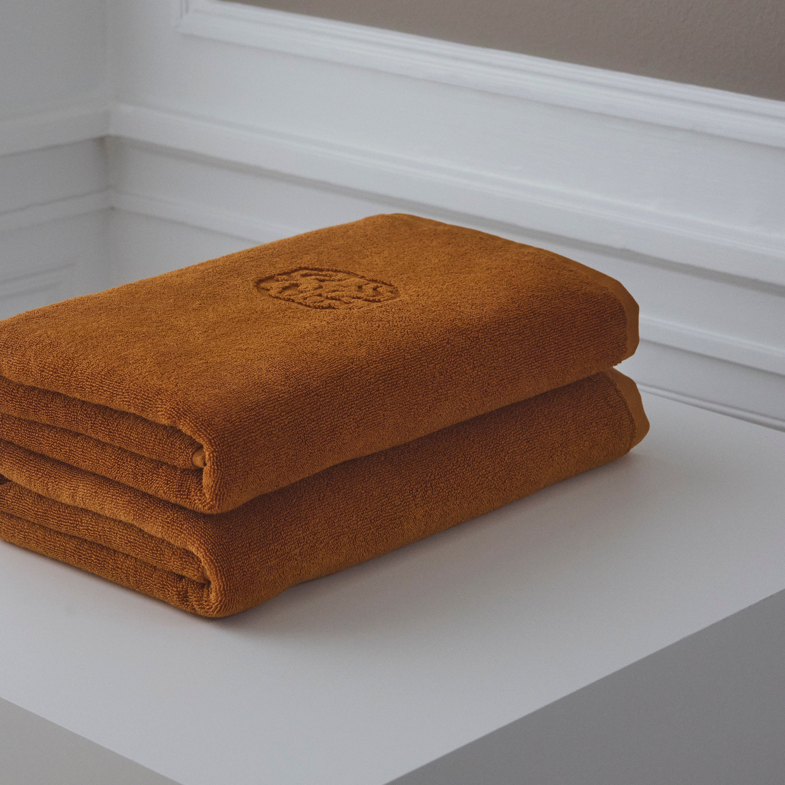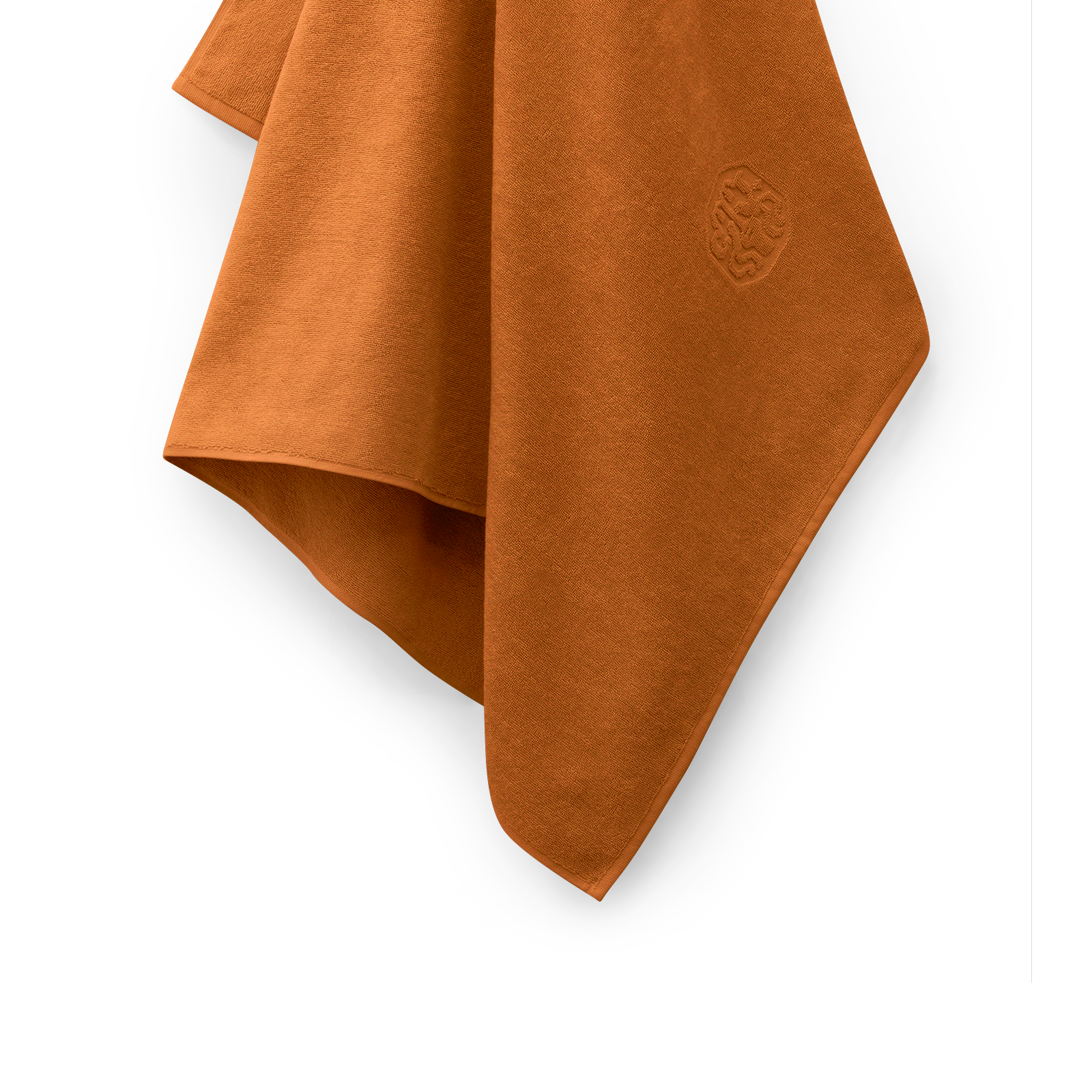 Stort og mykt Damask Terry badelaken i fargen Chanterelle – en dyp oransje med karamelltoner. Fargen er inspirert av kantarellens vakre nyanser. Som en enkel detalj er Georg Jensen Damasks ikoniske logo vevd inn.