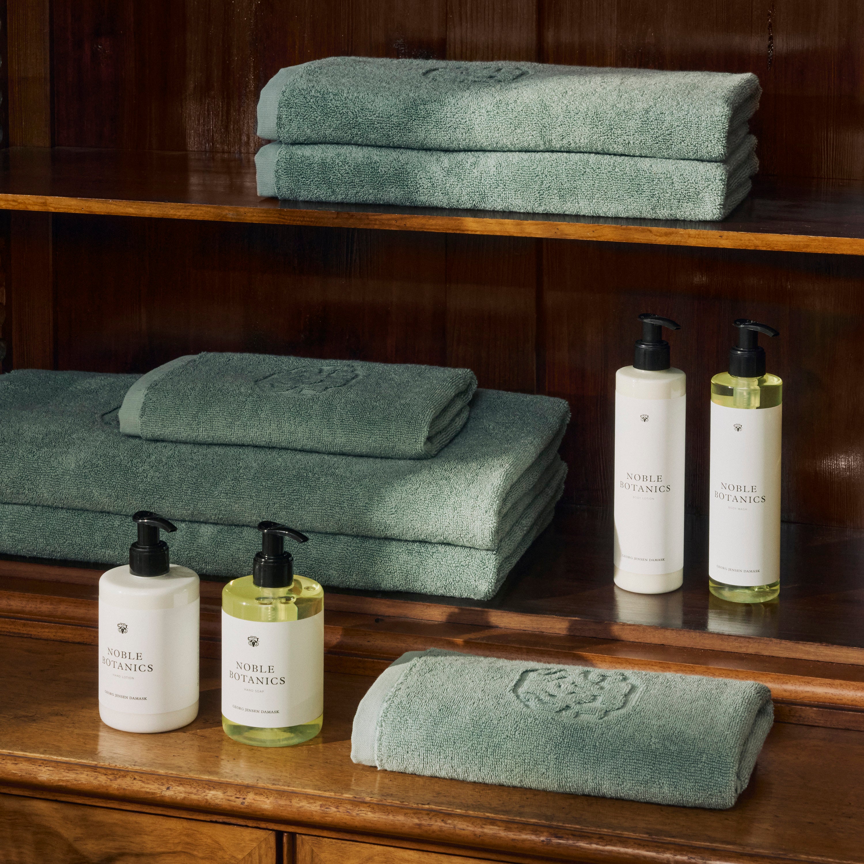 Stort og mykt Damask Terry badelaken i fargen Sage Green – Sage Green er en kjølig nyanse av grønn. Som en elegant detalj har badelakenet Georg Jensen Damasks ikoniske logo innvevd.