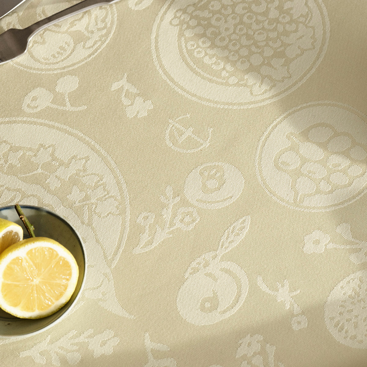 Banquet er en elegant damaskvevd duk med et design bygget på elementer fra renessansemåltidet. Duken har et innvevd Christian 4.-monogram som historisk referanse og er vevd i 100 % dobbelttvunnet, kjemmet bomull. Den er tilgjengelig i to farger. Pale Yellow er en fin, lysegul nyanse.