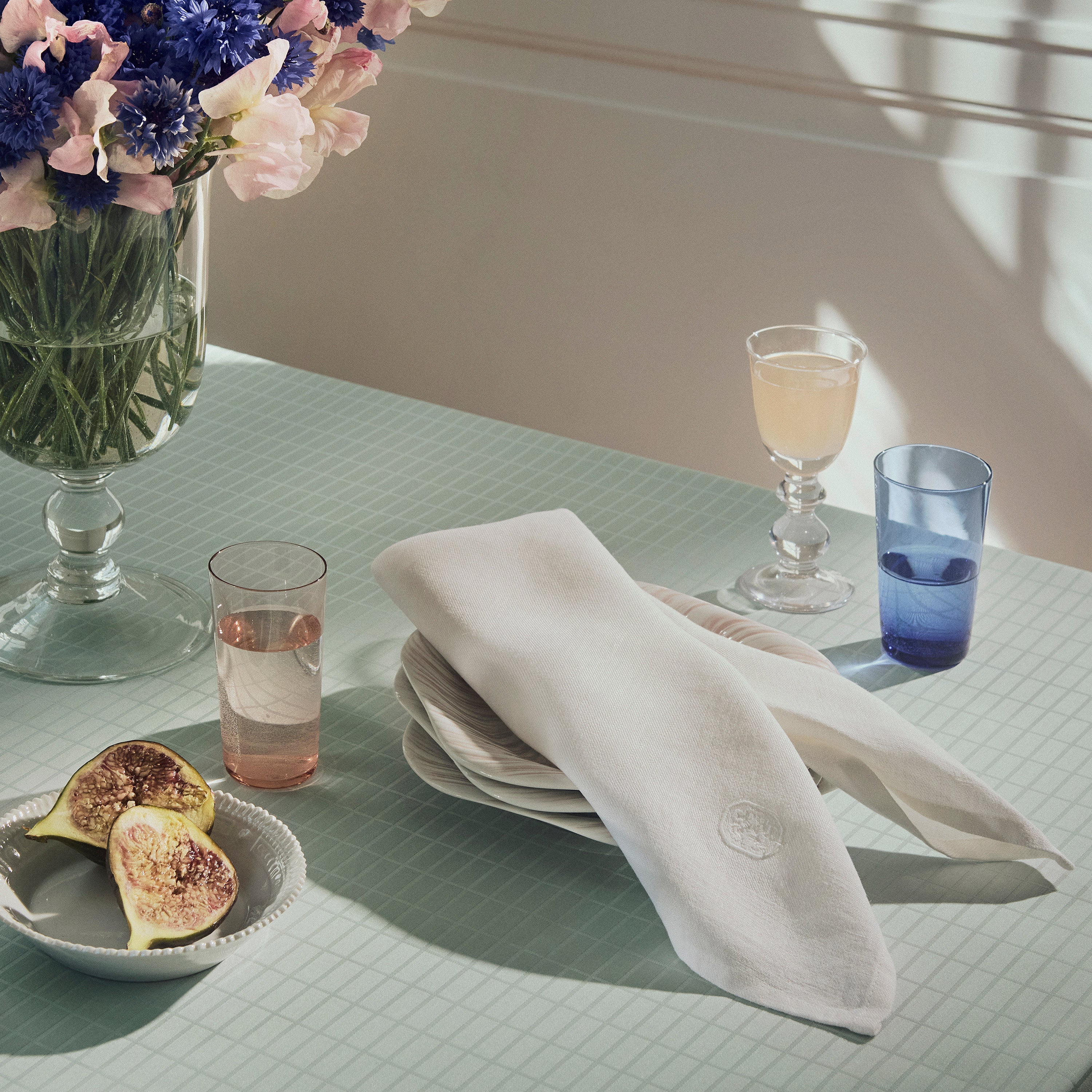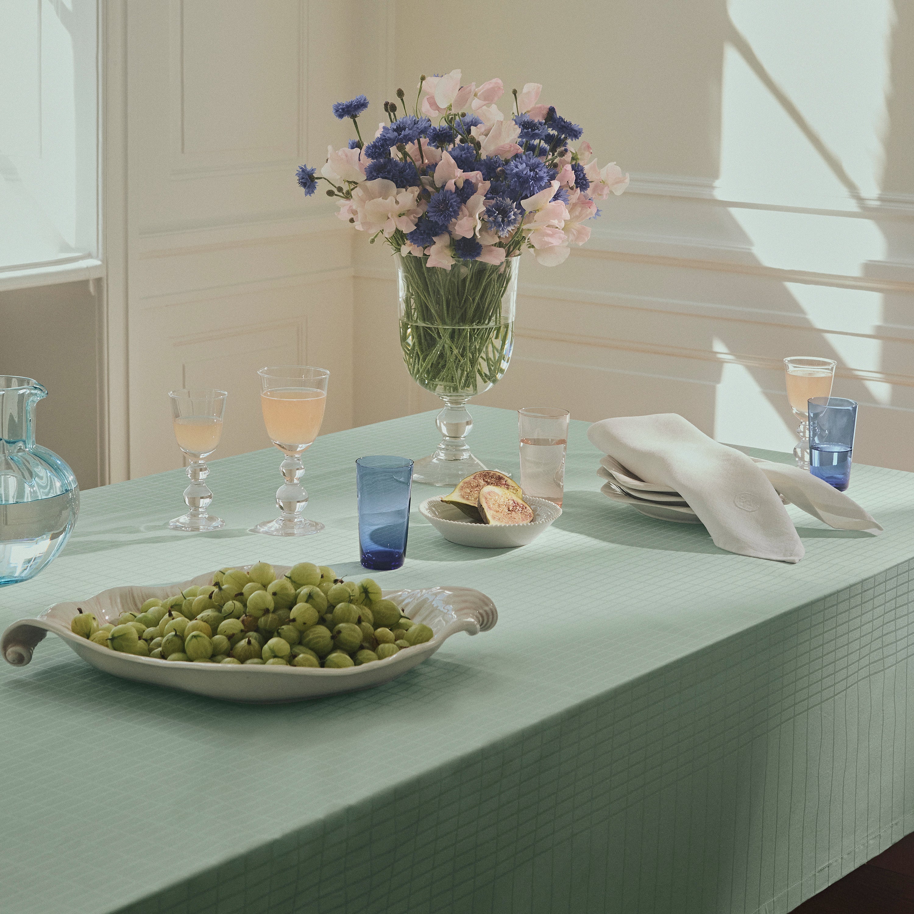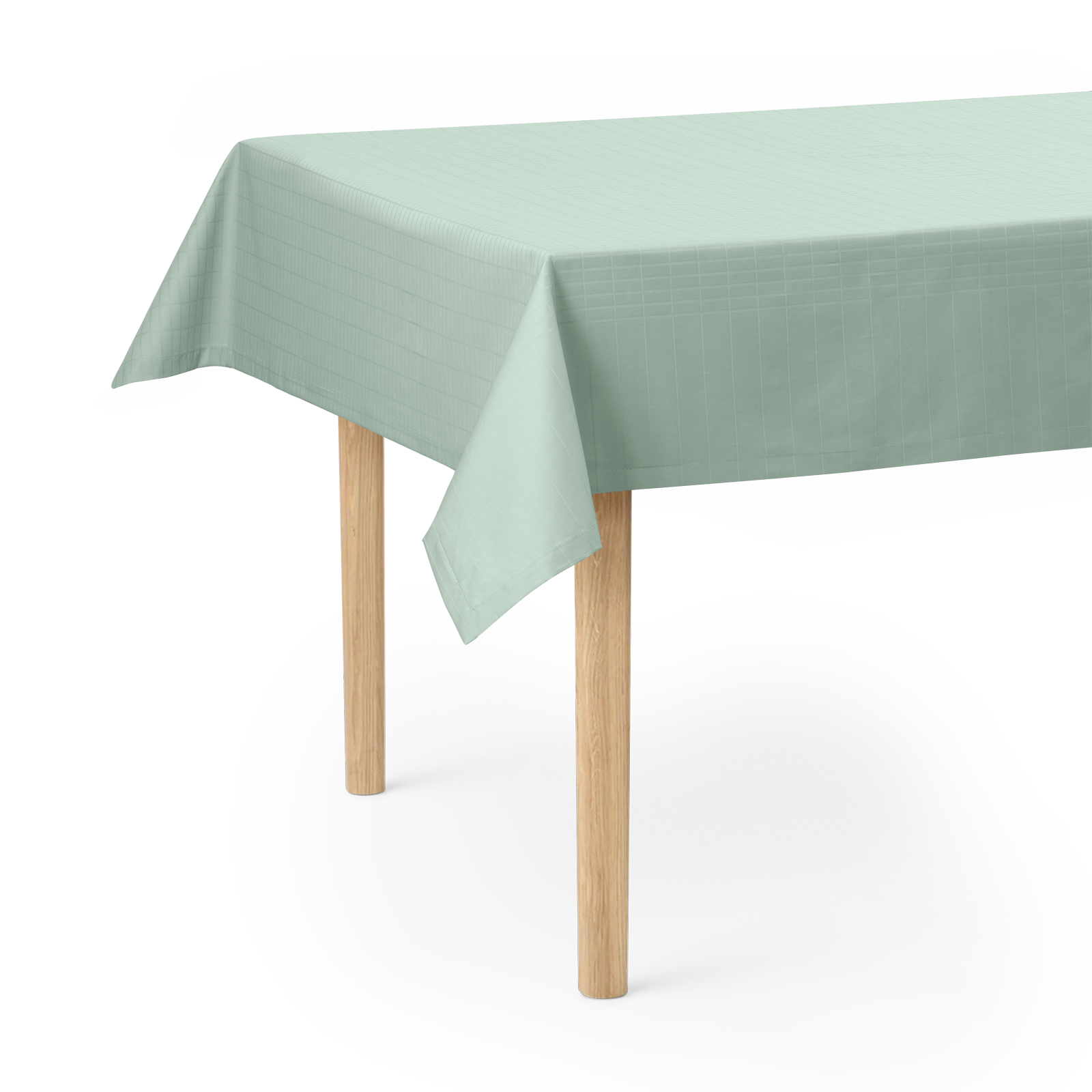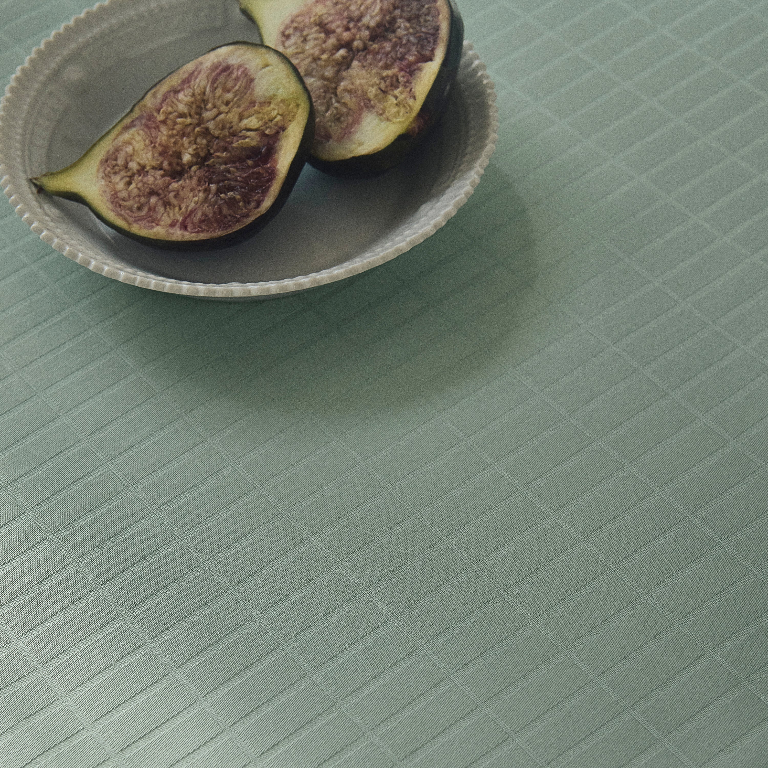 Classic Lines er en satengvevd duk i 100 % bomull med belagt overflate som gjør den vann- og smussavvisende. Duken har et enkelt uttrykk med rene tverrgående linjer som skaper et elegant mønster med rektangulære ruter på bordflaten. Den klare grønnblå fargen, Glass Green, er inspirert av fargen på råglass.