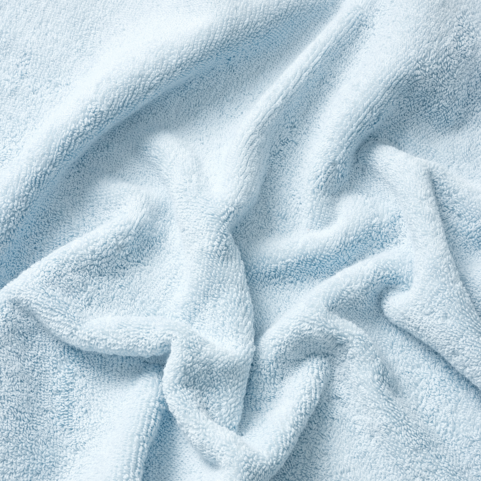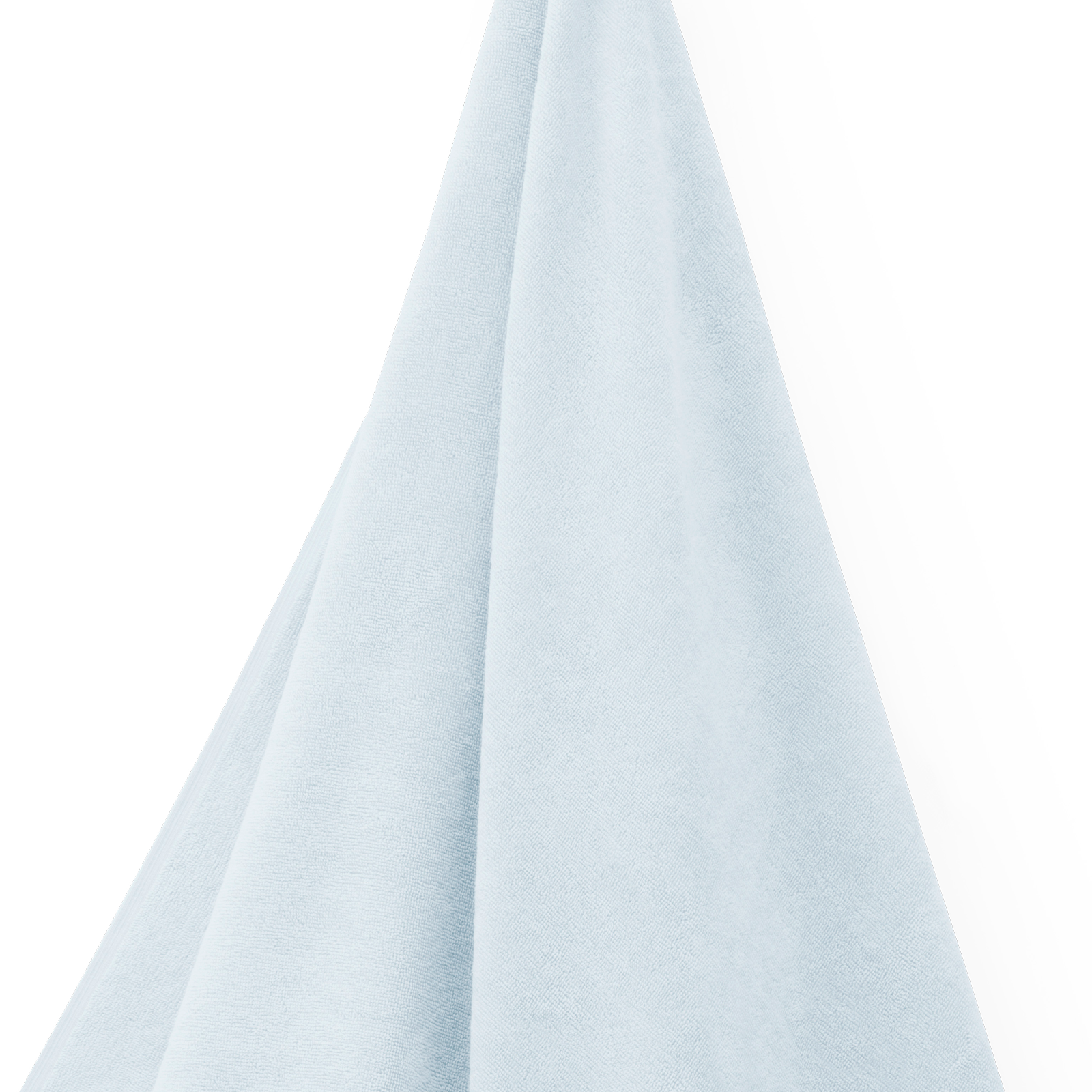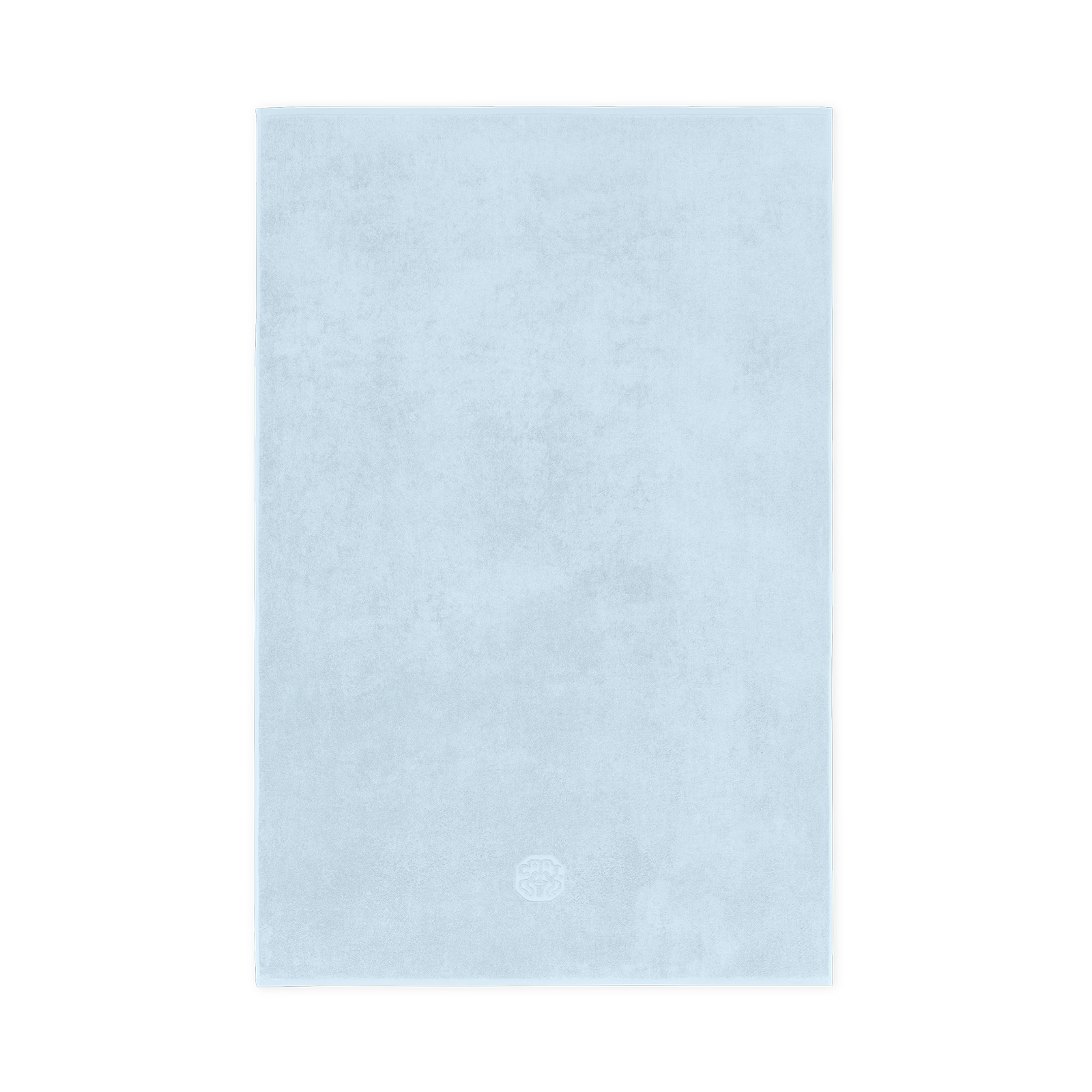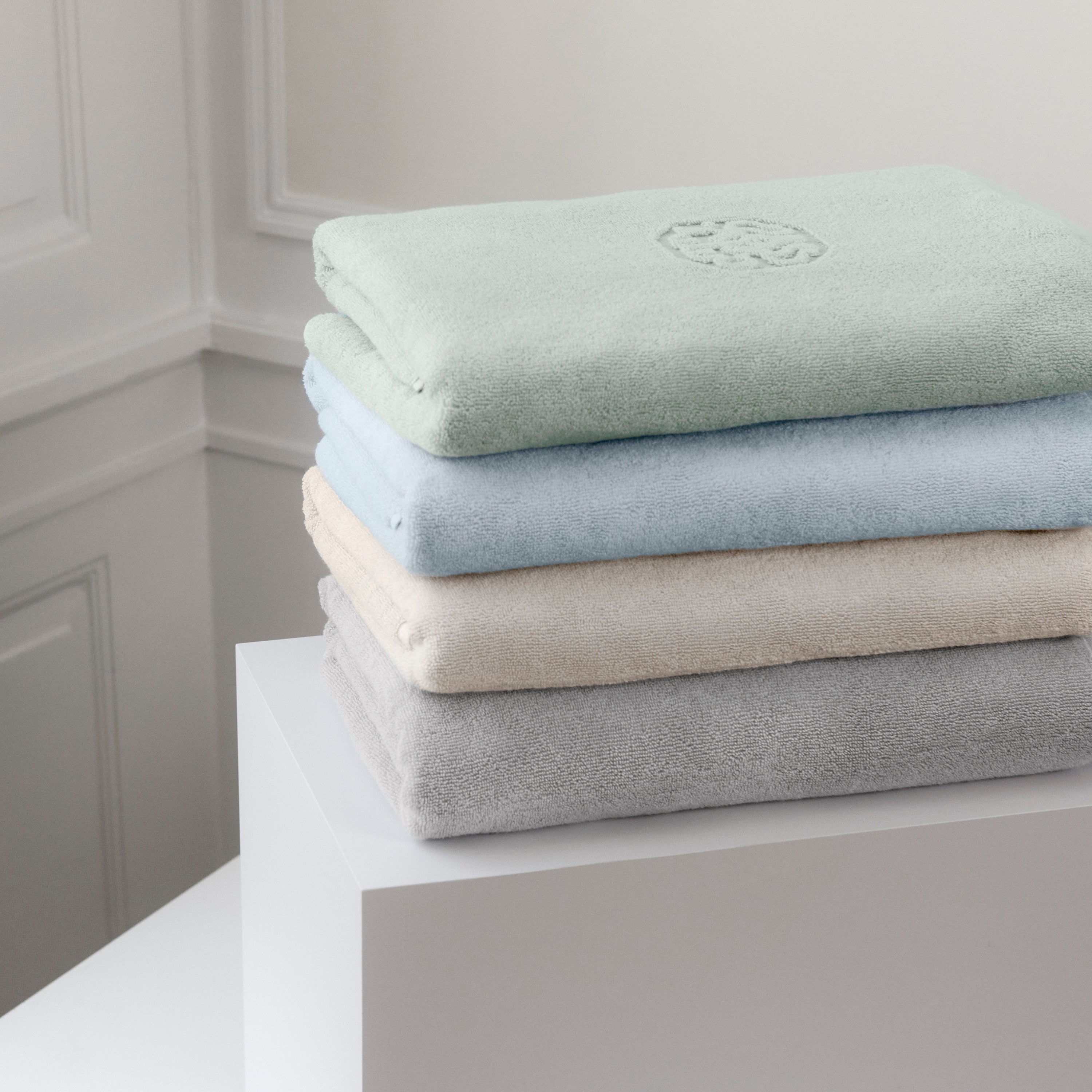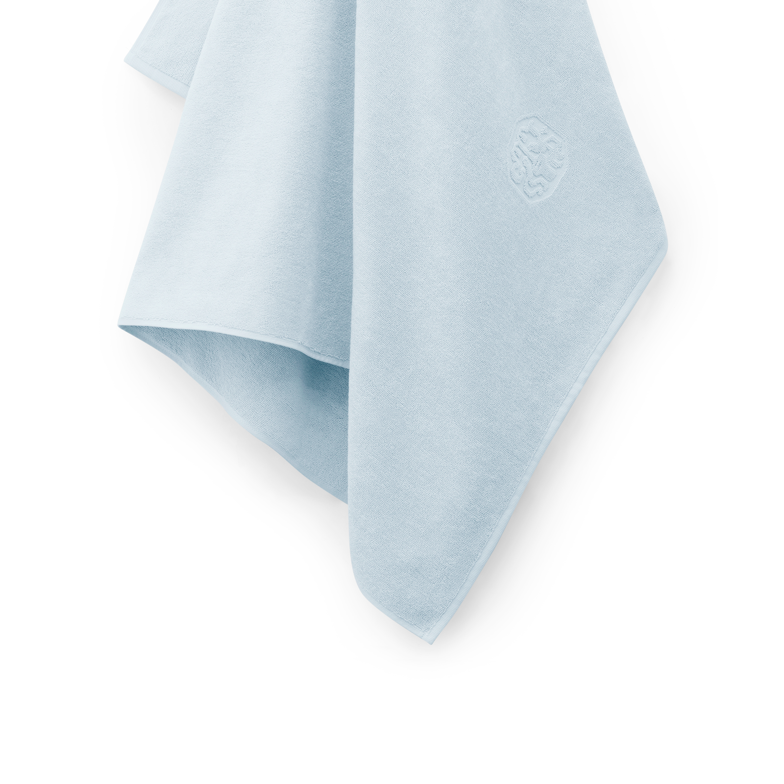 Stort og mykt Damask Terry badelaken i en lett, lyseblå farge, Minimal Blue. Som en elegant detalj er Georg Jensen Damasks ikoniske logo vevd inn.