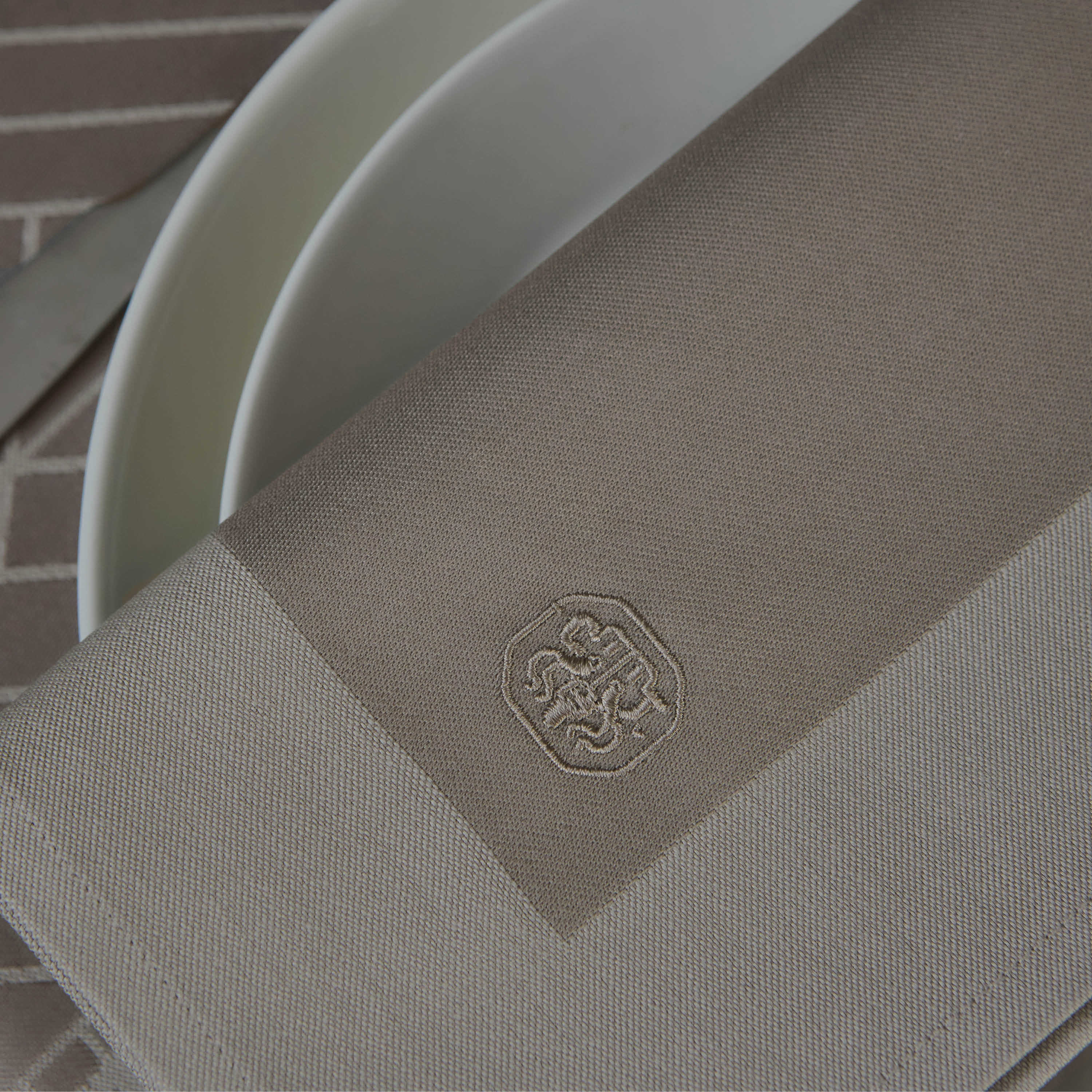 Den klassiske damaskvevde servietten er et elegant innslag på bordet. Servietten er vevd i 100 % bomull og har en fint brodert logo. Inspirert av den glatte, gråbrune barken på gamle hasseltrær har fargen på servietten fått navnet Hazel Wood.