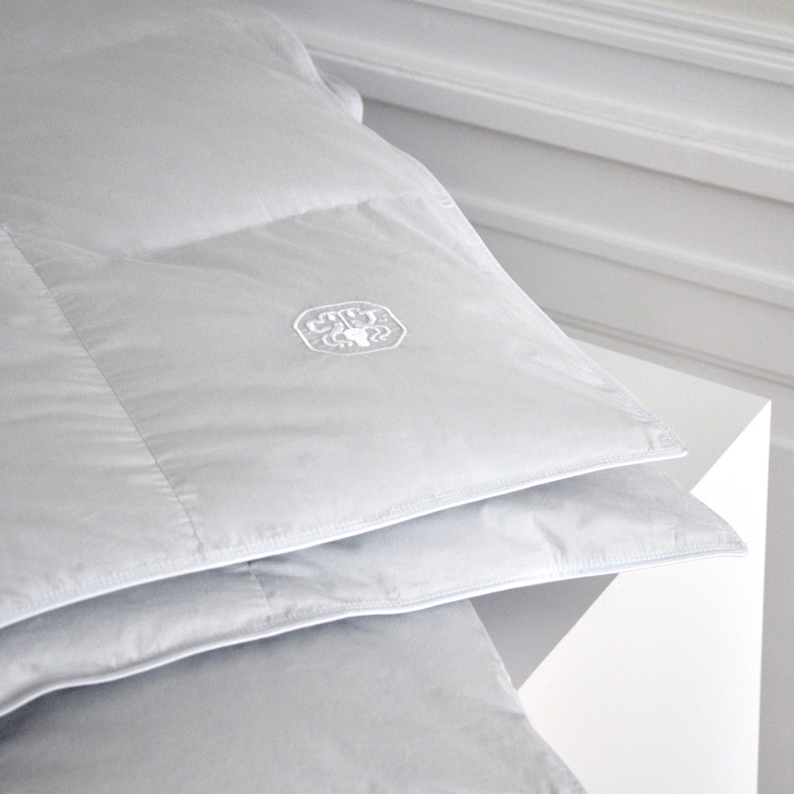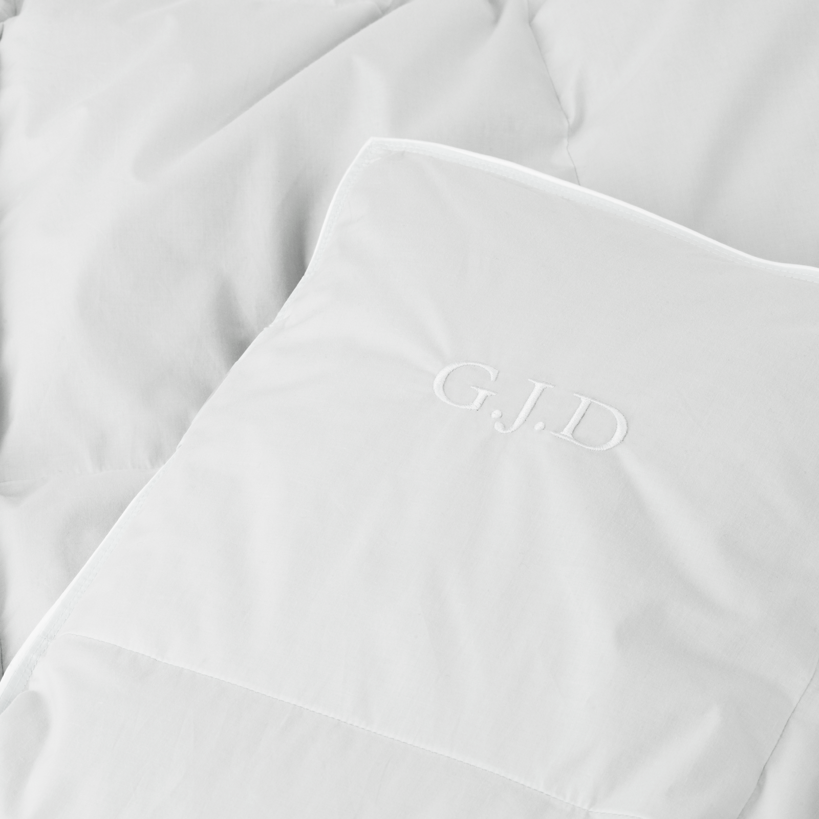 Dynen bærer Georg Jensen Damasks ikoniske logo som et diskret broderi – et symbol på kvalitet og omhyggelighet. Du kan også få brodert navn eller initialer på dynen når du bestiller den. Ring vår kundeservice på +45 75 52 27 00 eller skriv til info@georgjensen-damask.com