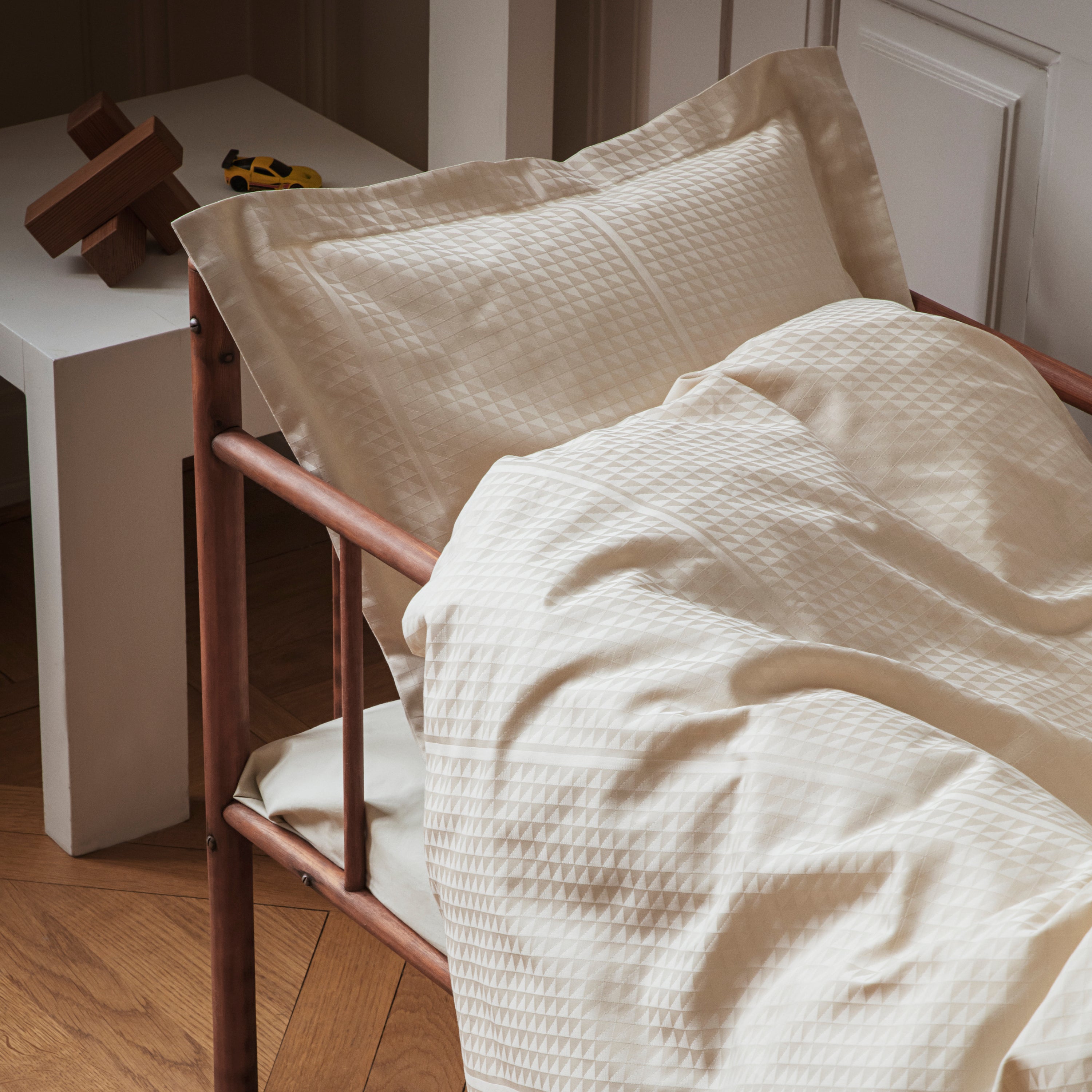 Georg Jensen Damasks Facet-sengetøy til familiens yngste har et stringent design og er damaskvevd i 100 % kammet bomull, som gir en myk og glatt overflate. Med Facet-designet bruker tekstilkunstneren Jette Nevers den klassiske damaskvevingen til å skape et elegant spill mellom lys og skygge, som fremheves vakkert i den lyse beige fargen Archive.