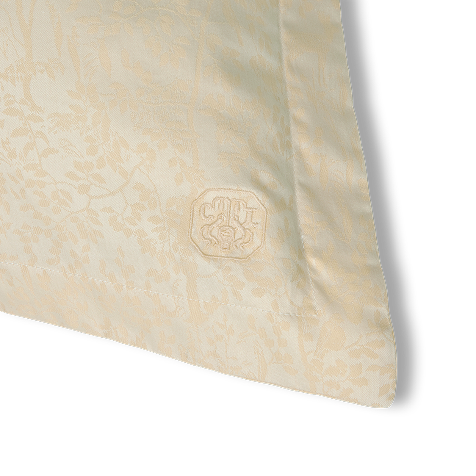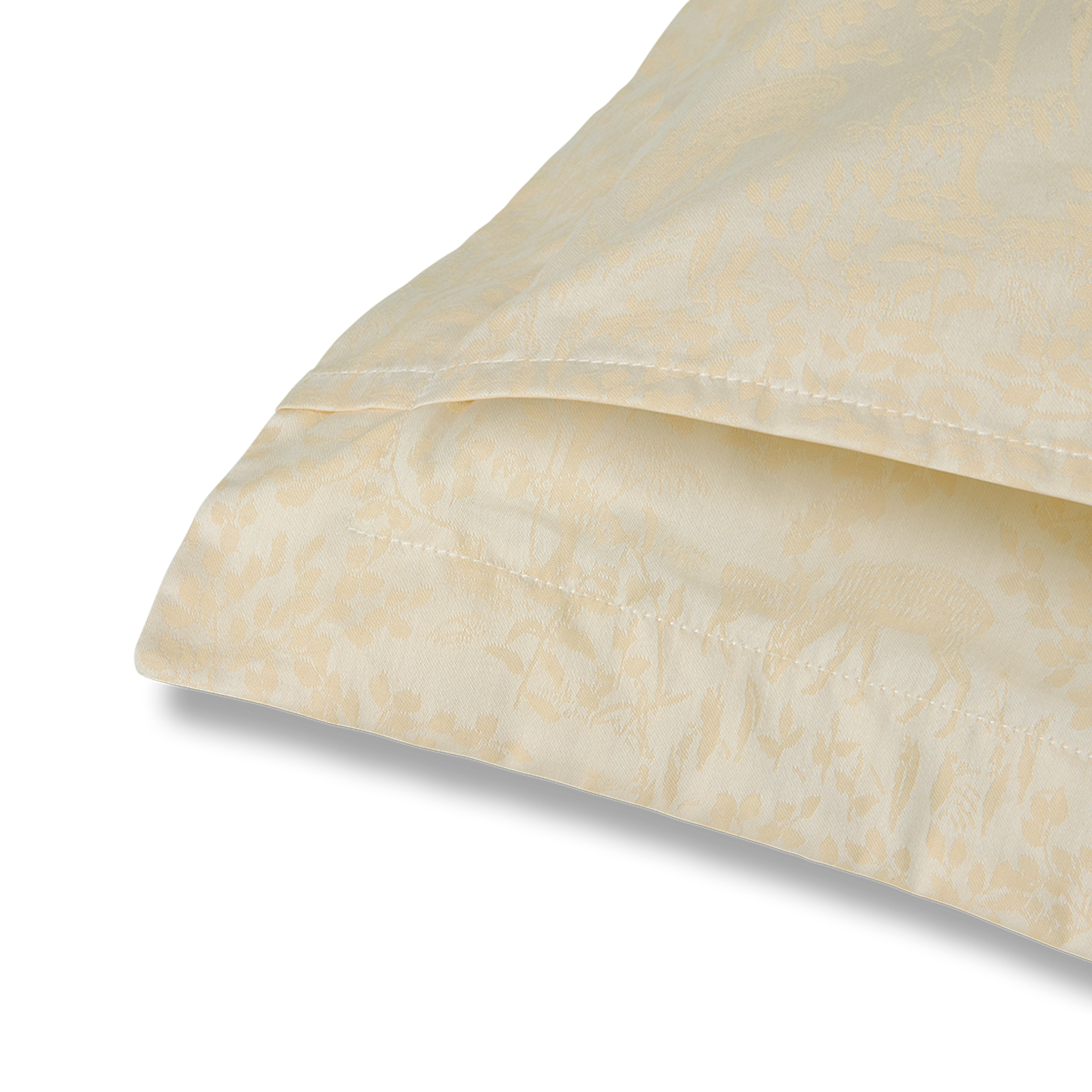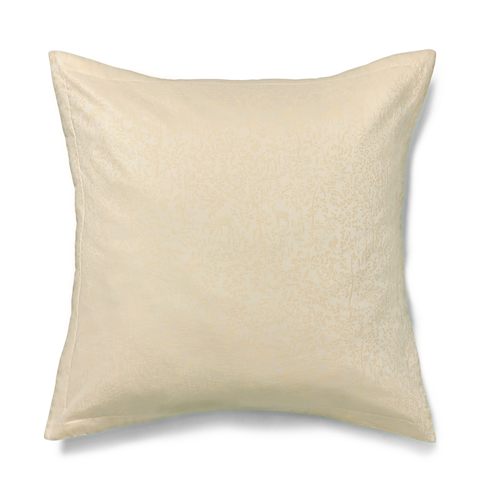 Et elegant mønster med dådyr, kaniner og fugler blant nyutsprungne trær trer vakkert frem i det jacquardvevde putetrekket Forest. Mønsteret er skapt med inspirasjon hentet fra et vakkert 1800-talls gobelin fra Georg Jensen Damasks arkiver.
