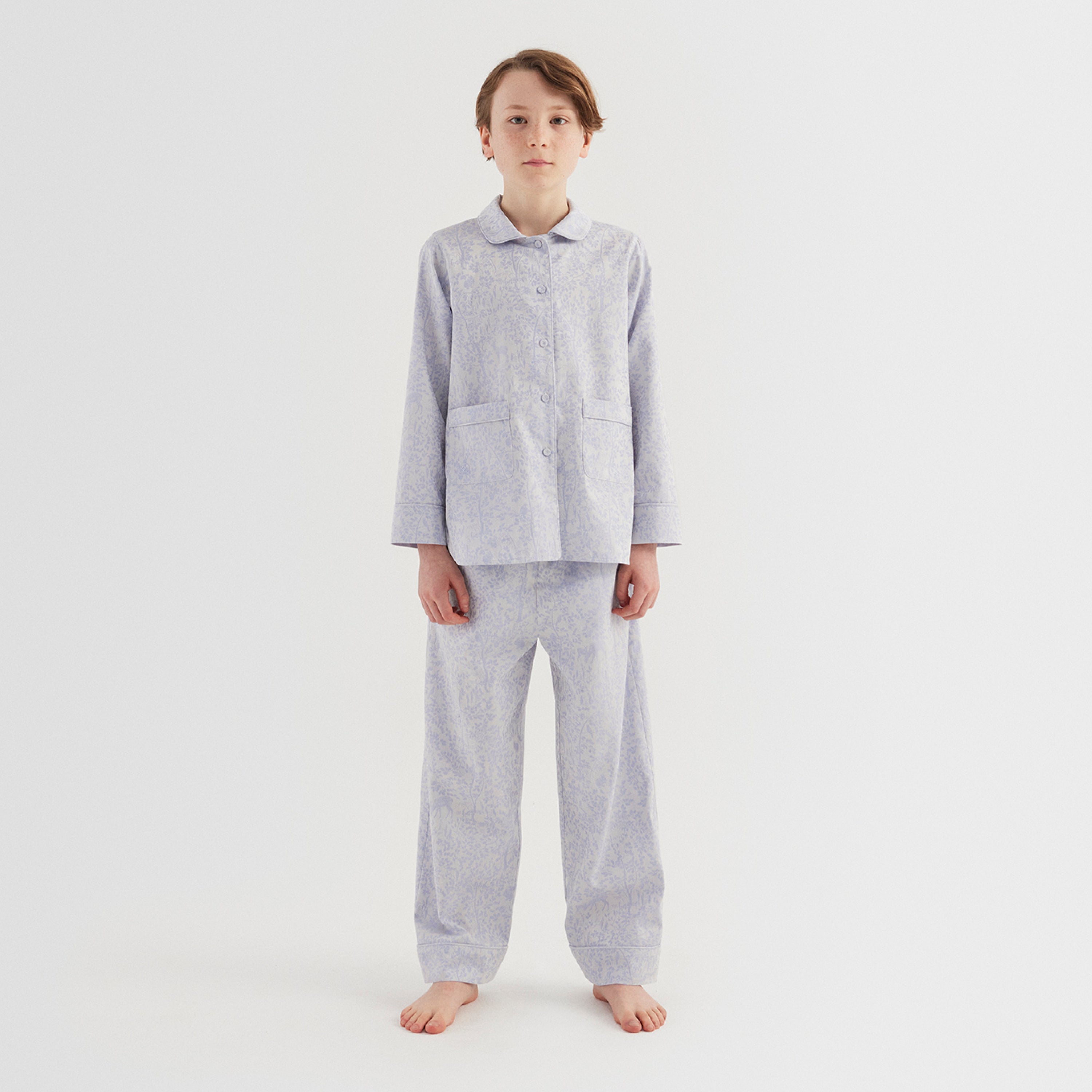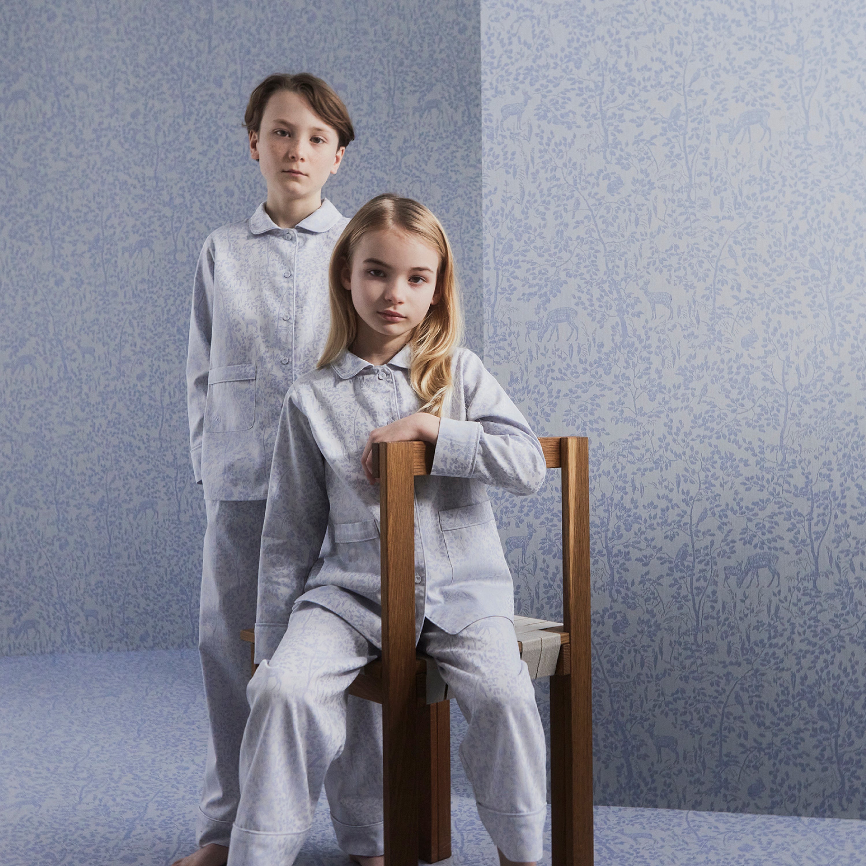 Pyjamas i fargen Clear Blue er en del av den jacquardvevde barnekolleksjonen Forest. Pyjamassettet er i økologisk bomull og har en liten Georg Jensen Damask barnelogo brodert på høyre lomme.