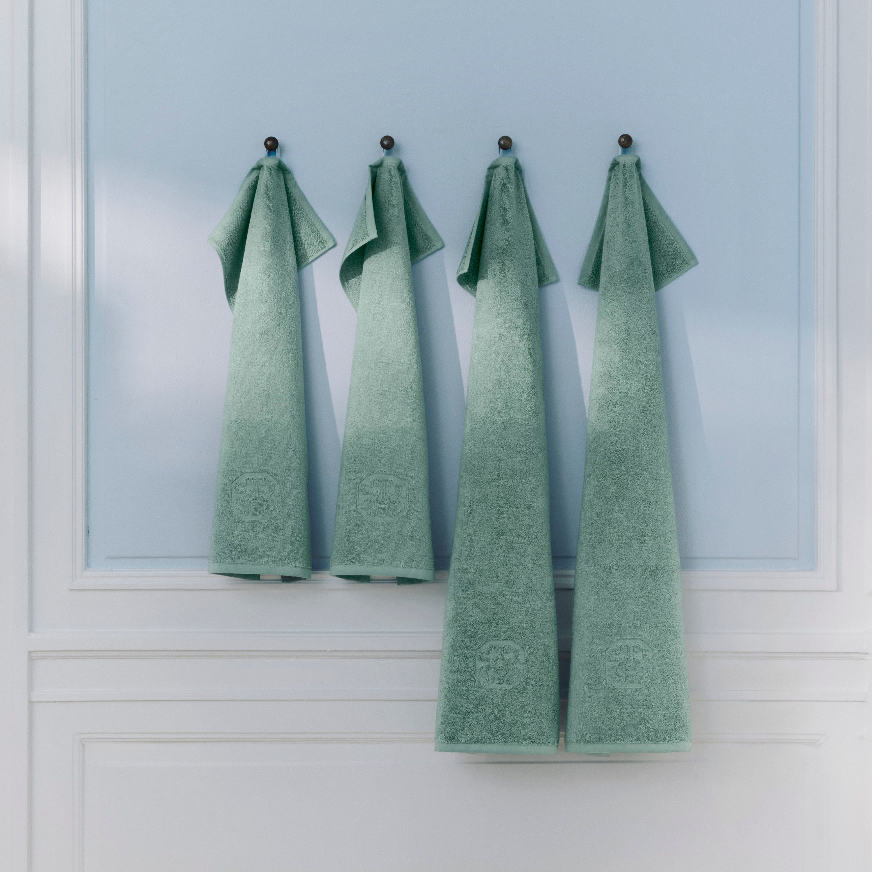 Damask Terry-gjestehåndkleet har et enkelt uttrykk med Georg Jensen Damasks ikoniske logo innvevd som en elegant detalj. Sage Green er en kjølig nyanse av grønn.