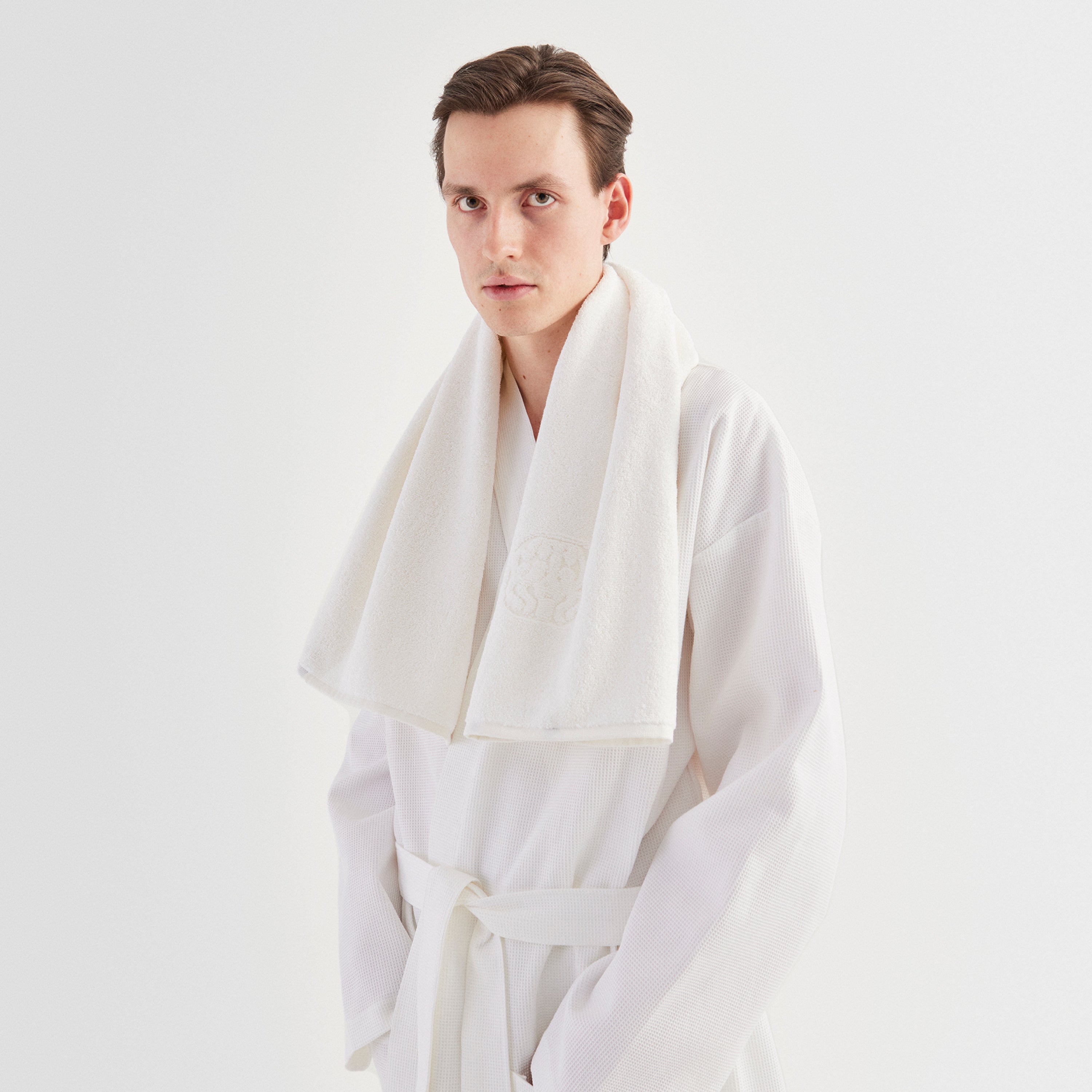 En varm utgave av den klassiske, vaffelvevde Georg Jensen Damask-kimonoen med et lett for av myk frotté som varmer og øker komforten enda mer.