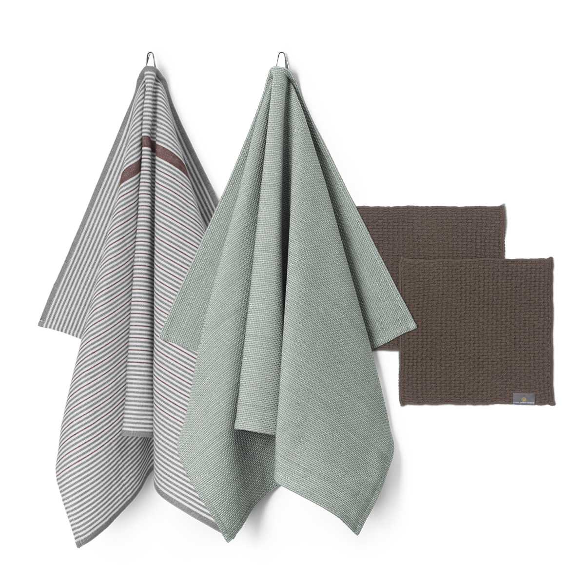 Kjøkkenpakke med 1 Comet oppvaskhåndkle og 1 1959 kjøkkenhåndkle i fargen Mineral Green, og 2 Nors kjøkkenkluter i Walnut.