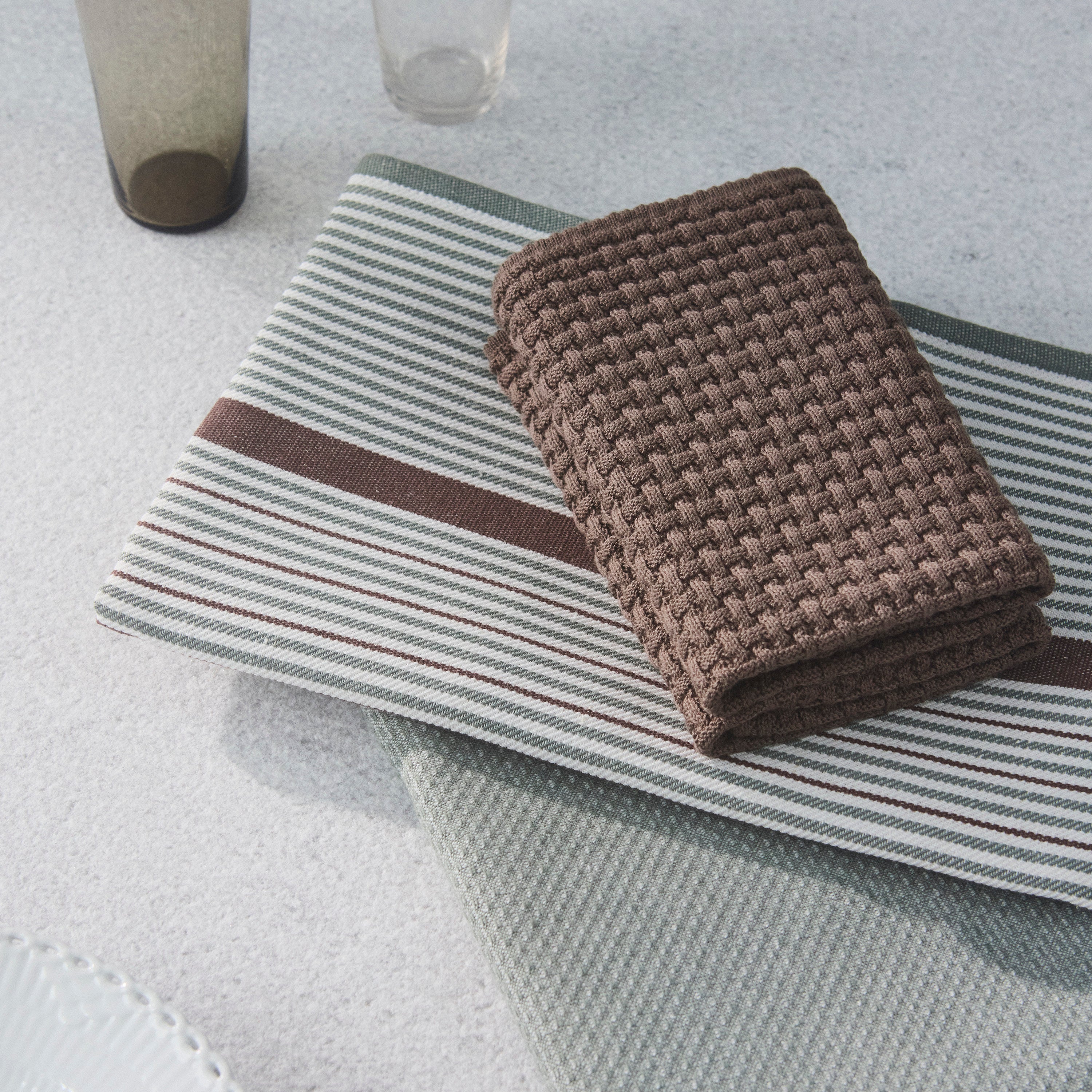 Comet oppvaskhåndkleet har smale striper og er vevd i en blanding av bomull og lin, mens 1959 kjøkkenhåndkleet har et helt enkelt uttrykk og er vevd i 100 % bomull. Den solide kvaliteten til 1959 kjøkkenhåndkleet gjør det mulig å bruke det både som håndkle og oppvaskhåndkle. Nors kjøkkenkluten er strikket i 100 % bomull, noe som gir optimal tørkeevne.