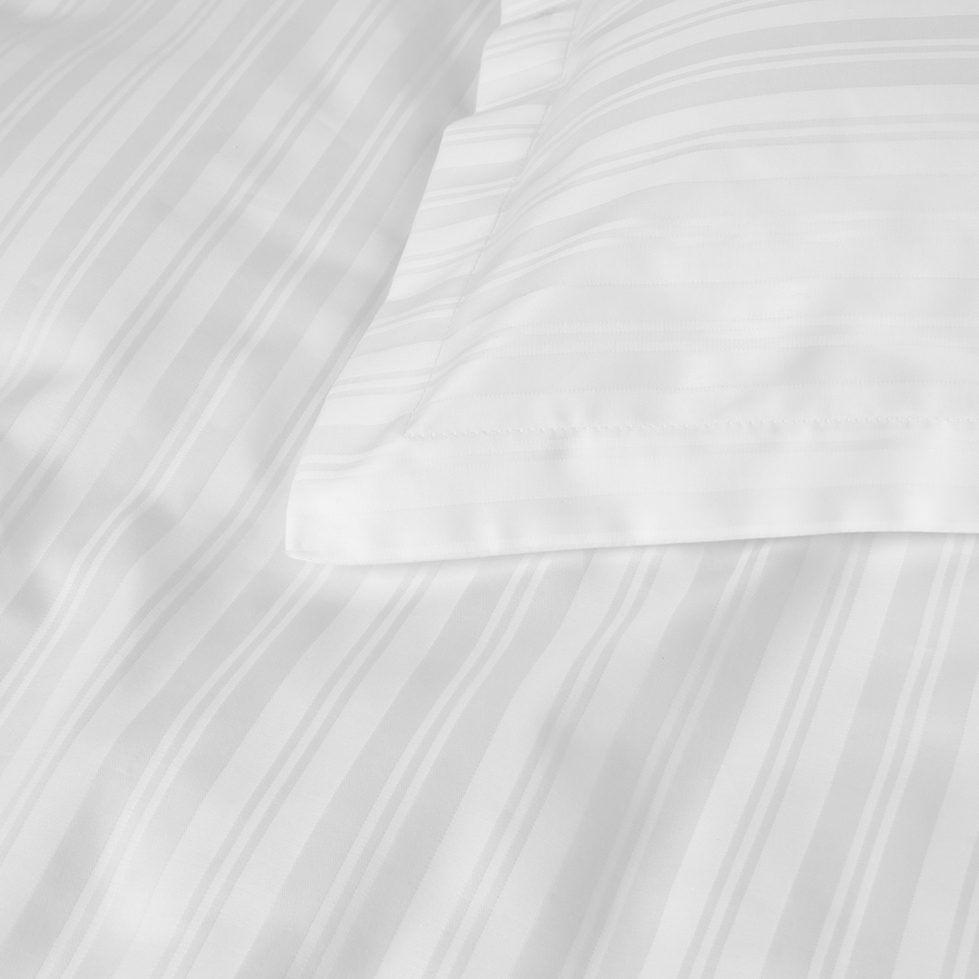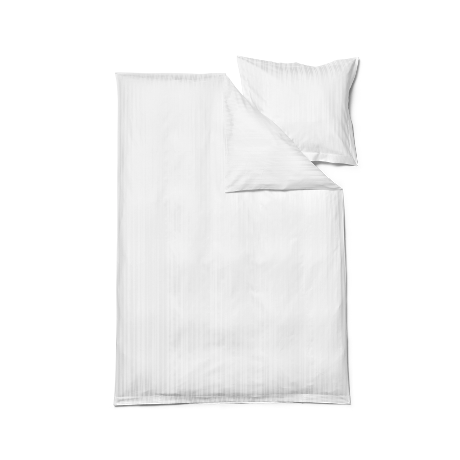 I hvitt er sengetøyet vevd i monokrom hvite på hvite striper, som med sine ulike bredder gir liv til designet.