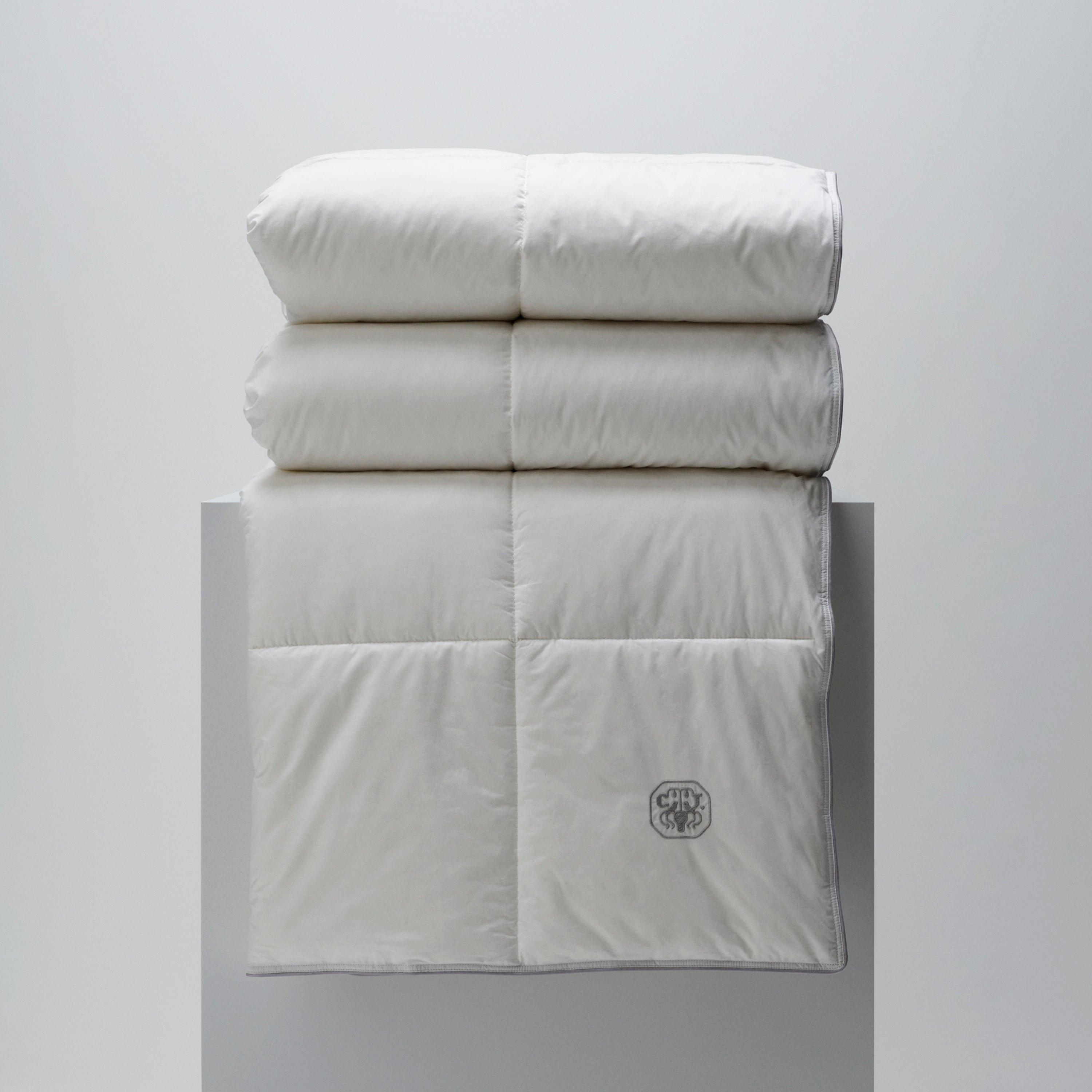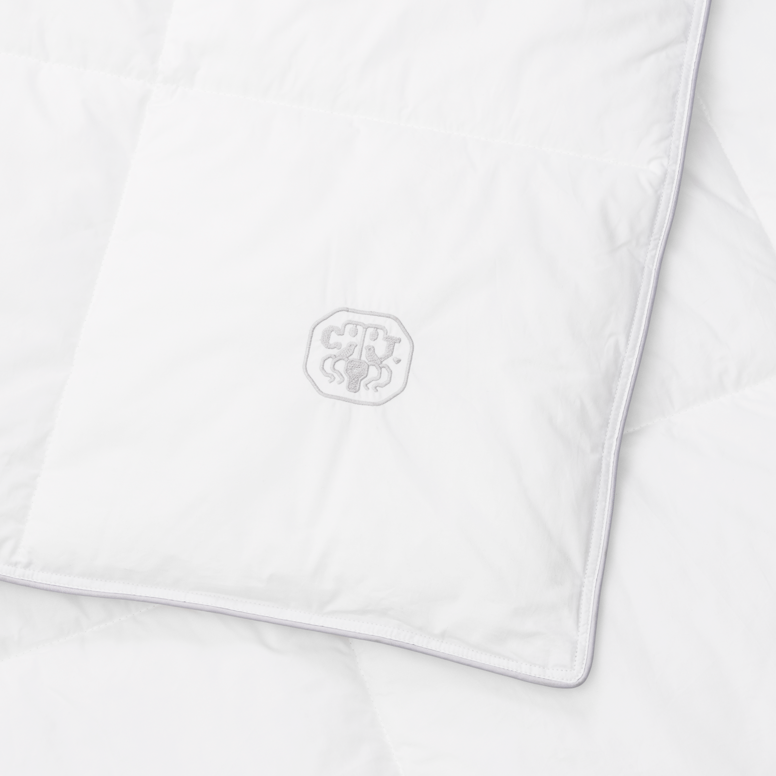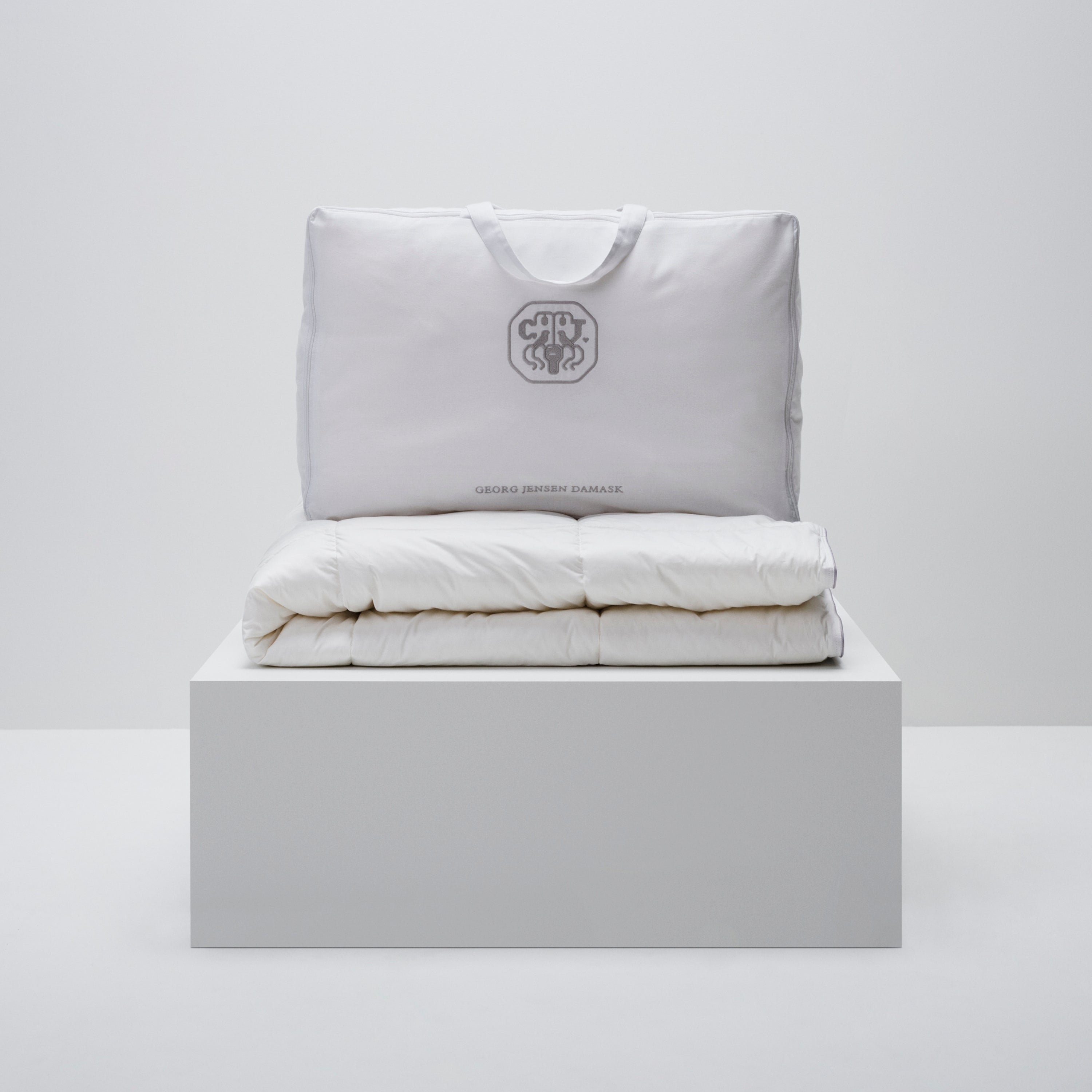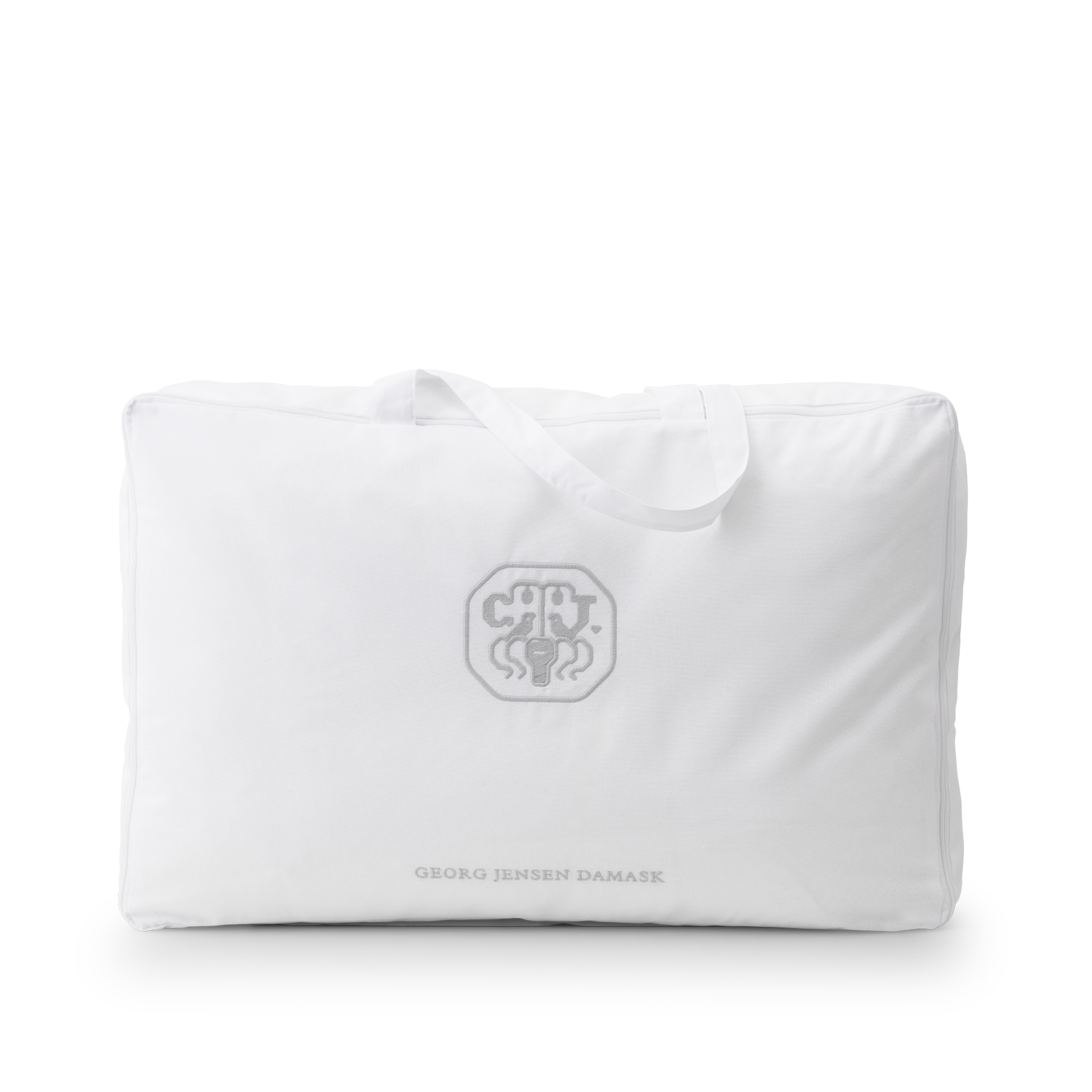 Dynen bærer Georg Jensen Damasks ikoniske logo som et diskret broderi – et symbol på kvalitet og omhyggelighet.