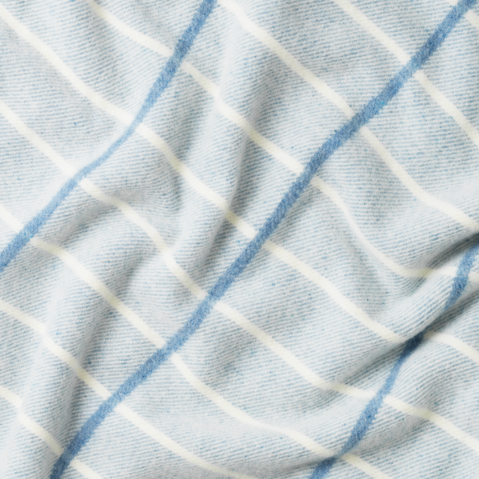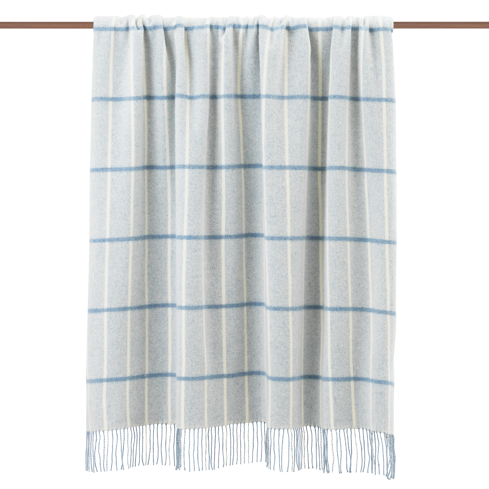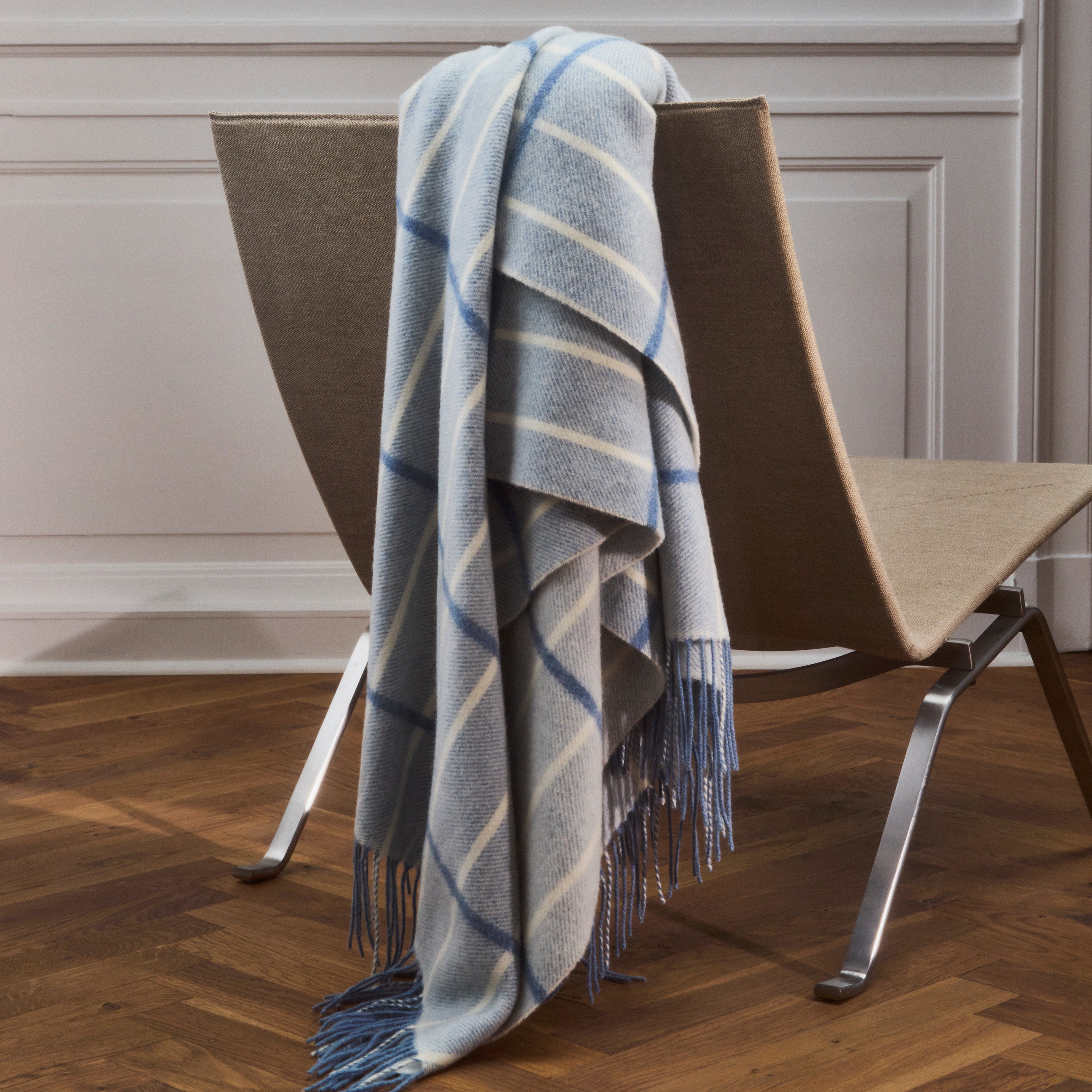Tartan-pleddet har et elegant og klassisk rutemønster. Kombinasjonen av 90 % merinoull og 10 % kasjmir gjør pleddet ekstra mykt, og ullens fine struktur tilfører en spesiell letthet. Det er vevd i blå og hvite nyanser og avsluttet med frynser øverst og nederst.