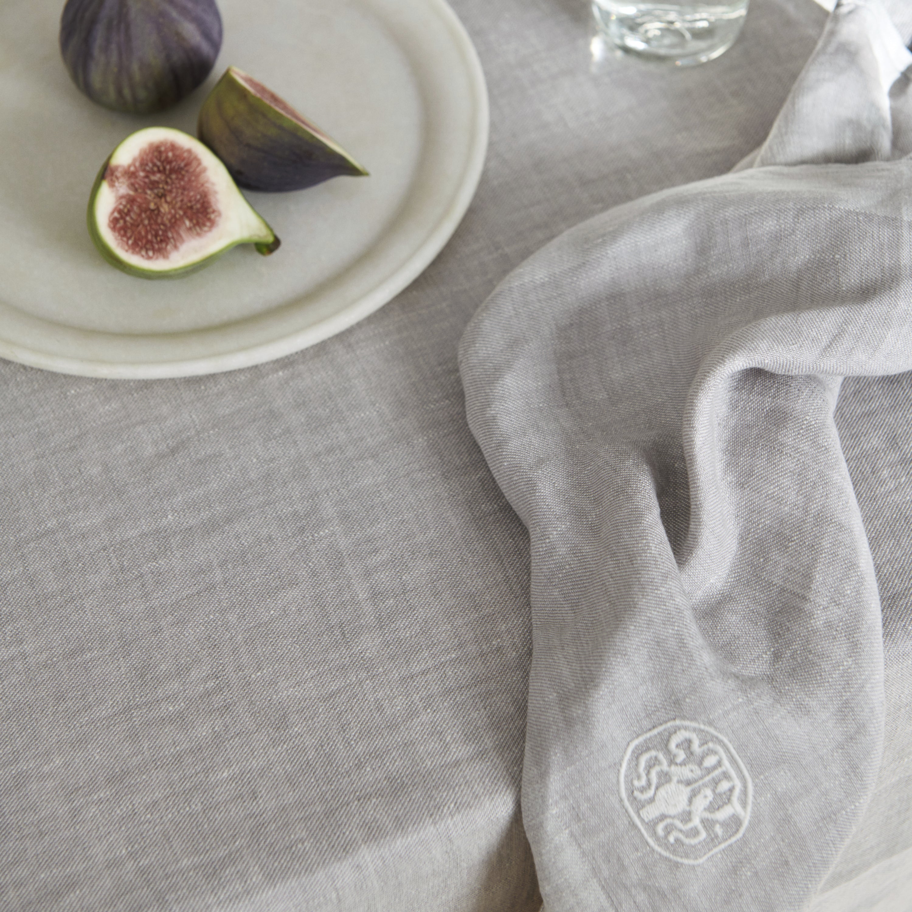 Fargemessig passer linservietten til Plain-duken i grå.