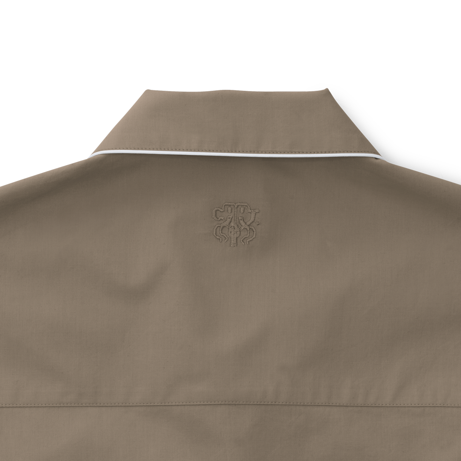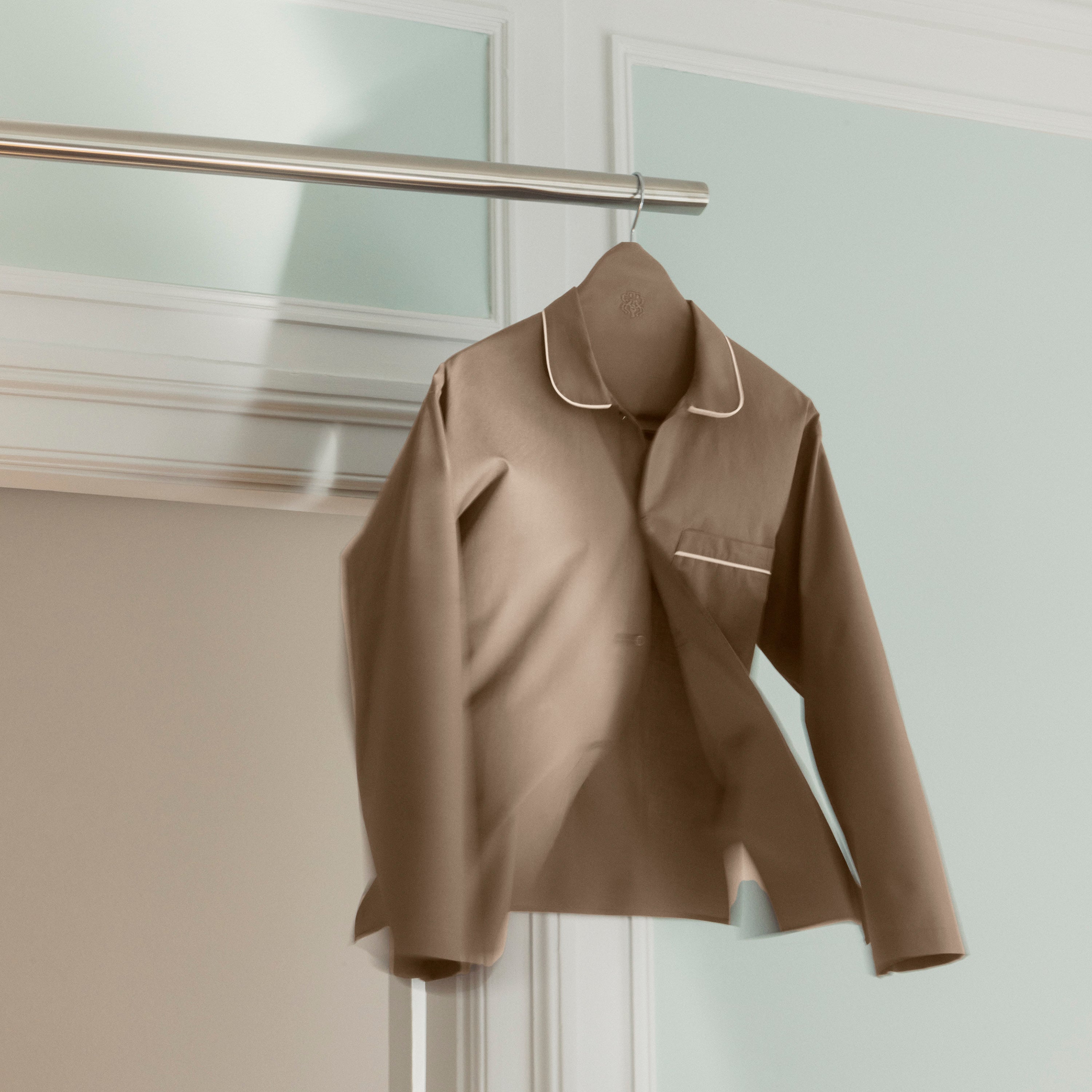 Skjorten har sidesplitter, brystlomme, avrundet krage og Georg Jensen Damasks ikoniske logo brodert på bærestykket i nakken. Buksene har bred og behagelig elastikk i livet, lommer og snøring. Buks- og ermelengde kan enkelt justeres med en oppbrett, hvor innsiden har elegant piping.